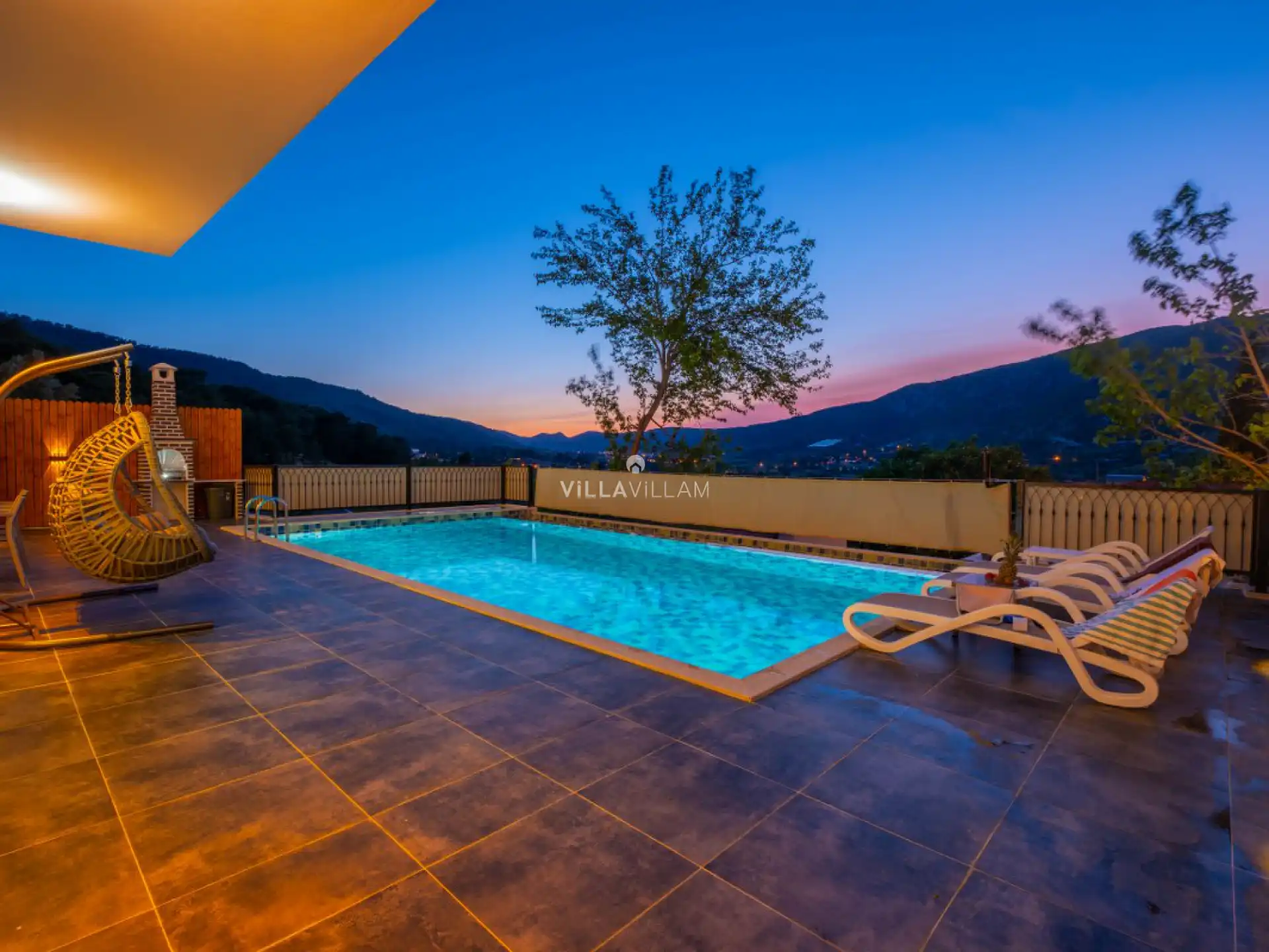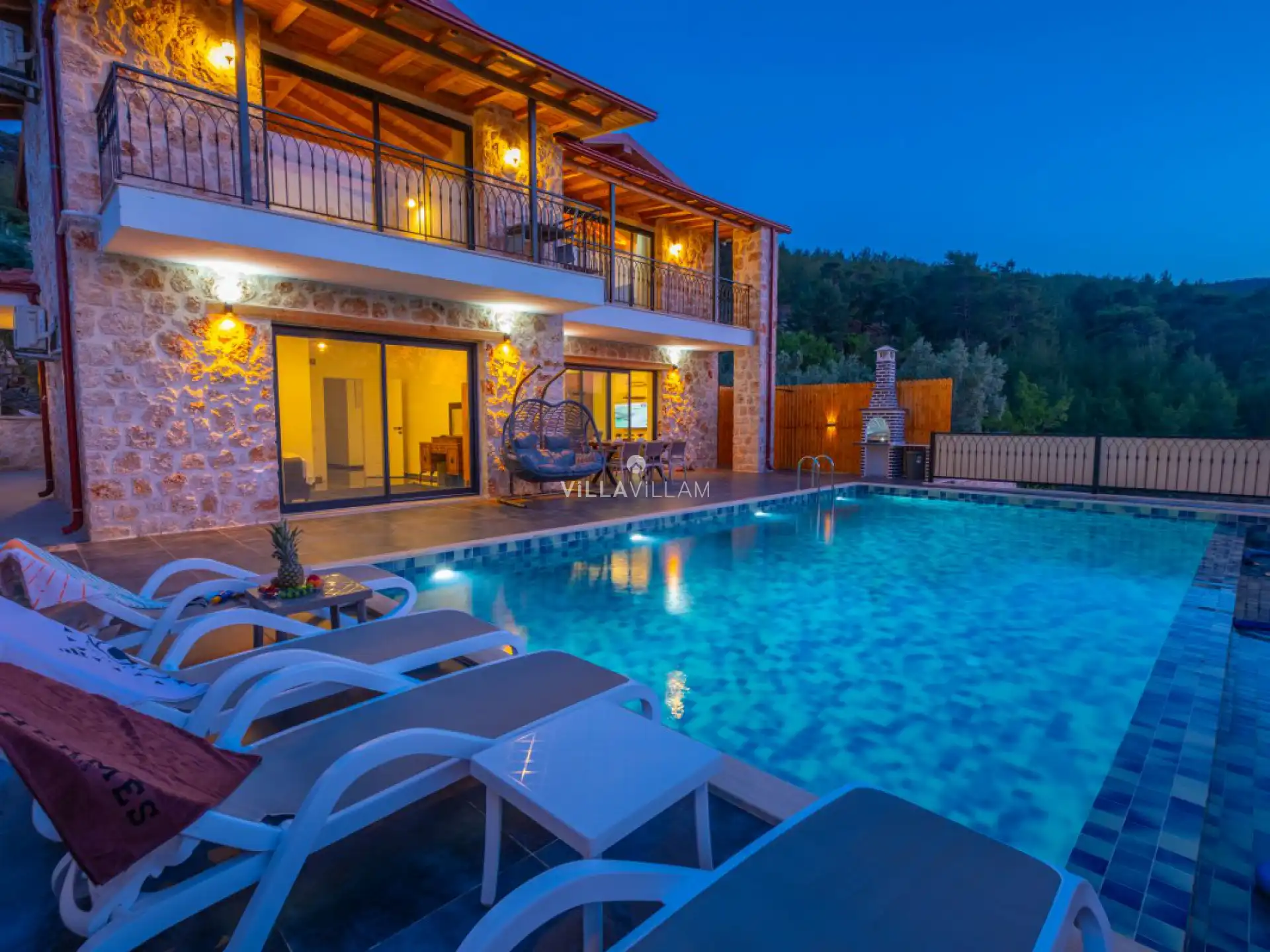 Panoramik doğa manzaralı, yeşilliklerin arasında bulunan villanın havuz terasında şezlong takımı, oturma grubu, salıncak ve barbekü bulunmaktadır. Korunaklı havuz alanına açılan konforlu oturma odası, tam donanımlı açık mutfağı bulunan villanın birinci yatak odasında çift kişilik yatak, jakuzi ve banyo; ikinci yatak odasında çift kişilik yatak ve banyo; üçüncü yatak odasında çift kişilik yatak ve banyo bulunmaktadır. Aile ve arkadaş grupları için ideal seçenekler arasında yer alan villa renkli iç dizayn ile dikkat çekmektedir.