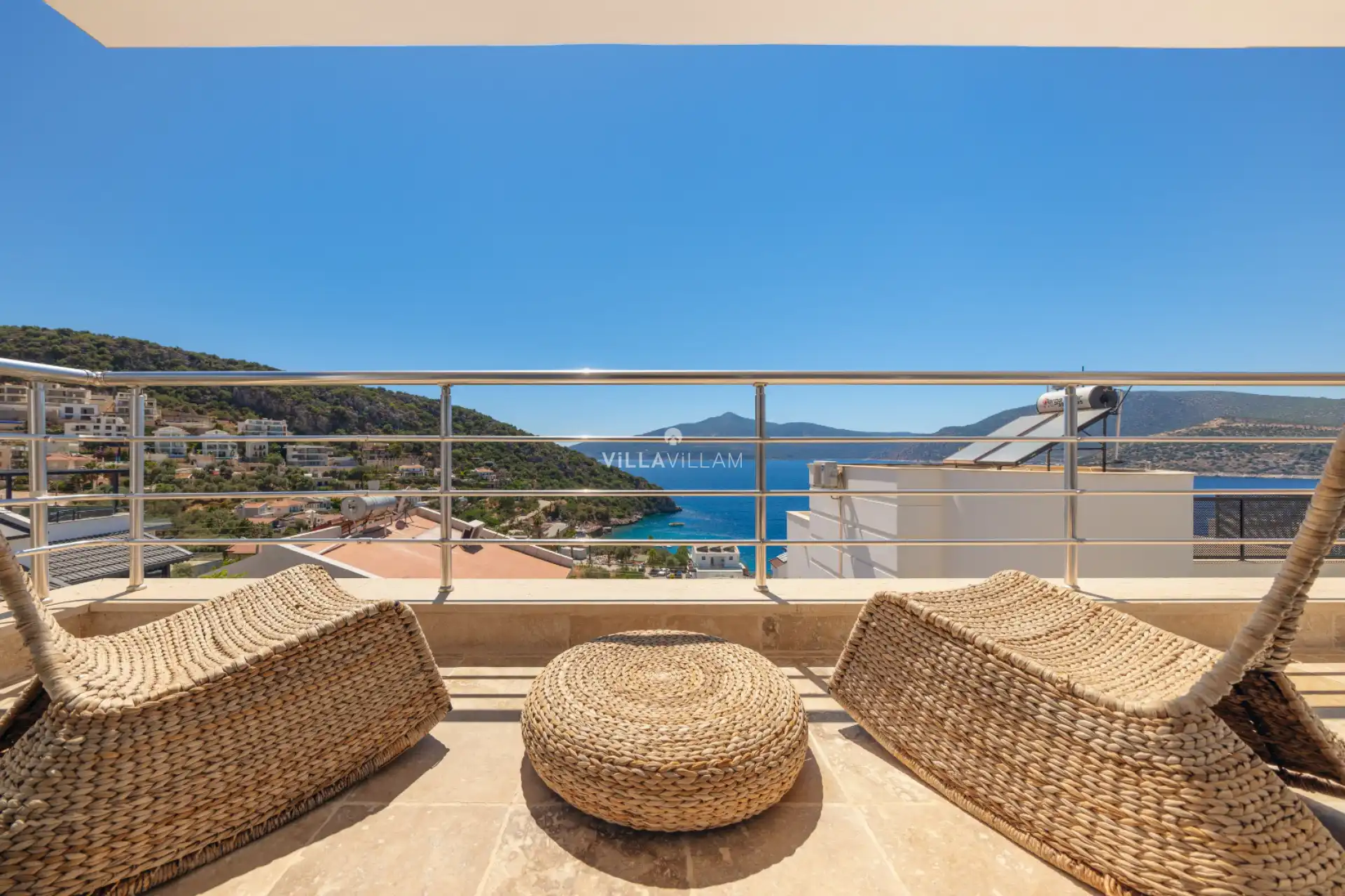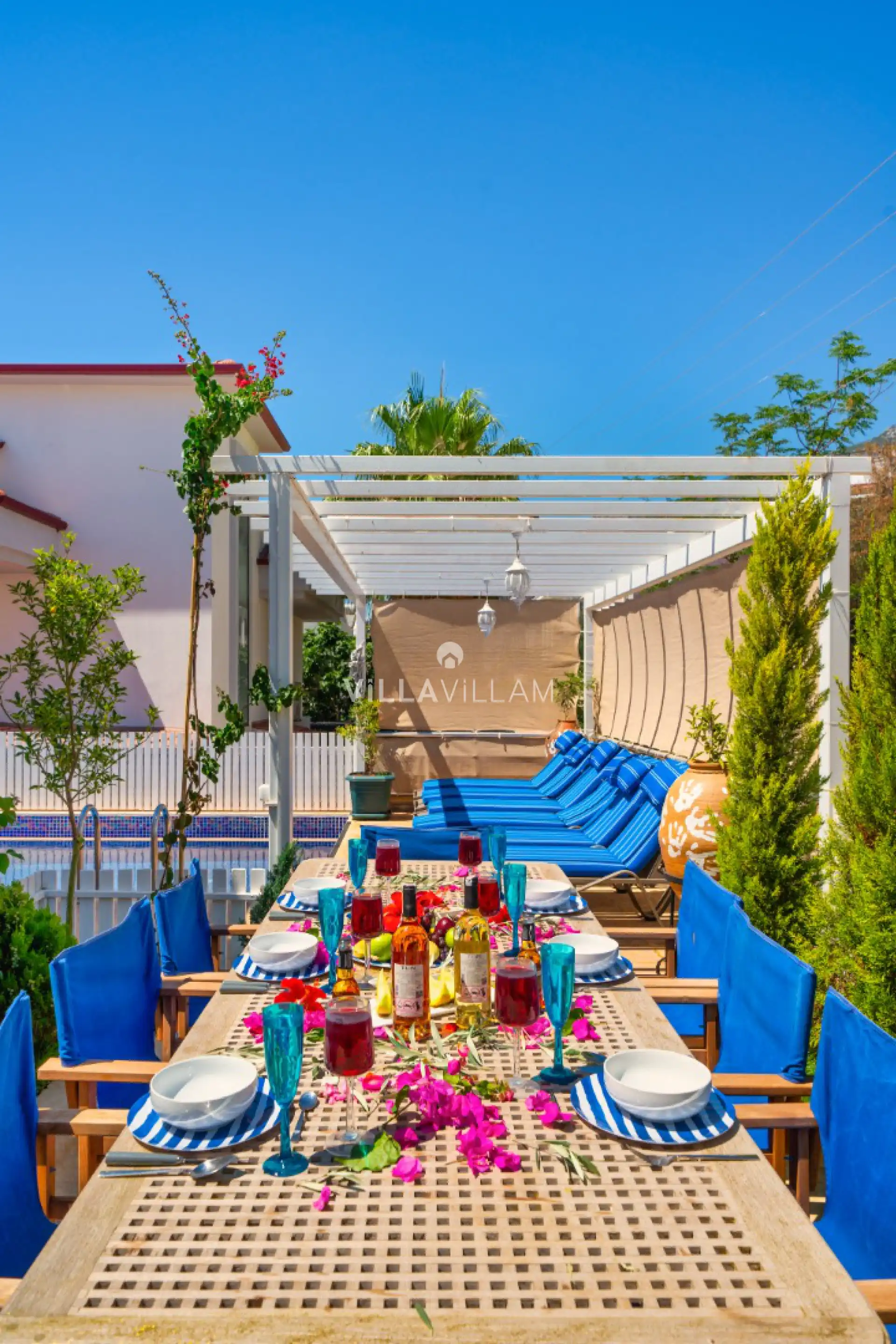 Muhteşem manzaraya karşı, güneşlenip yüzübileceğiniz havuz terasında kapasiteye uygun şezlong takımı, konforlu oturma grubu ve barbekü alanı bulunan villanın havuzu, muhafazakarlığı güçlendirilmiş özelliklidir. Yine havuz terasına açılan konforlu oturma odası ve tam donanımlı açık mutfağı; üç yatak odasında çift kişilik yatak ve ebeveyn banyosu, bir yatak odasında da iki tek kişilik yatak ve ebeveyn banyosu bulunmaktadır. Oda teraslarından muhteşem deniz manzarasına hakim olabileceğiniz, ayrıcalıklı bir tatilin keyfini sürebileceksiniz.