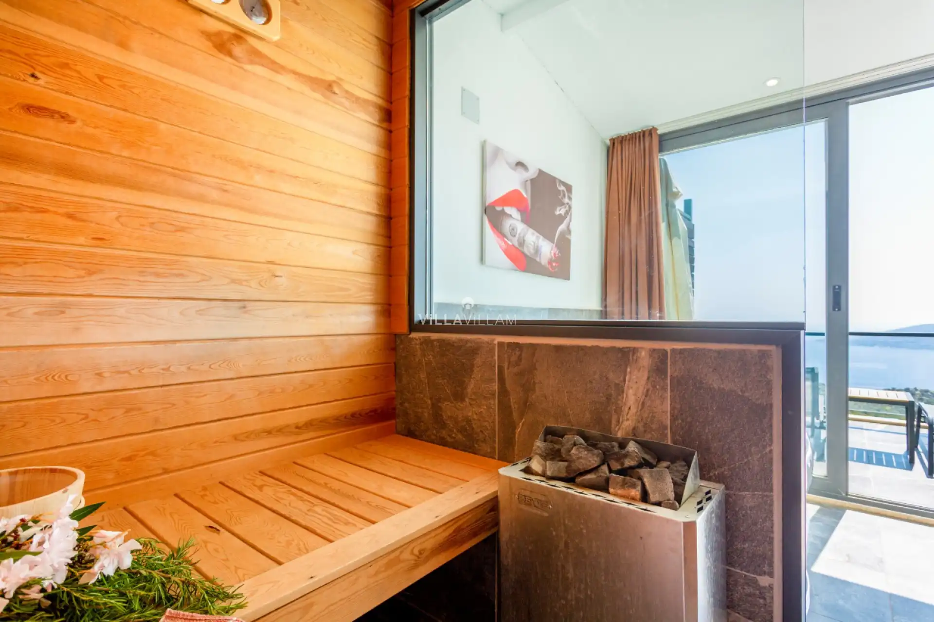 Villanın doğa içinde konumu sayesinde oksijene doyabileceğiniz, sakin bir tatil sizleri beklemektedir. Havuz terasında kapasiteye uygun şezlong takımı, oturma grubu, barbekü alanı bulunmaktadır. Sevdiklerinizle keyifli bir zaman geçirebilmeniz için her detayın düşünüldüğü villa; masa tenisi ve langırt oyun alanları ile keyifli bir tatil imkanı sunmkatadır. Yine havuz terasına açılan konforlu oturma odası ve donanımlı açık mutfağı bulunan villanın bir yatak odasında çift kişilik yatak, ebeveyn banyosu ve jakuzi; ikinci yatak odasında da iki tek kişilik yatak, ebeveyn banyosu bulunmaktadır. Siz değerli misafirlerimizin maksimum konfor ve donanımda eşsiz bir tatil fırsatı yakalayacağı villamızda hamam ve sauna da yer almaktadır. Yılın yorgunluğunu ve stresinden tam anlamıyla arınabileceğiniz bir tatil deneyimi sunacak olan villa; sauna ve hamamıyla birlikte tatilinde konforundan ödün vermeyen misafirlerimizin premium tercihleri arasında yer almaktadır.