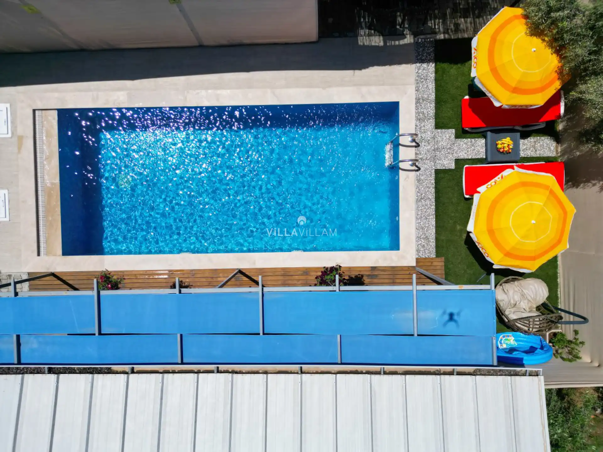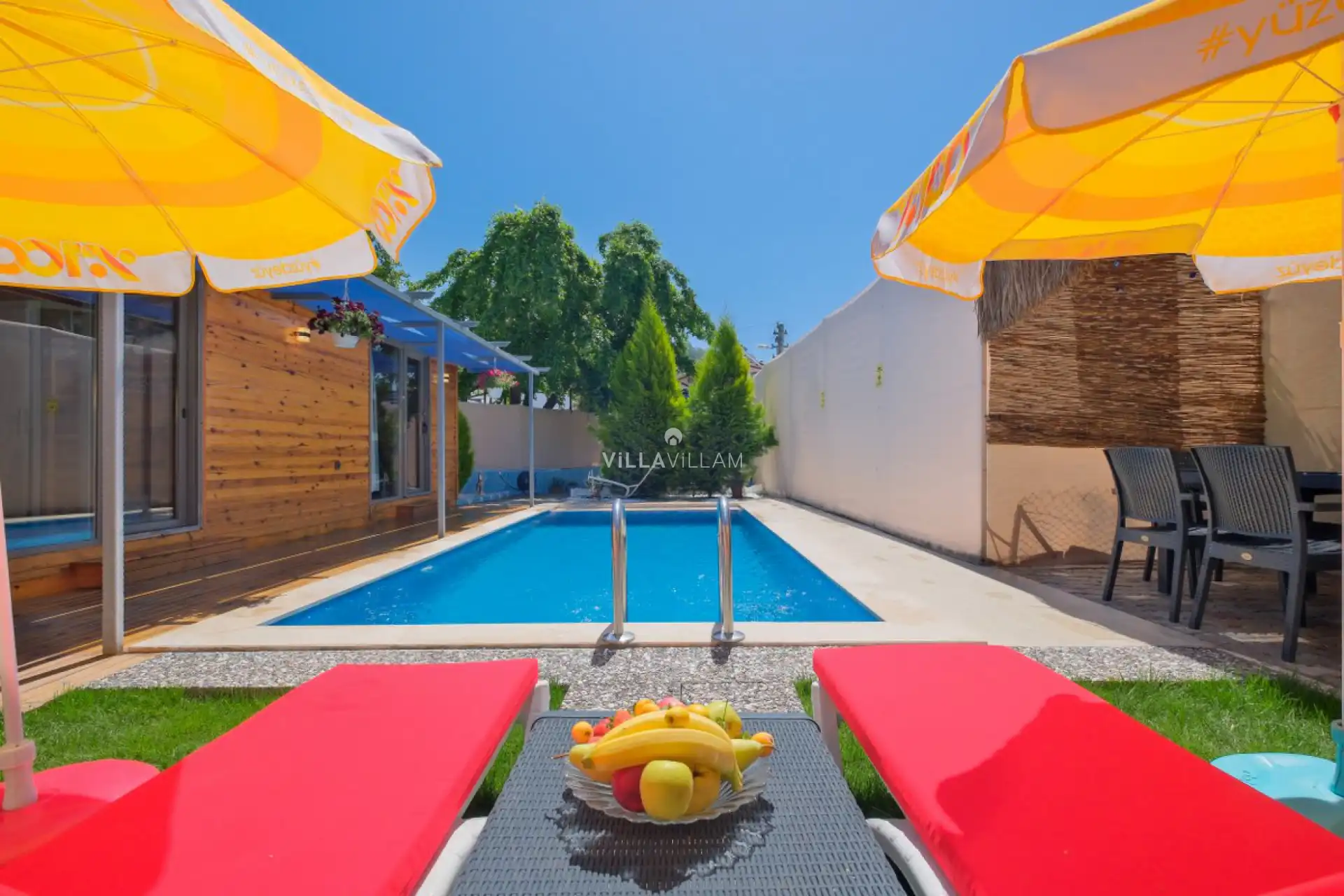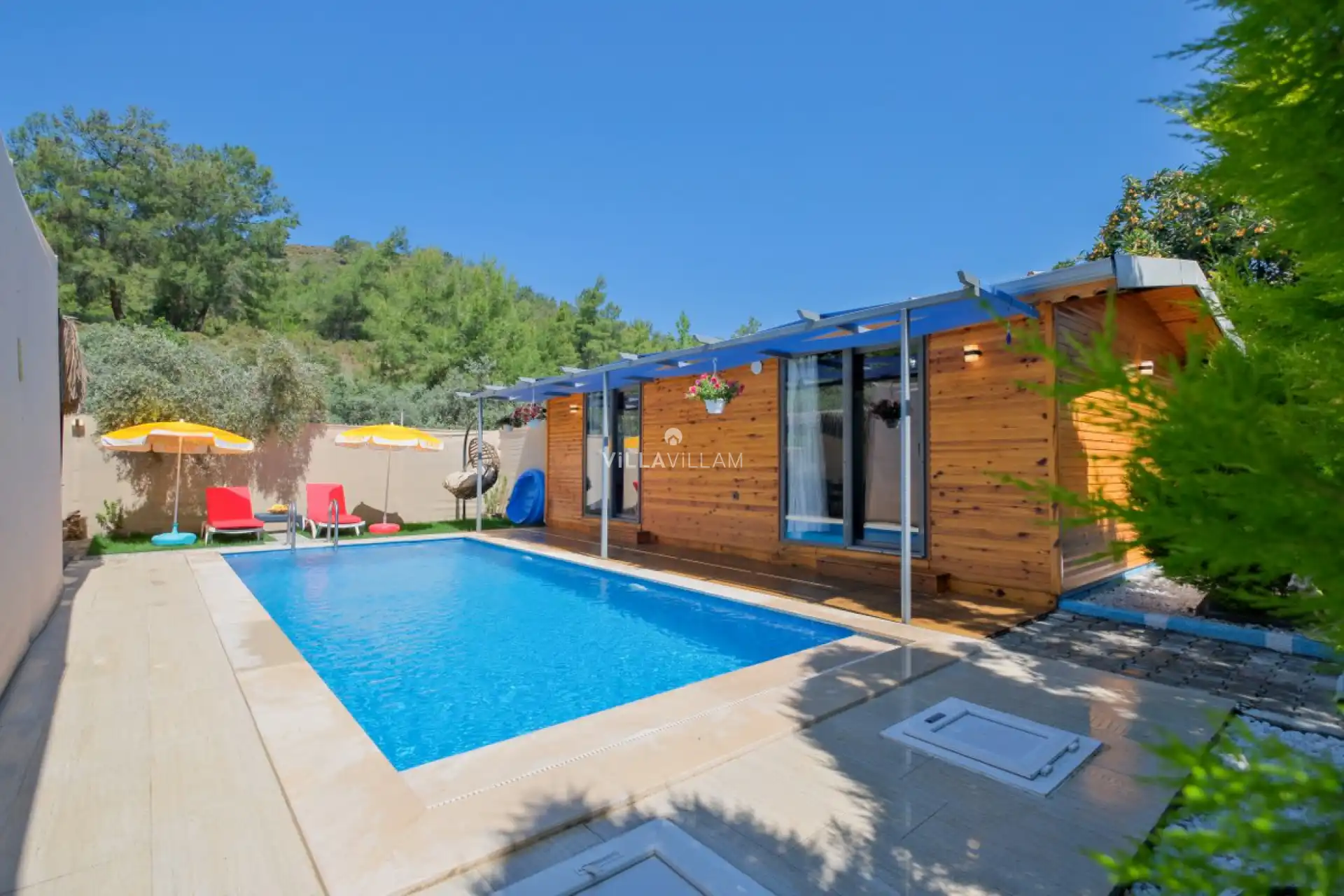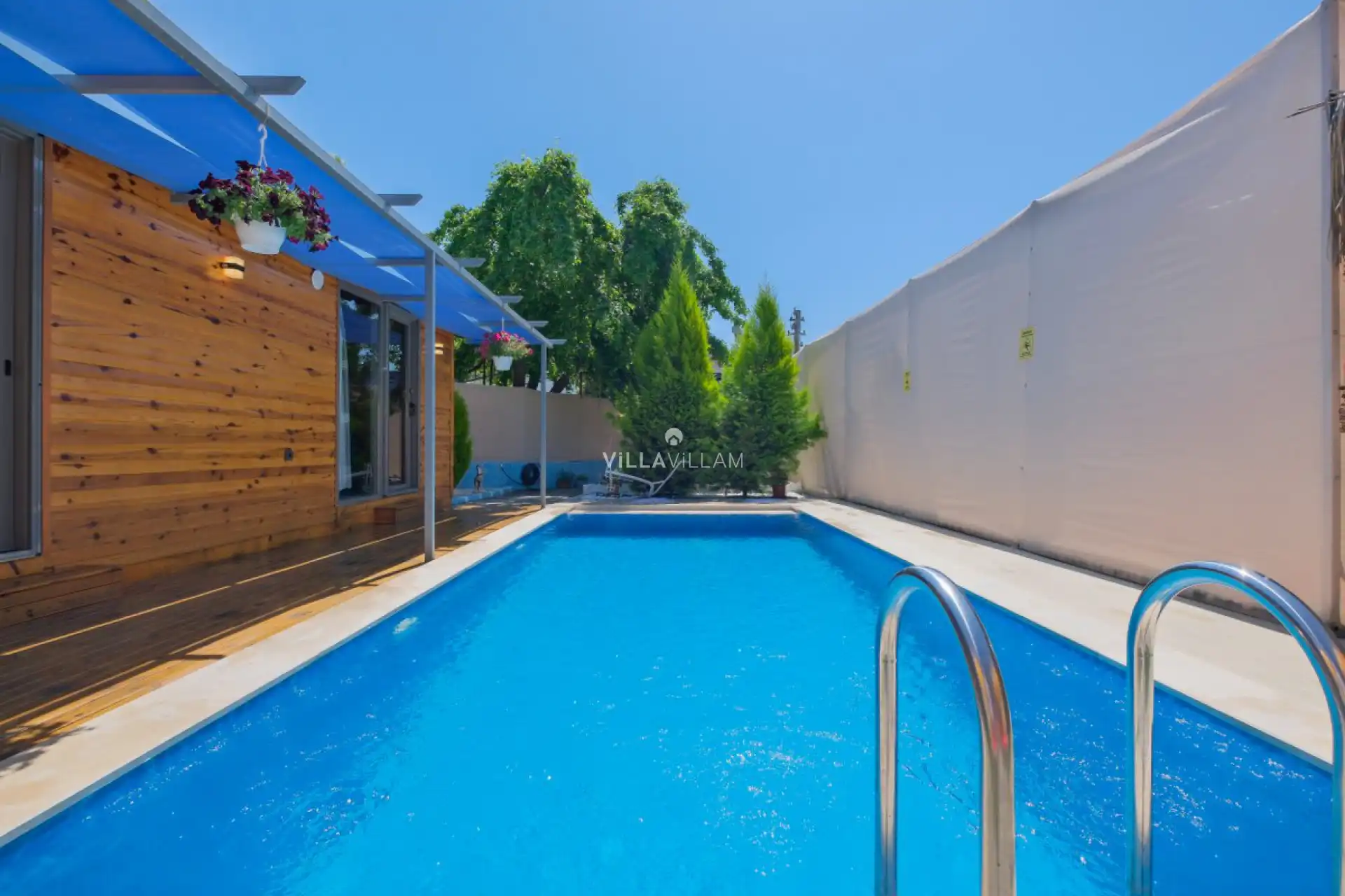 Tatil evinde kapasiteye uygun oturma alanı, şezlong takımı, barbekü; havuz terasına açılan konforlu oturma odası ihtiyaçlarınızı karşılayacak donanımlı mutfğı bulunmaktadır. Yatak odasında çift kişilik yatak ve ebeveyn banyosu mevcuttur.