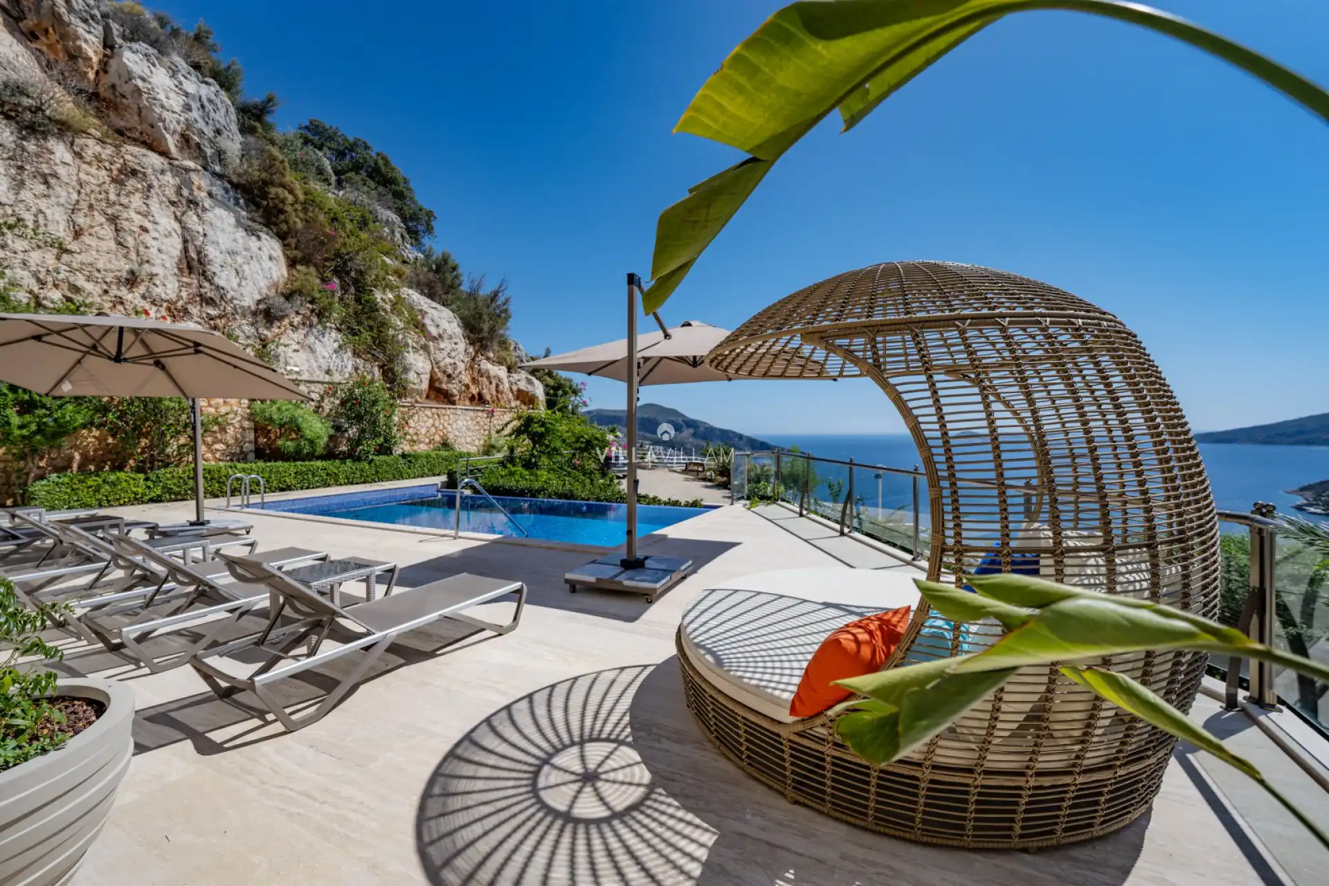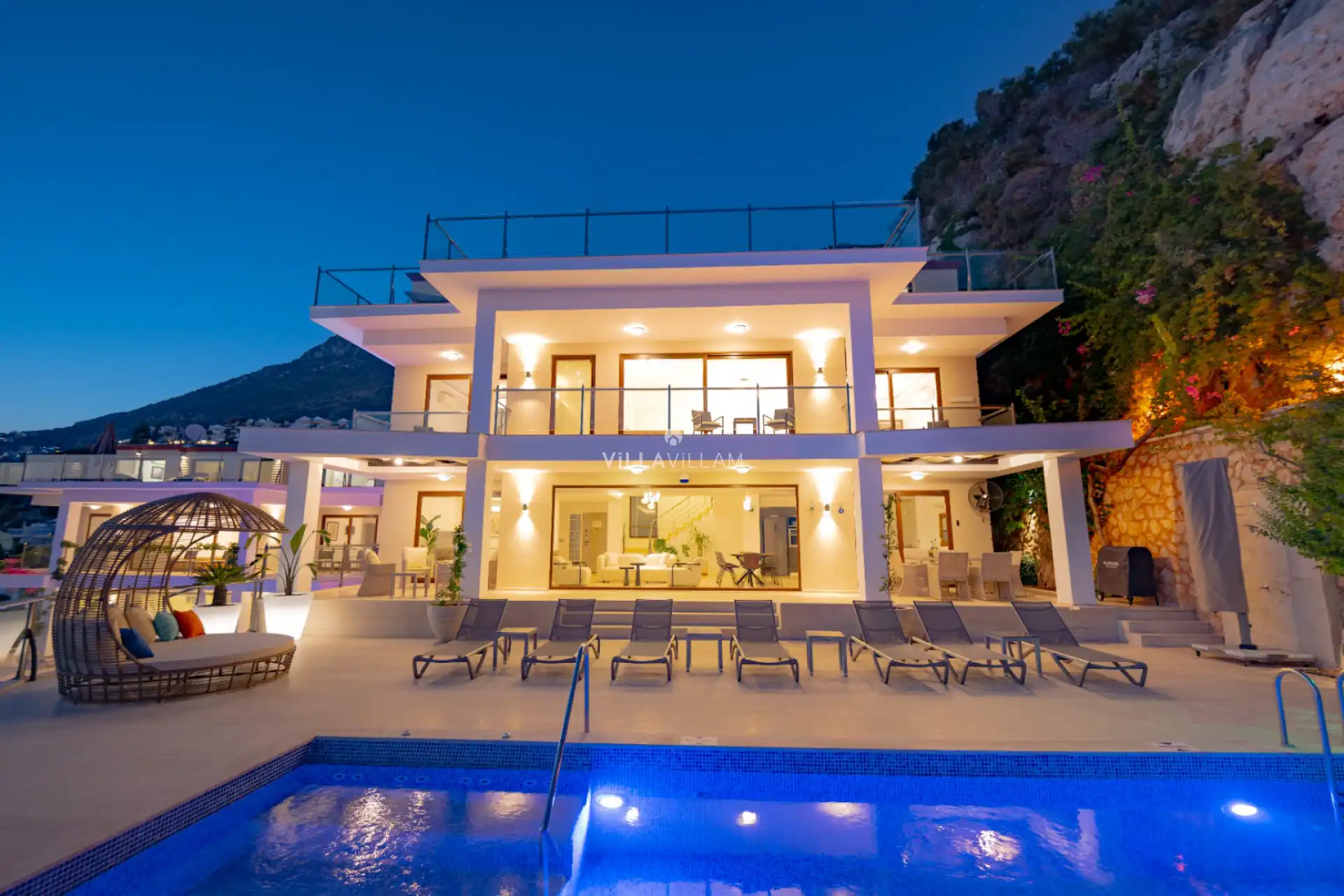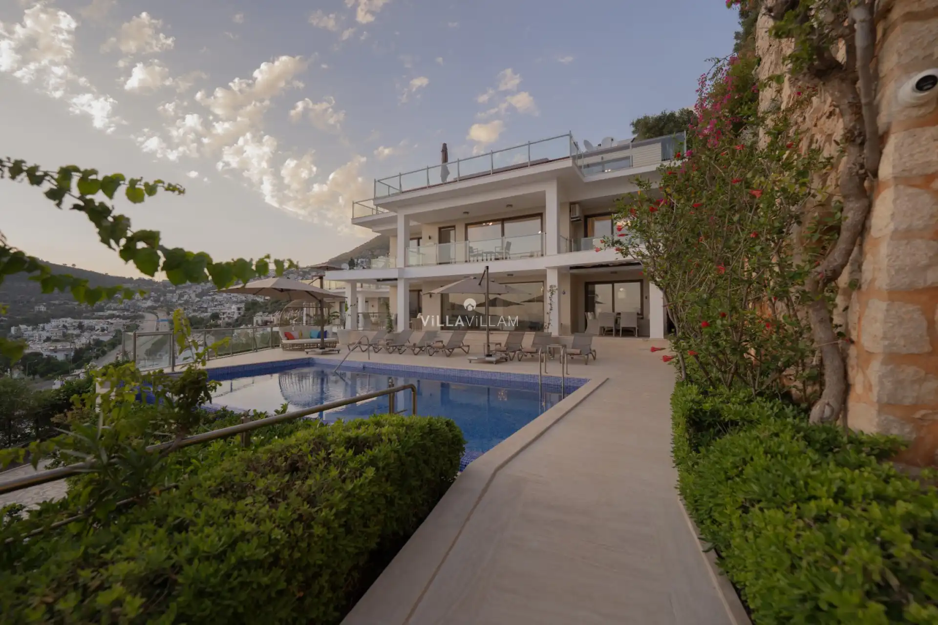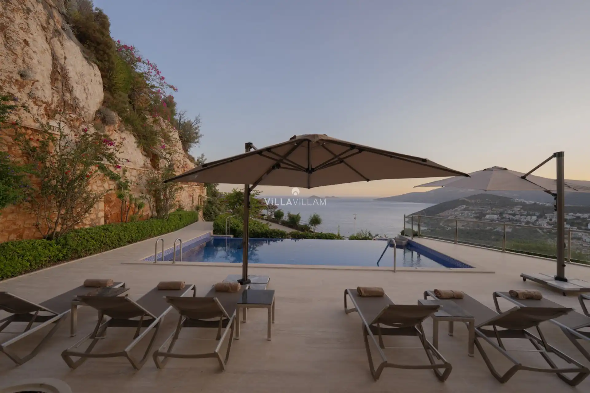 Eşsiz deniz ve doğa manzarasının içinde modern tasarımı ile dikkatleri üzerine çeken, sevdiklerinizle birlikte güvenli ve huzurlu bir tatilin keyfini sürebileceğiniz, özenle tasarlanmış, yeşilin ve mavinin her tonu ile karşı karşıya kalacağınız villanın havuz terasında barbekü ve şezlong grubu bulunmaktadır. Sahip olduğu manzara ile sevdikleriniz ve ailenizle muhteşem günbatımları keyifli tatil anıları biriktirmenize olanak sunmaktadır. Havuz terasına açılan konforlu oturma odası ve donanımlı açık mutfağı; birinci yatak odasında çift kişilik yatak, jakuzi ve banyo; ikinci yatak odasında çift kişilik yatak ve banyo; üçüncü yatak odasında çift kişilik yatak ve banyo; dördüncü yatak odasında çift kişilik yatak ve banyo; beşinci yatak odasında iki tek kişilik yatak ve banyo bulunmaktadır.