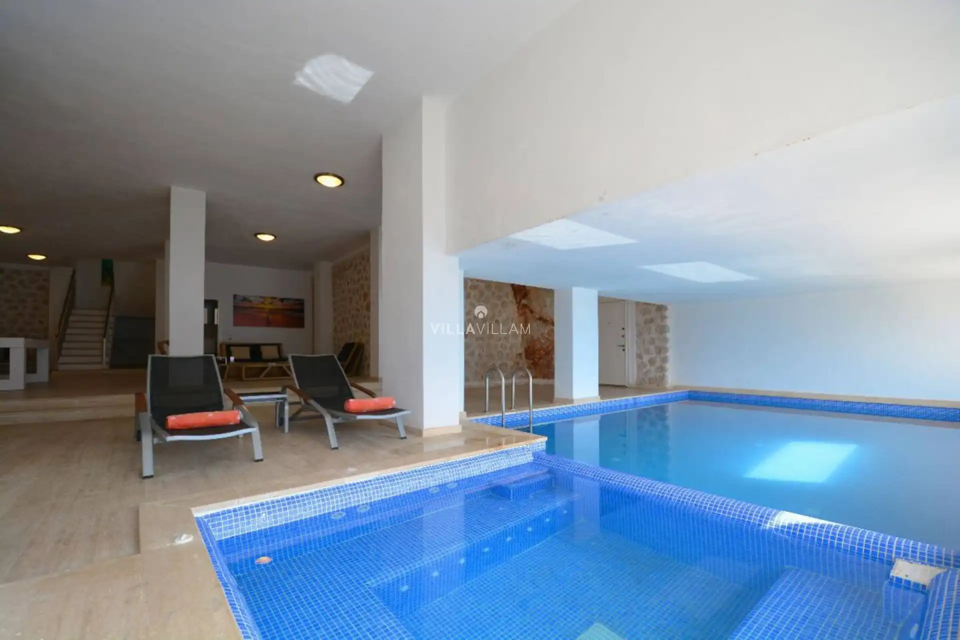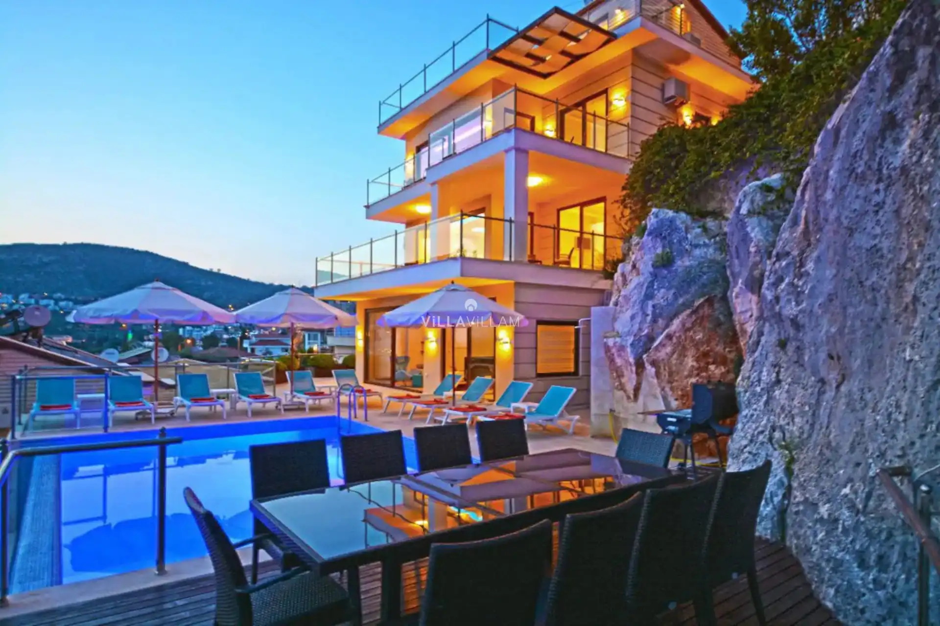 Eşsiz deniz ve doğa manzarasının içinde modern tasarımı ile dikkatleri üzerine çeken, sevdiklerinizle birlikte güvenli ve huzurlu bir tatilin keyfini sürebileceğiniz, özenle tasarlanmış, yeşilin ve mavinin her tonu ile karşı karşıya kalacağınız villanın havuz terasında barbekü ve şezlong grubu bulunmaktadır. Sahip olduğu manzara ile sevdikleriniz ve ailenizle muhteşem günbatımları keyifli tatil anıları biriktirmenize olanak sunmaktadır. Havuz terasına açılan konforlu oturma odası ve donanımlı açık mutfağı; birinci yatak odasında çift kişilik yatak, jakuzi ve banyo; ikinci yatak odasında çift kişilik yatak, jakuzi ve banyo; üçüncü yatak odasında çift kişilik yatak ve banyo; dördüncü yatak odasında çift kişilik yatak ve banyo; beşinci yatak odasında iki tek kişilik yatak ve banyo bulunmaktadır.