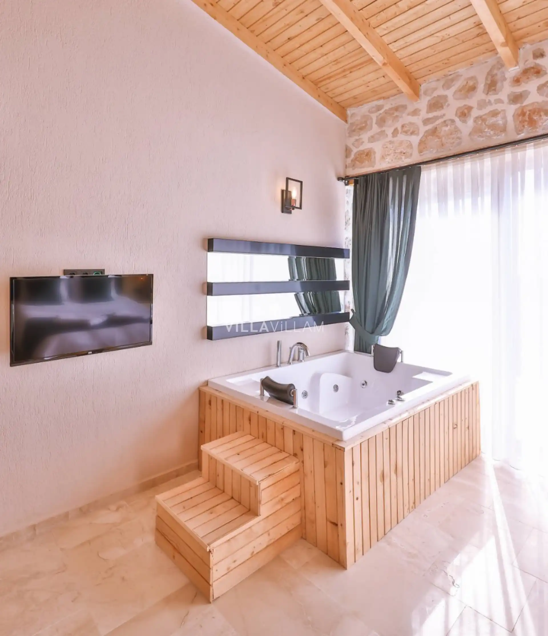Korunaklı havuz alanına sahip olan villanın doğa içinde konumu sayesinde oksijene doyabileceğiniz, sakin bir tatil sizleri beklemektedir. Havuz terasında kapasiteye uygun şezlong takımı, oturma grubu, barbekü alanı bulunmaktadır. Doğa içinde huzurlu konumunuyla, sizlere keyifli bir tatil için kapı aralamaktadır. Geniş havuz terasına açılan konforlu oturma odası donanımlı açık mutfağı bulunan villanın bir yatak odasında çift kişilik yatak, ebeveyn banyosu ve jakuzi; diğer yatak odasında iki tek kişilik yatak ve ebeveyn banyosu bulunmakta olup konforlu bir tatil için her detay düşünülmüştür.