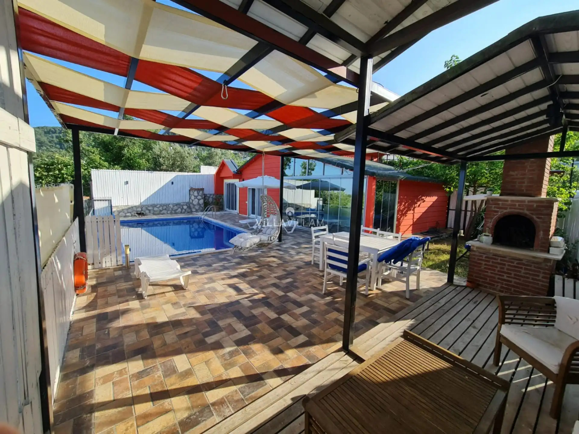 Geniş havuz ve bahçe alanına sahip villada, kapasiteye uygun oturma alanı, şezlong takımı, barbekü, hamak; konforunuz gözetilerek tasarlanmış olan muhafazakar havuz alanına açılan ferah oturma odası, tam donanımlı açık mutfak; birinci yatak odasında çift kişilik yatak, jakuzi alanı ve ebeveyn banyosu; ikinci yatak odasında çift kişilik yatak, ebeveyn banyosu ve ekstra olarak çift kişilik ek yatak bulunmaktadır. Villa, ihtiyaçlarınıza tam karşılık verecek donanıma sahiptir.