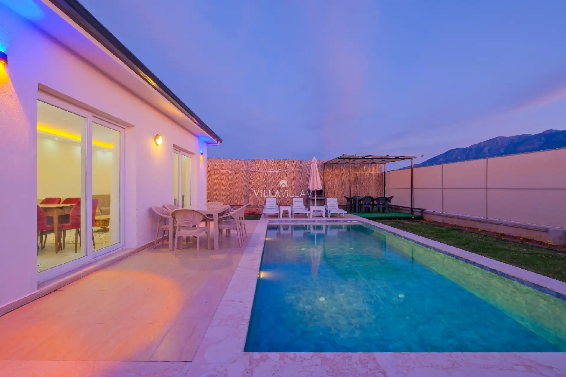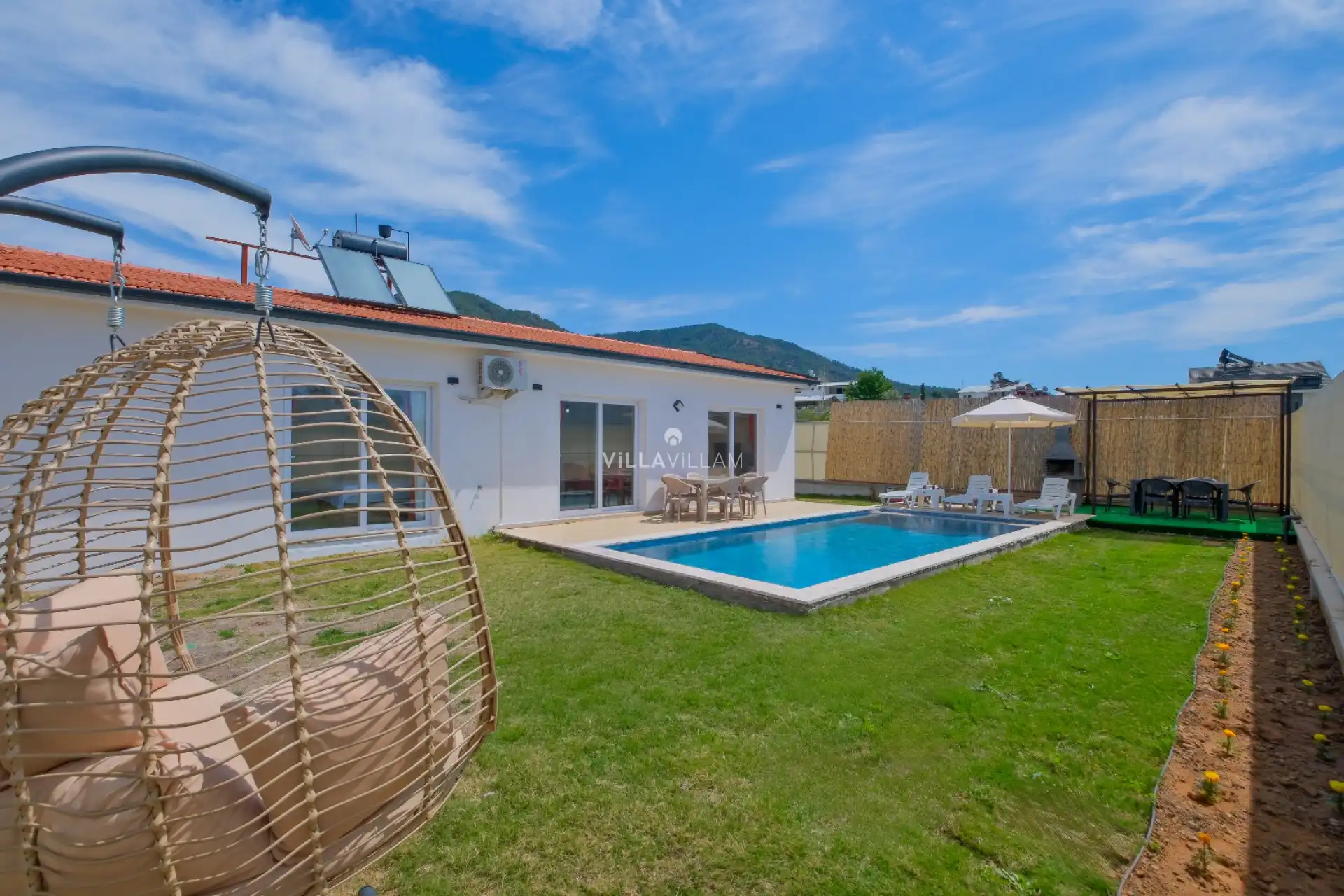 Geniş bahçe alanı ve mükemmel bir doğaya sahip bölgede sizlere şehir gürültüsü ve stresinden uzakta tatil imkanı sunan villa, siz değerli misafirlerini beklemektedir. Havuz ve bahçe alanında şezlong takımı, oturma grubu ve barbekü alanı bulunmaktadır. Birinci yatak odasında çift kişilik yatak ve ebeveyn banyosu, ikinci ve üçüncü yatak odasında iki tek kişilik yatak ve banyo bulunmaktadır.