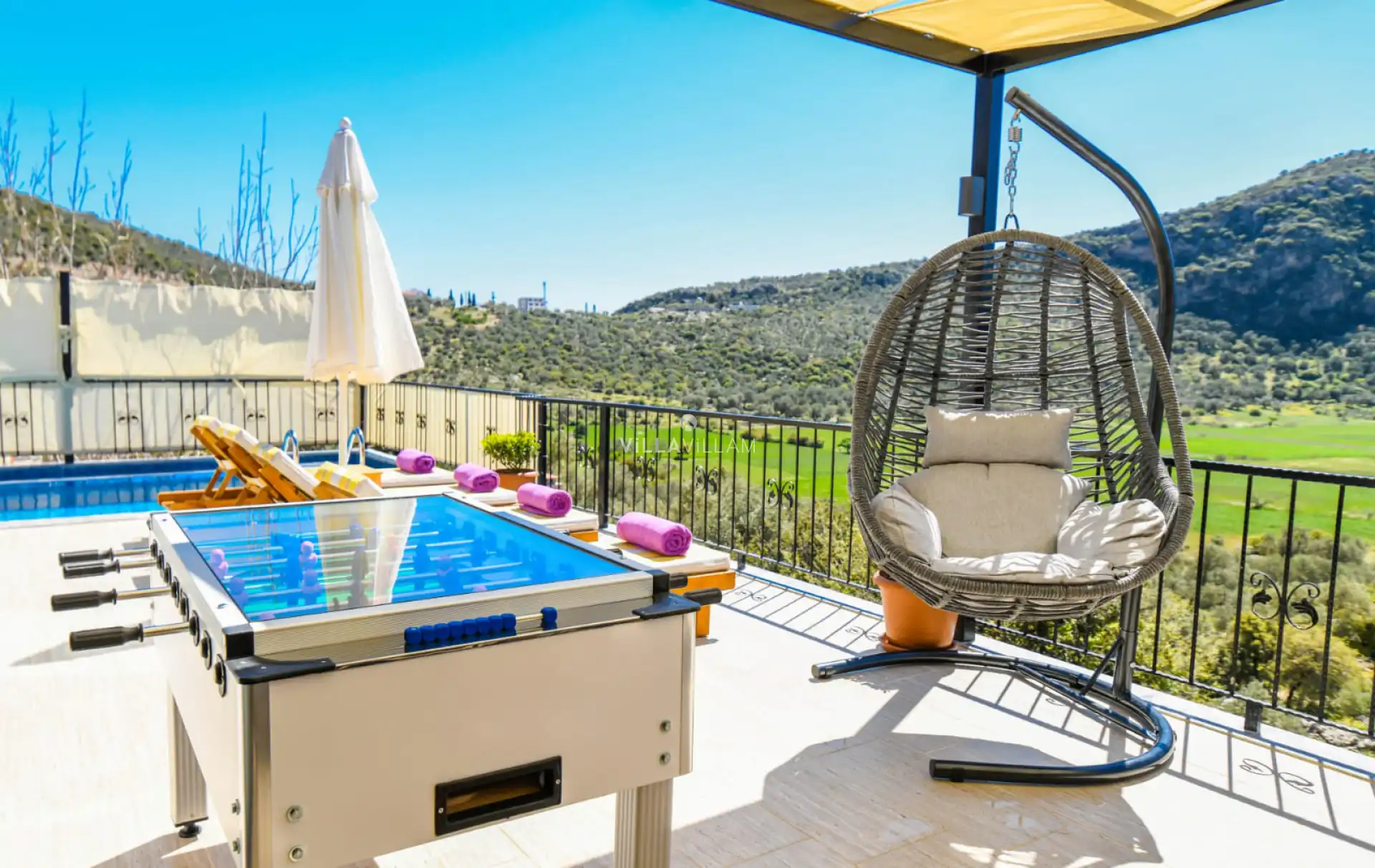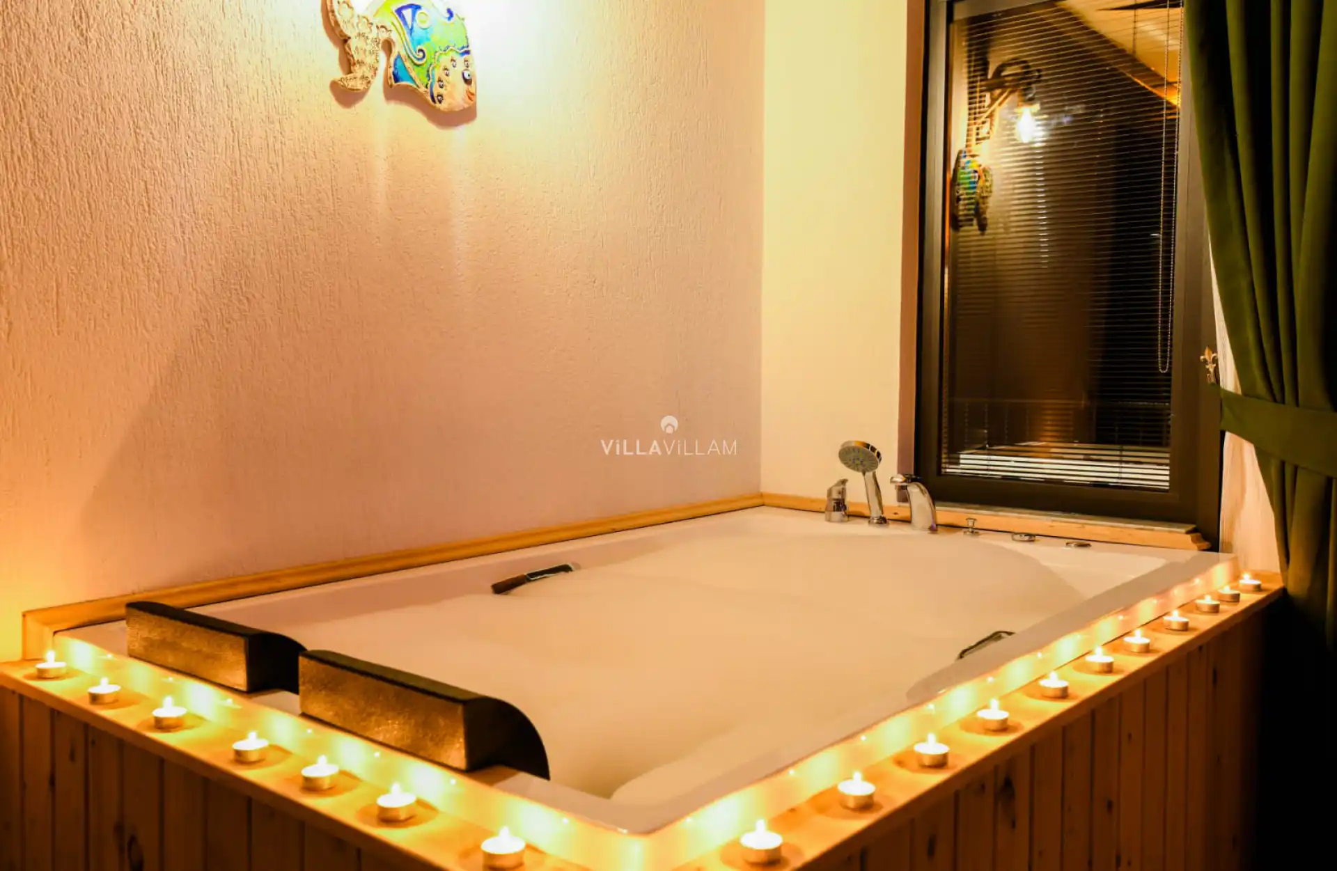 Yemyeşil bir atmosferde kendinizi doğanın verdiği huzurla güneşin kollarına bırakabileceğiniz özel bir konum sunan villamızda eğlenceli zaman geçirebilmeniz için langırt da yer almaktadır. Konforlu mobilyaları, özel konumu, korunaklı havuz alanı ve ebeveyn odasında yer alan jakuzisi ile tatil beklentilerinizi tam karşılayabilecek olan seçeneklerimiz arasında olan villa misafirlerimizi beklemektedir. Birinci yatak odasında çift kişilik yatak, jakuzi ve ebeveyn banyosu; ikinci yatak odasında çift kişilik yatak ve banyo bulunmaktadır.
