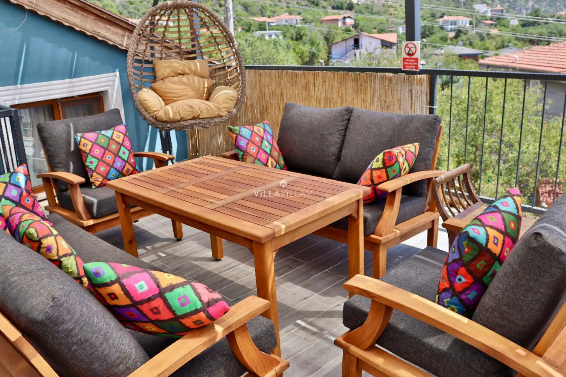 Dış mekanda şezlong takımı, oturma grubu, salıncak ve barbekü alanı bulunurken iç mekanda ise konforlu oturma odası ve tam donanımlı açık mutfağı; birinci yatak odasında çift kişilik yatak ve ebevyn banyosu; ikinci yatak odasında iki tek kişilik yatak ve banyo ayrıca salonda ortak banyo/WC bulunmaktadır.