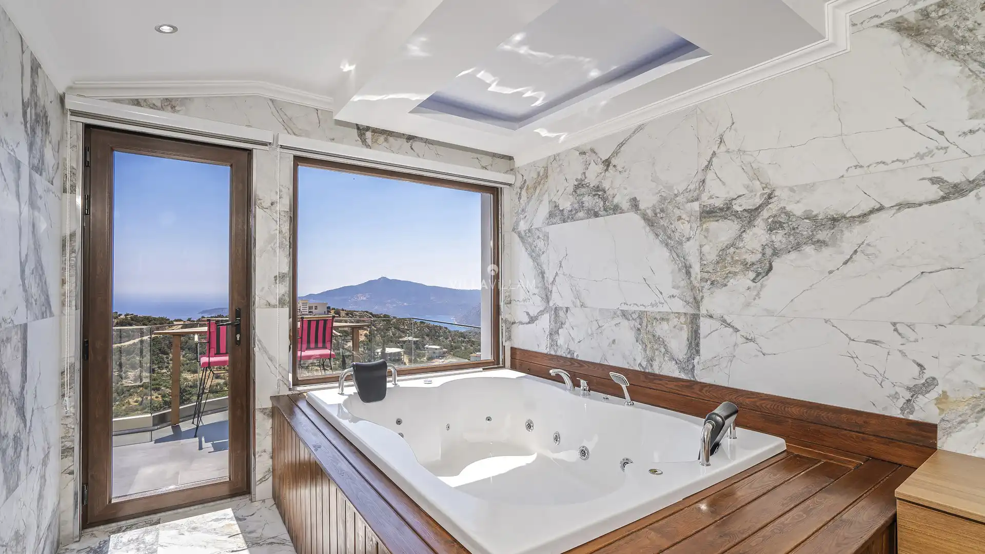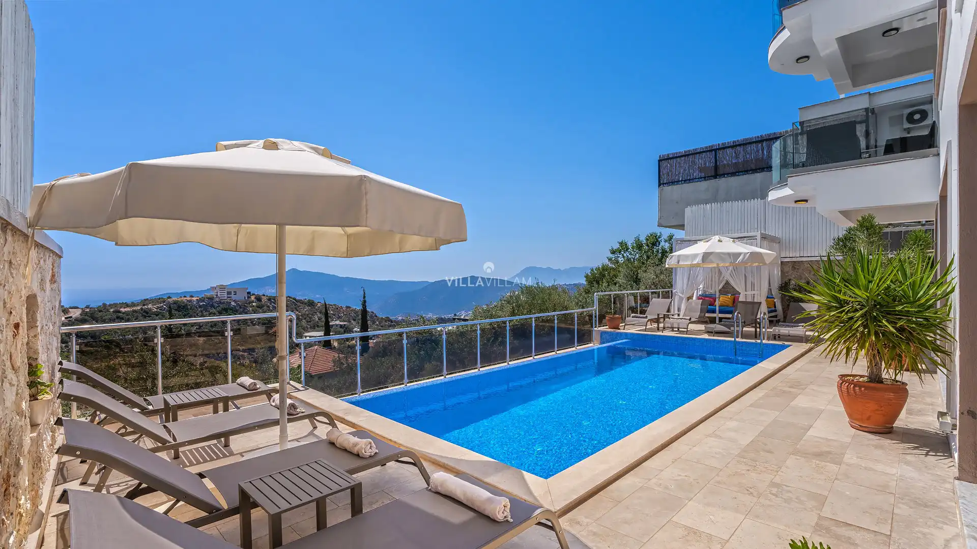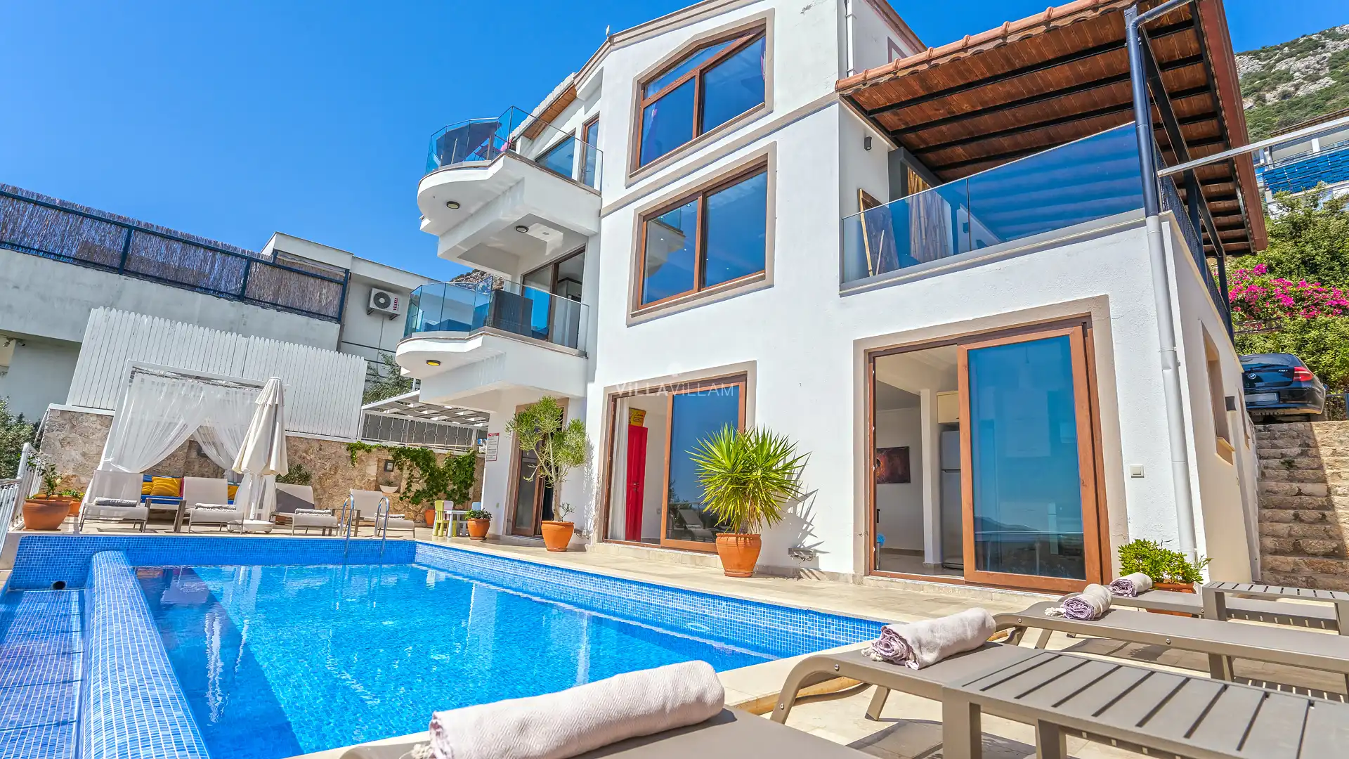 Kalkan Kördere mevkiinde konumlandırılan villamız 4 adet suit yatak odasıyla 8 kişilik konaklama kapasitesi sunmaktadır. Havuz alanı korunaklı yapıya sahip villamızın havuz terasında dinlenmeniz için locası, eğlenceli vakit geçirmeniz için langırtı mevcuttur. Villamızda ayrıca profesyonel bir sinema odası, bilardo, sauna manzaranın tadına doyamayacağınız şekilde konumlandırılmış geniş bir jakuzi de hizmetinizdedir. Tatilinizi dolu dolu geçirebilmeniz için hem eğlenip hem de dilediğiniz gibi dinlenebileceğiniz detaylarla hizmetinizde olan villamız Kalkan merkeze de 5 dakikalık sürüş mesafesinde yer almaktadır.