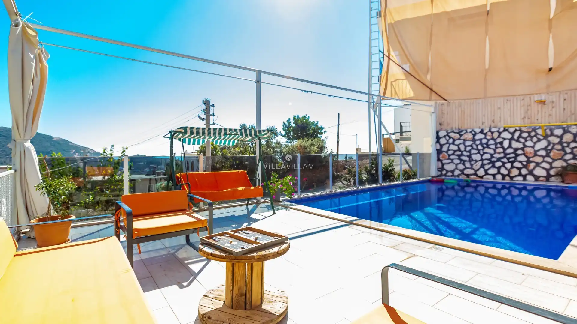 Muhteşem manzaraya karşı güneşlenip yüzebileceğiniz havuz terasında, kapasiteye uygun şezlong takımı, oturma grubu ve barbekü alanı bulunan villa, sevdiklerinizle beraber keyifli vakit geçirme imkânı sunmaktadır. Yine havuz terasına açılan konforlu oturma odası ve tam donanımlı açık mutfağı; birinci yatak odasında çift kişilik yatak, ebeveyn banyosu ve jakuzi; ikinci yatak odasında çift kişilik yatak ve banyo; üçüncü yatak odasında ise iki tek kişilik yatak ve banyo bulunmaktadır. Oda terasından muhteşem deniz manzarasına hâkim olabileceğiniz, ayrıcalıklı bir tatilin keyfini sürebileceksiniz.