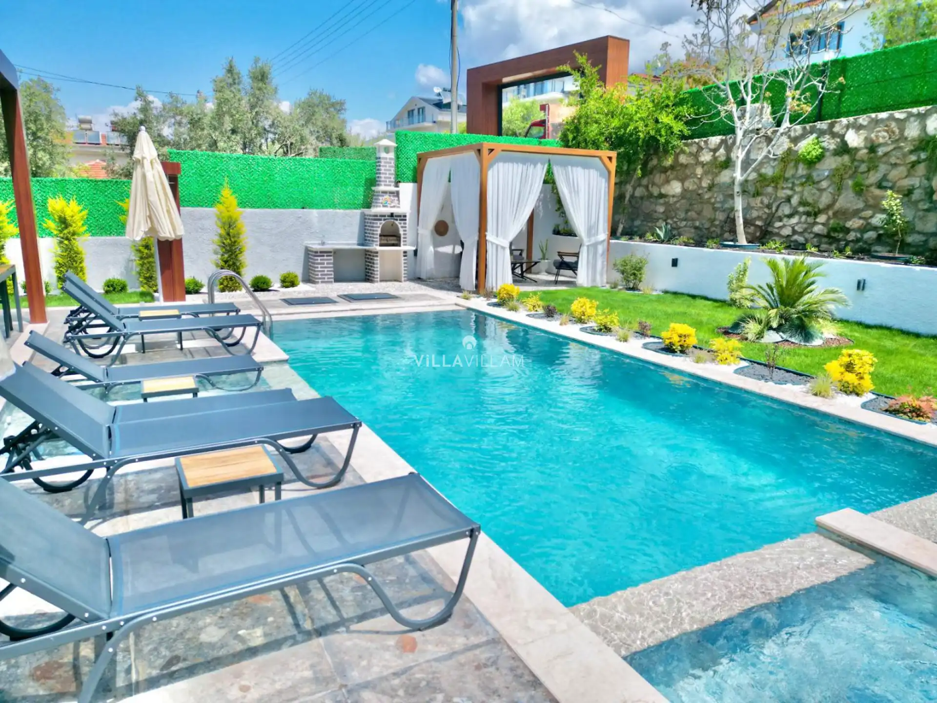 Doğa içerisinde yeşilliklerin arasında bulunan villanın havuz terasında şezlong takımı, oturma grubu ve barbekü alanı bulunmaktadır. Bahçe ve havuz alanı estetik peyzaj tasarımı ile gökyüzünün mavi tonuyla ahenk içindedir. Havuz alanında çocuk havuzu ve jakuzi yer almaktadır. Muhteşem havuz terasına açılan konforlu oturma odası, tam donanımlı açık mutfağı bulunmaktadır. Dört yatak odasında çift kişilik yatak ve ebeveyn banyosu yer almaktadır.