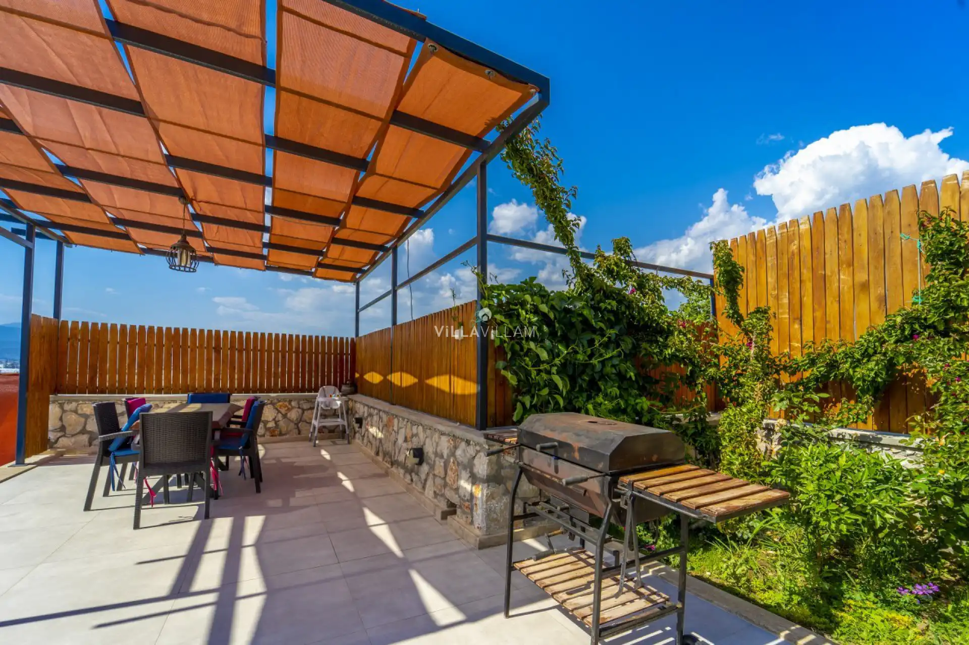 Sevdiklerinizle birlikte güvenli ve huzurlu bir tatilin keyfini sürebileceğiniz, özenle tasarlanmış, yeşilin her tonuyla karşılaşabileceğiniz villanın havuz terasında şezlong takımı, oturma grubu, salıncak, hamak, masa tenisi ve barbekü alanı bulunmaktadır. İç mekânda ise özenle dizayn edilmiş konforlu bir oturma odası ve donanımlı açık mutfak; birinci yatak odasında çift kişilik yatak, jakuzi ve ebeveyn banyosu; ikinci yatak odasında ise iki tek kişilik yatak bulunmaktadır.