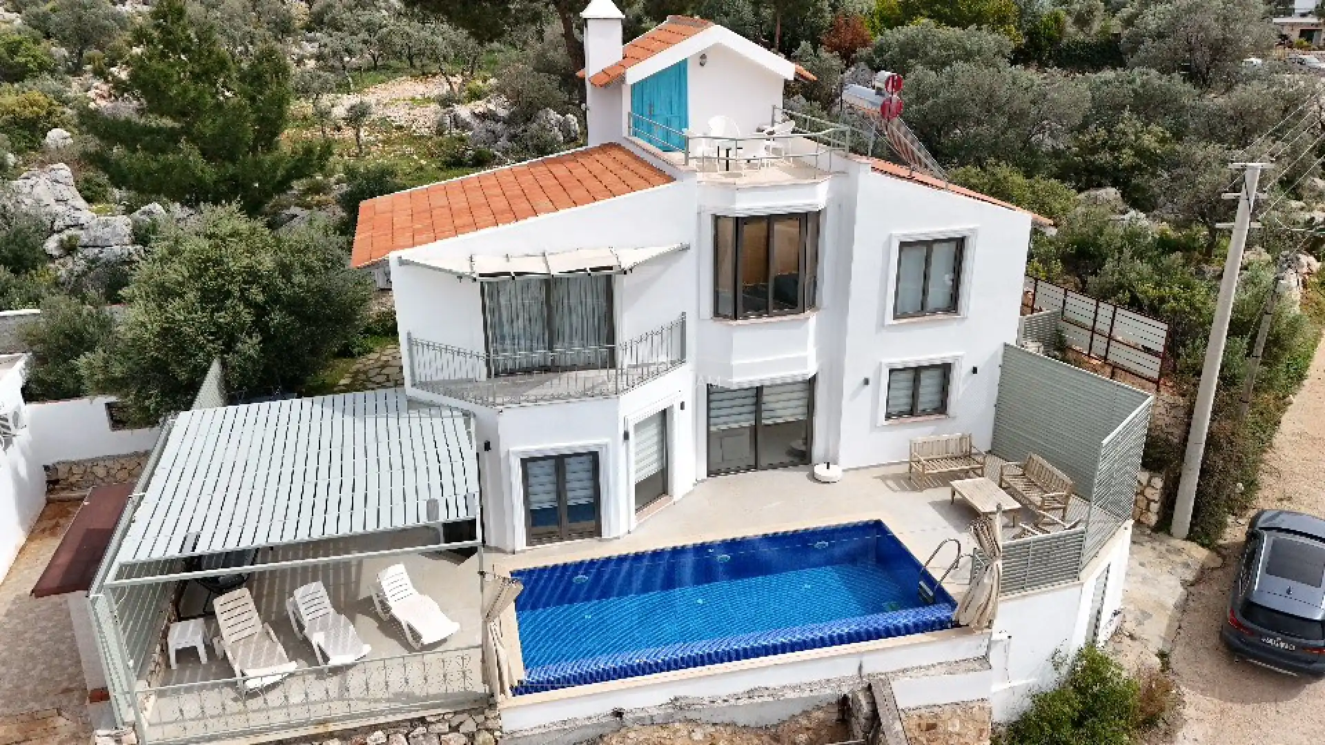Kalkan Kışla bölgesinde bulunan villa, 3 yatak odasıyla 7 kişilik konaklama kapasitesi sunmaktadır. Deniz manzarasına hakim, genişliği ve şıklığı ile göz dolduran villa, kalabalık aile ve arkadaş grupları için uygundur.