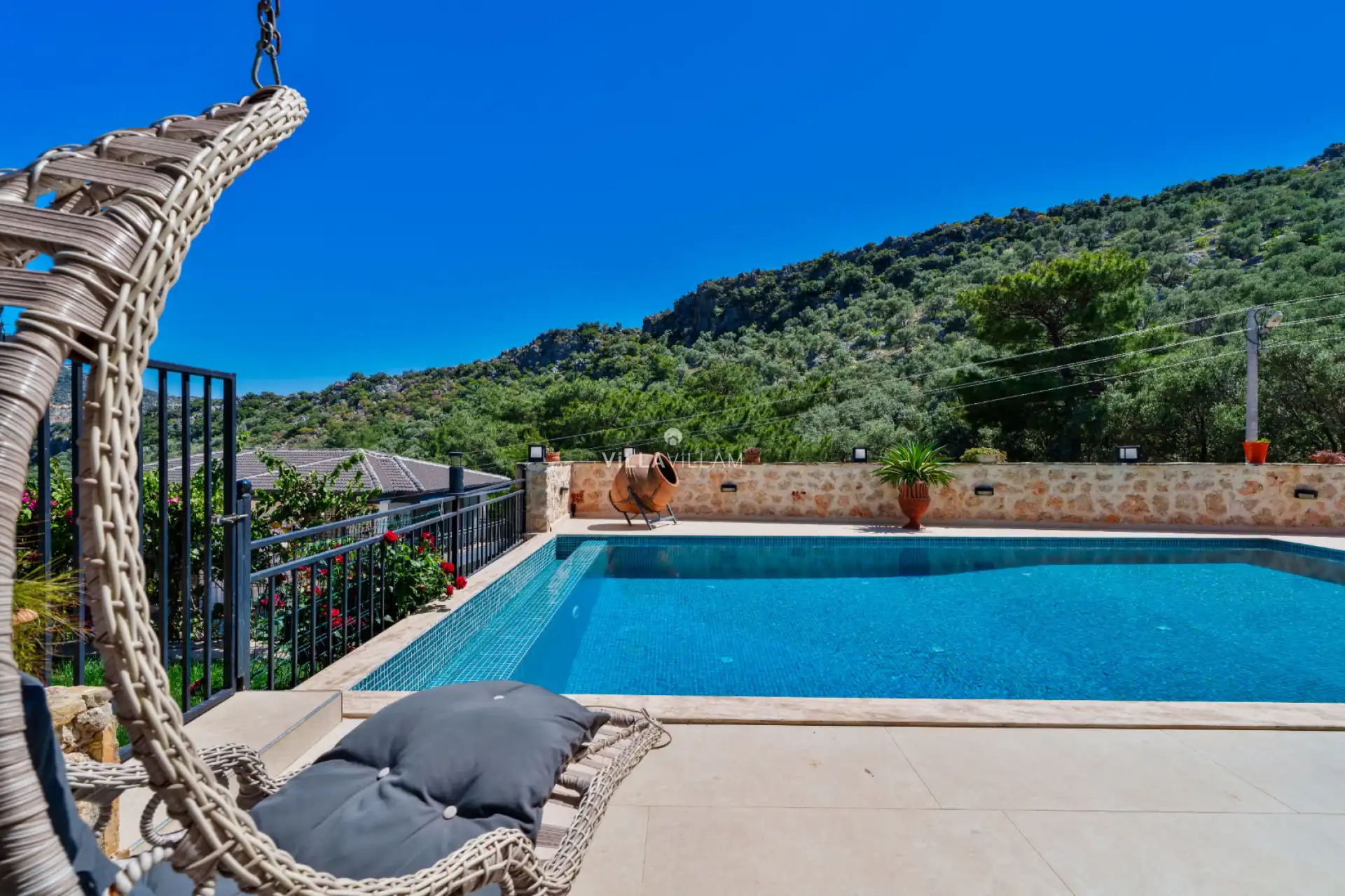 Sevdiklerinizle birlikte güvenli ve huzurlu bir tatilin keyfini sürebileceğiniz, güneşin ve temiz havanın tadına doyacağınız villanın havuz terasında şezlong takımı, oturma grubu, salıncak ve barbekü alanı bulunmaktadır. İç mekanda ihtiyaçlarınıza karşılık verecek konforlu oturma odası ve açık mutfağı; üç yatak odasında bir adet çift kişilik yatak bulunmaktadır. Ortak kullanım banyo bulunmaktadır.