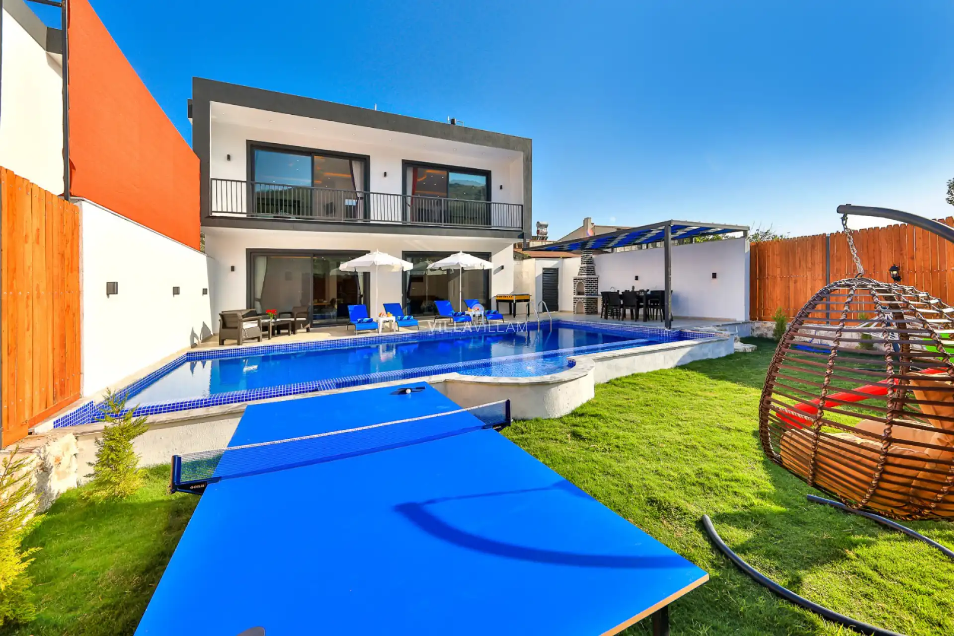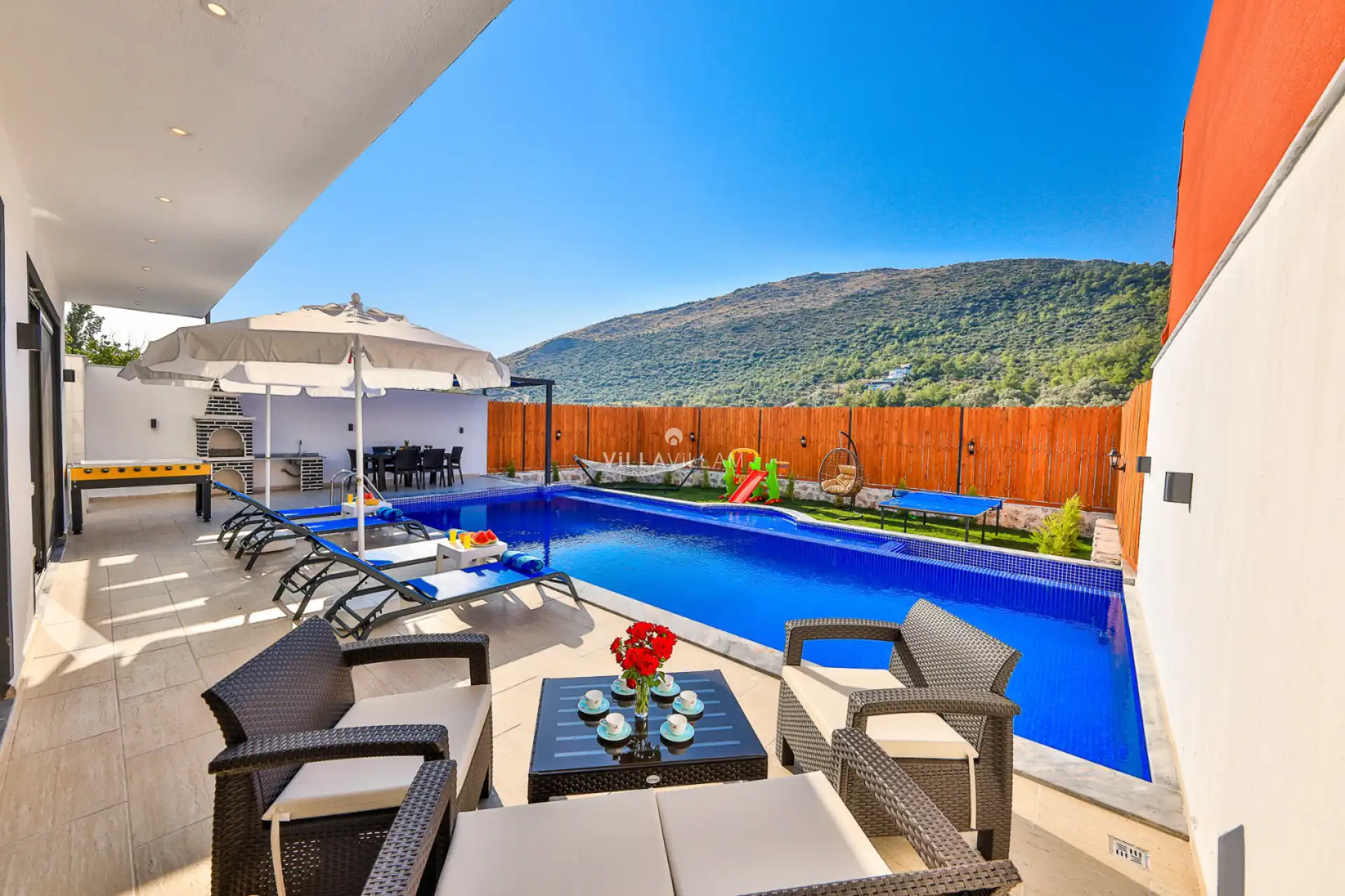 Sevdiklerinizle hayal ettiğiniz tatil planlarını gerçeğe dönüştürebileceğiniz, doğa içerisinde konumlanan ve sadece size özel bir tatil imkânı sunan villamızda kapasiteye uygun oturma alanı, şezlong takımı, çocuk oyun alanı, langırt, salıncak ve barbekü alanı; havuz terasına açılan konforlu oturma odası ve ihtiyaçlarınızı karşılayacak donanımlı mutfağı bulunmaktadır. Bir yatak odasında çift kişilik yatak, ebeveyn banyosu ve jakuzi; ikinci yatak odasında bir tek kişilik yatak, bir çift kişilik yatak ve banyo bulunmaktadır.