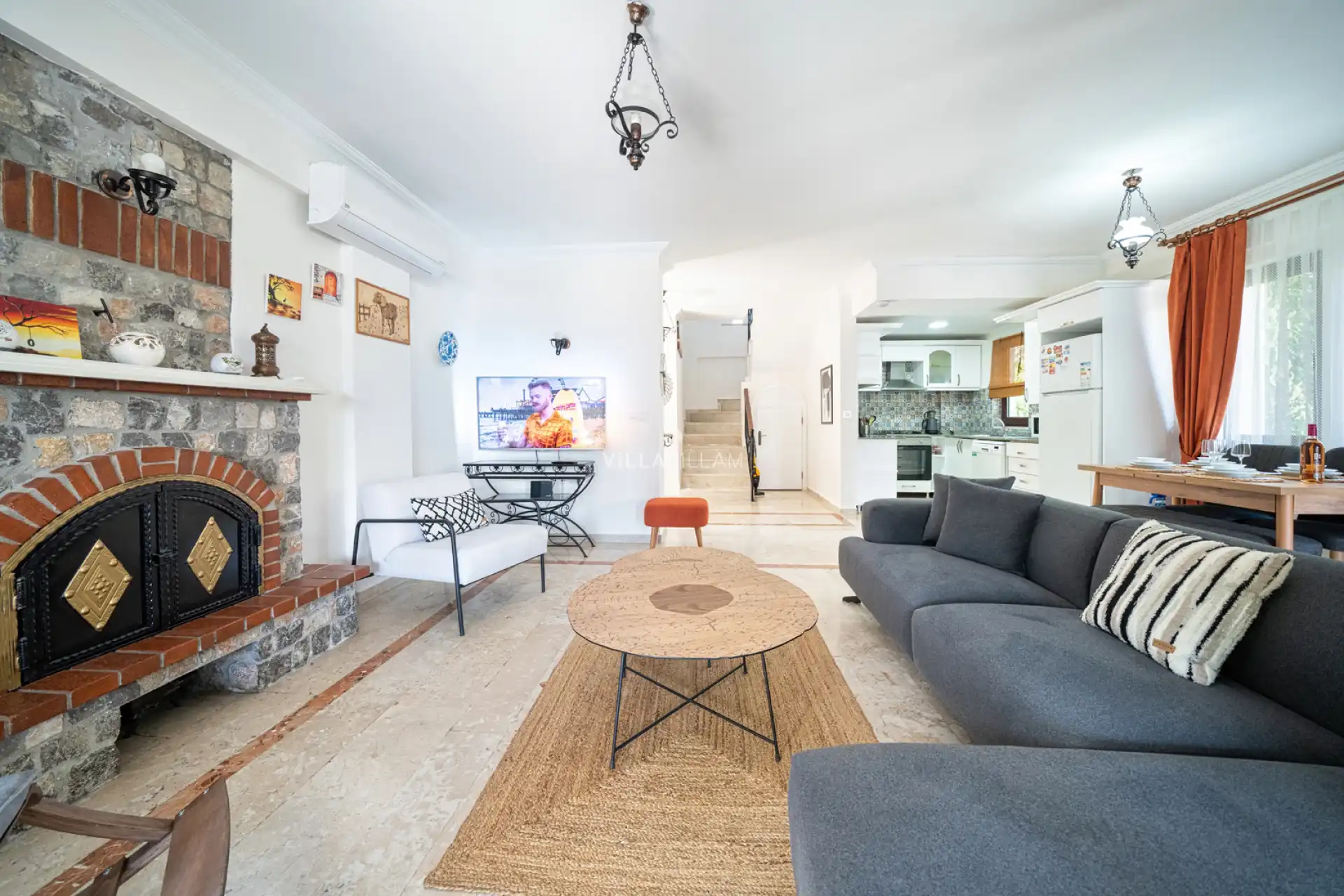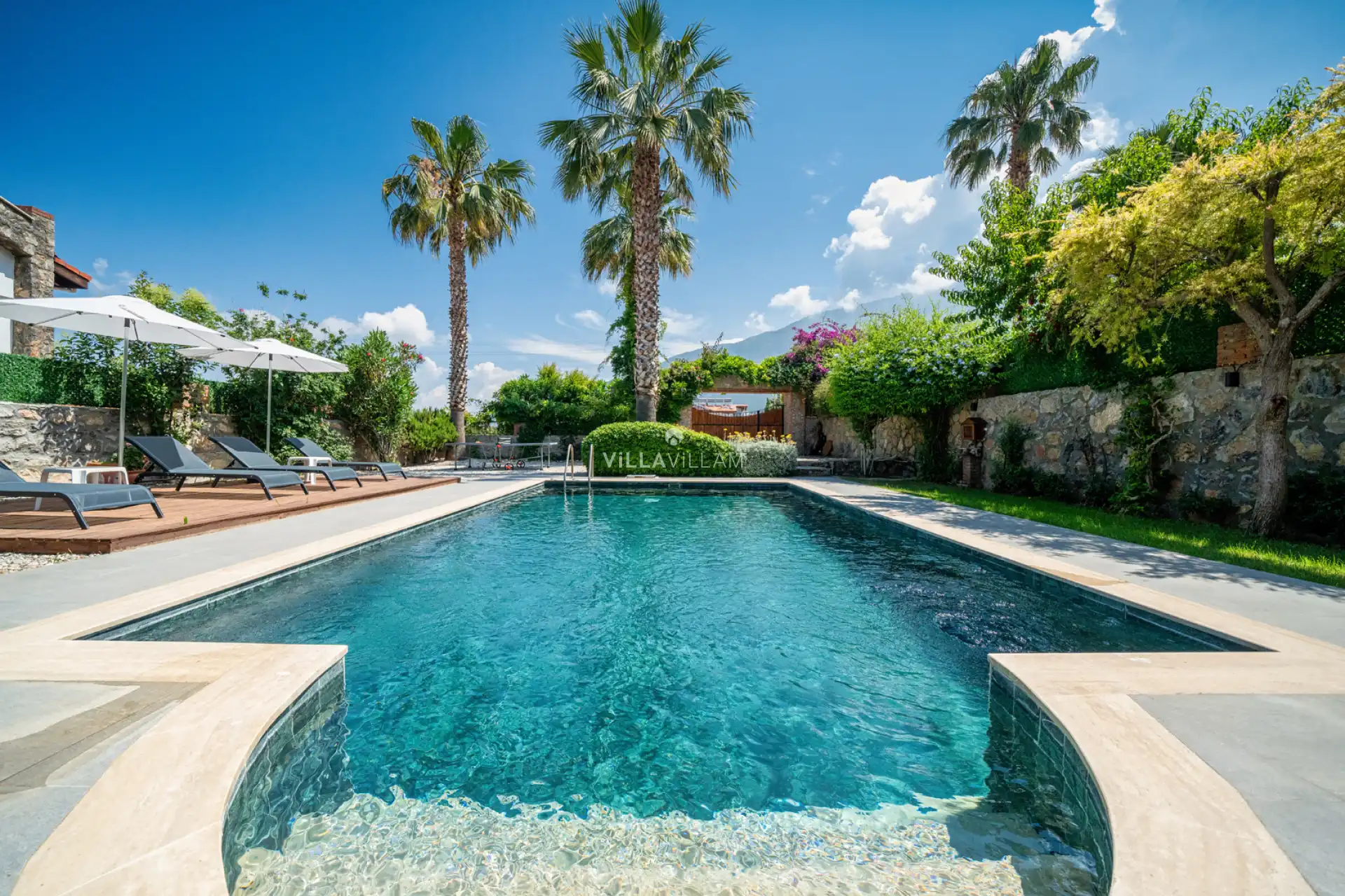 Geniş havuz ve bahçe alanında şezlong takımı ve oturma grubu yer alırken, iç mekânda ise konforlu oturma odası, donanımlı mutfağı ve şık iç mimarisiyle ilgi çekmekte olup; birinci yatak odasında çift kişilik yatak ve banyo; ikinci yatak odasında iki tek kişilik yatak ve ortak banyo; üçüncü yatak odasında çift kişilik yatak ve ortak banyo bulunmaktadır.