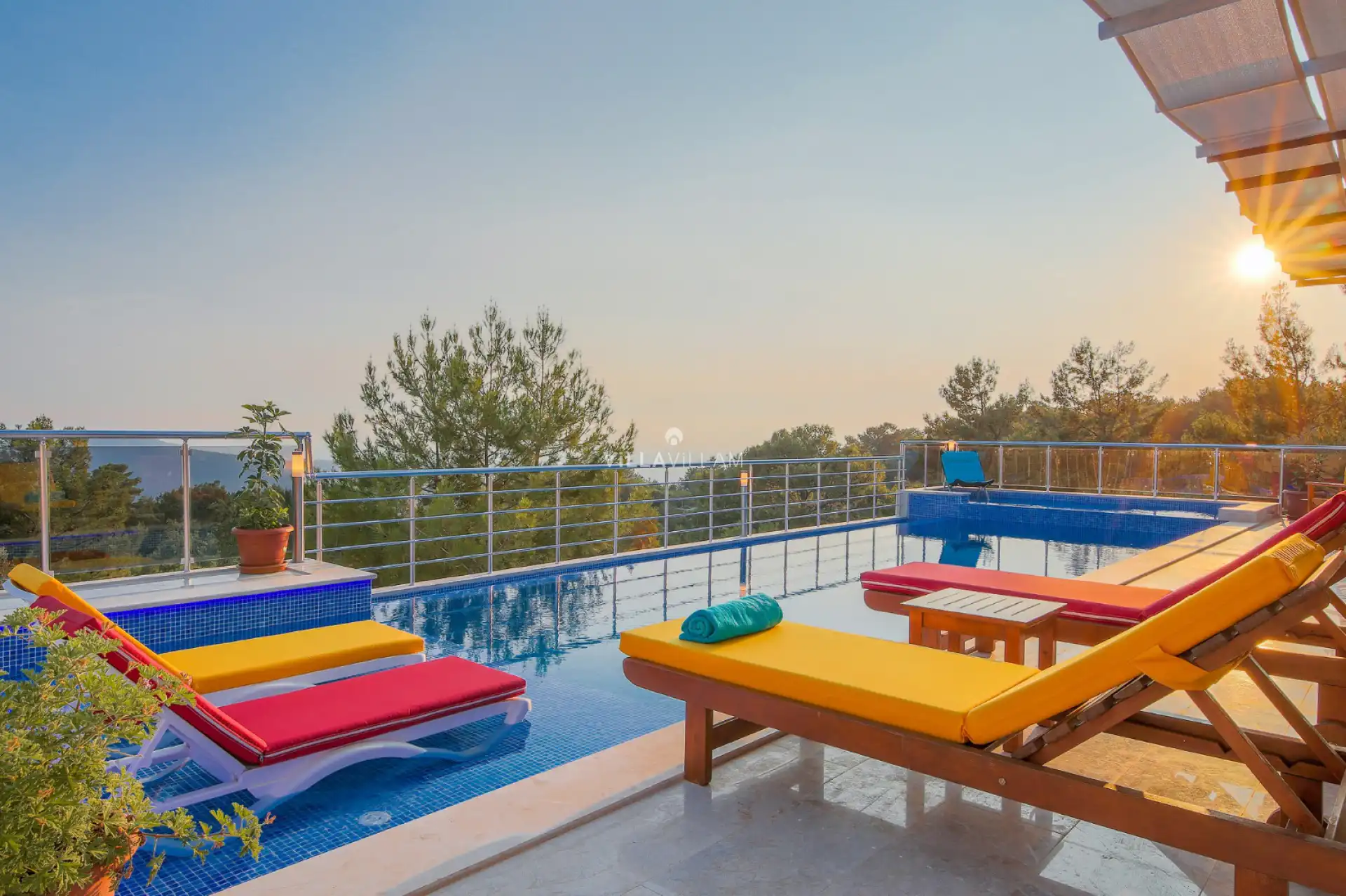 Korunaklı havuz alanına sahip olan villanın doğa içinde konumu sayesinde oksijene doyabileceğiniz, sakin bir tatil sizleri beklemektedir. Havuz terasında kapasiteye uygun şezlong takımı, oturma grubu, barbekü alanı ve salıncak bulunmaktadır. Doğa içinde huzurlu konumundan esinlenilen taş ve ahşap karışımı mimarisiyle postmodern bir atmosfere sahip olan villa, sizlere keyifli bir tatil için kapı aralamaktadır.