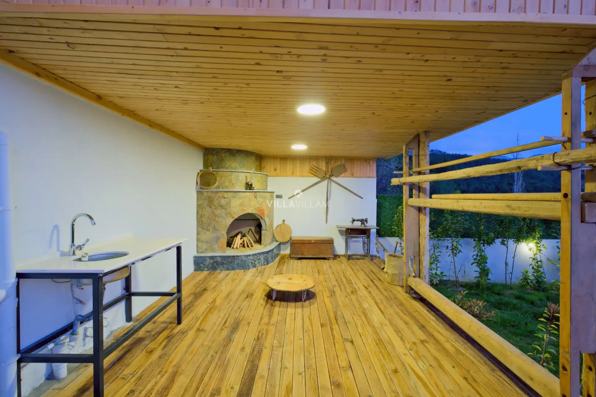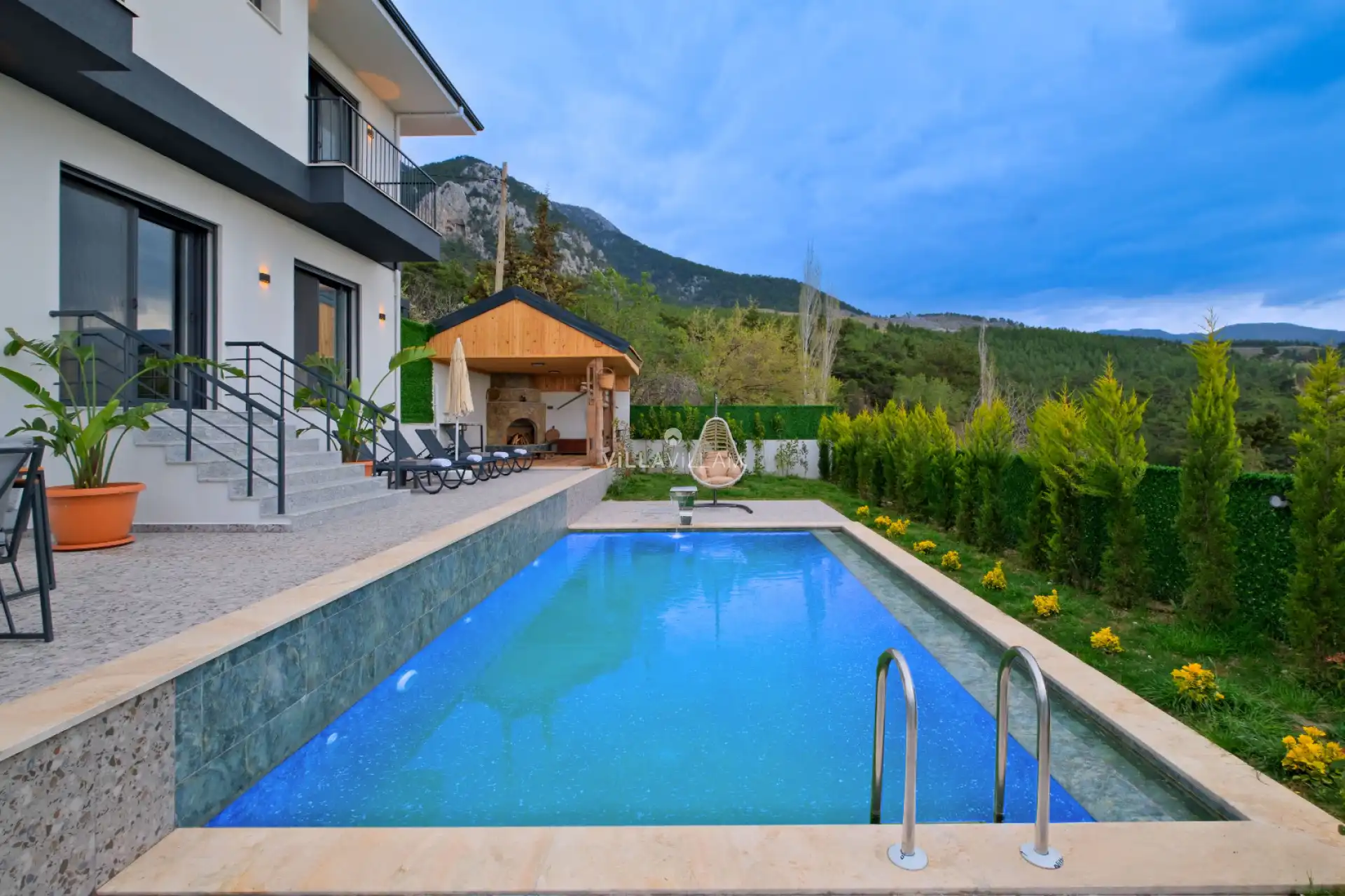 Doğa içinde, huzurlu bir konuma sahip olan villanın havuz ve bahçe alanında kapasiteye uygun şezlong takımı, oturma grubu ve barbekü alanı; havuz terasına açılan oturma odası ve tam donanımlı açık mutfağı bulunmaktadır. Birinci yatak odasında çift kişilik yatak, ebeveyn banyosu ve jakuzi; ikinci yatak odasında çift kişilik yatak ve banyo bulunmaktadır.