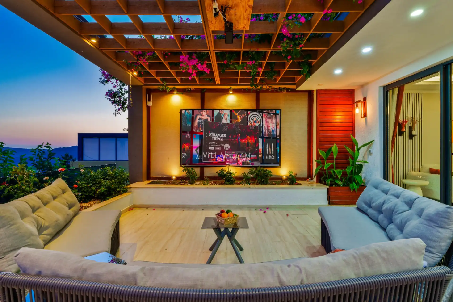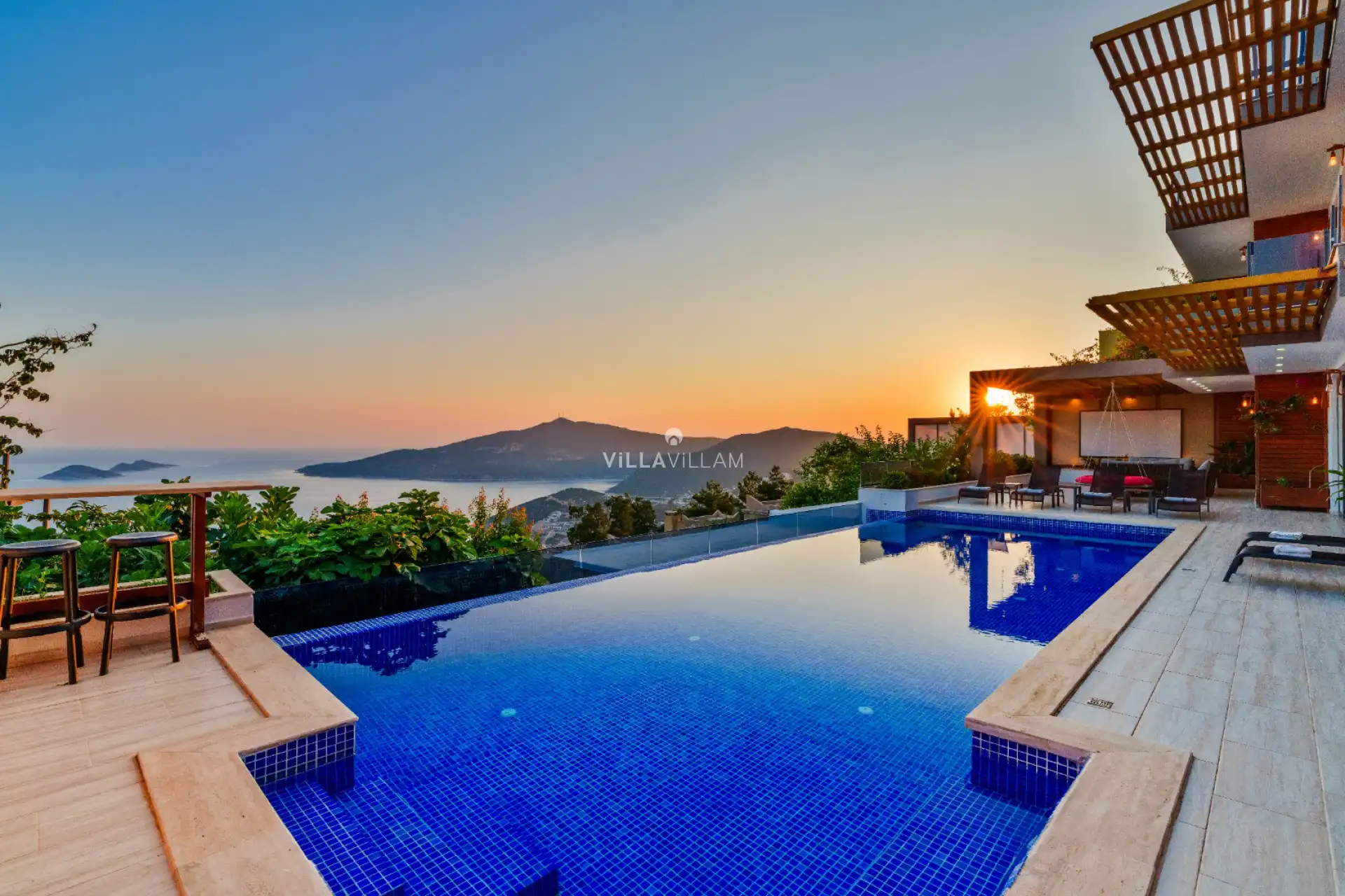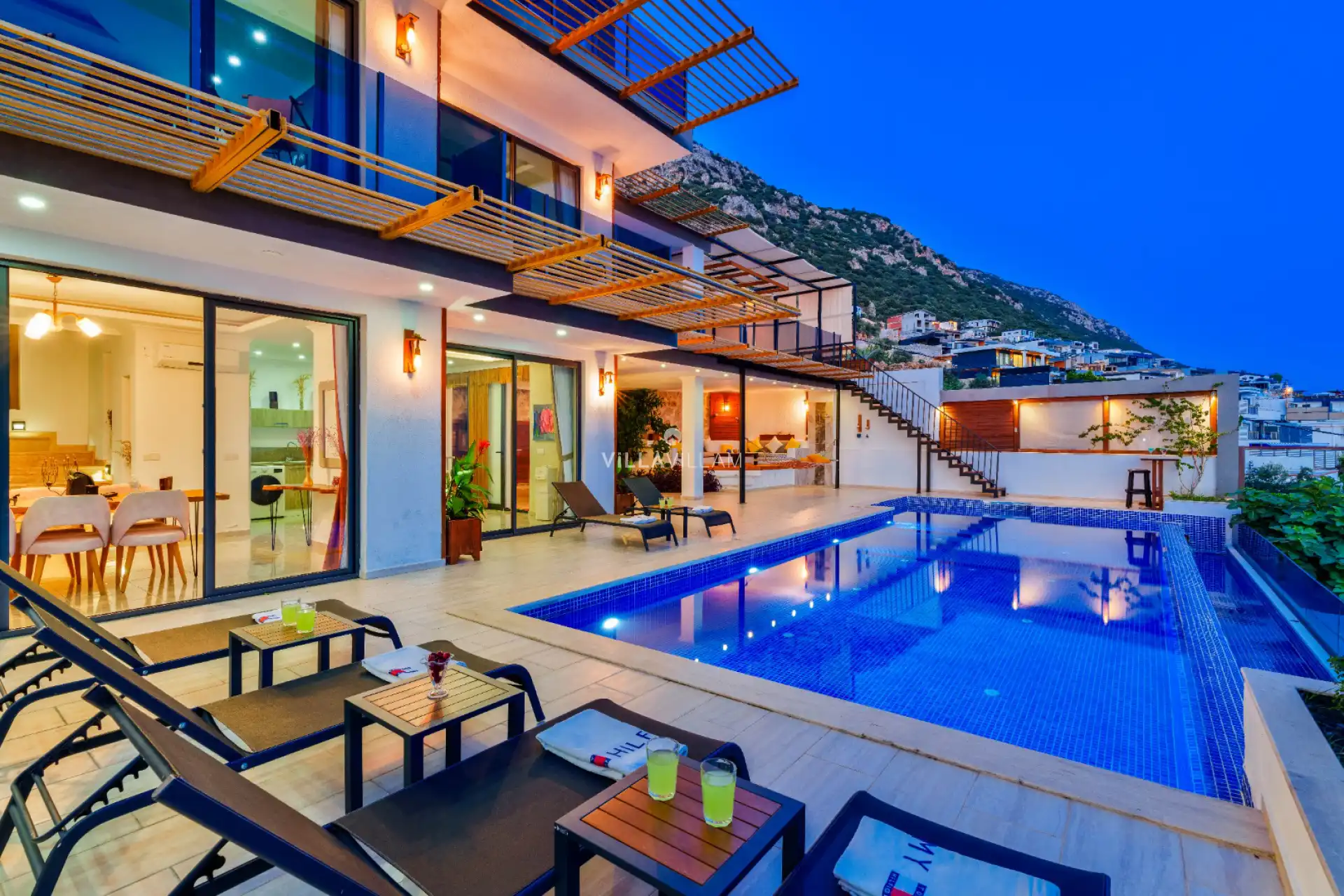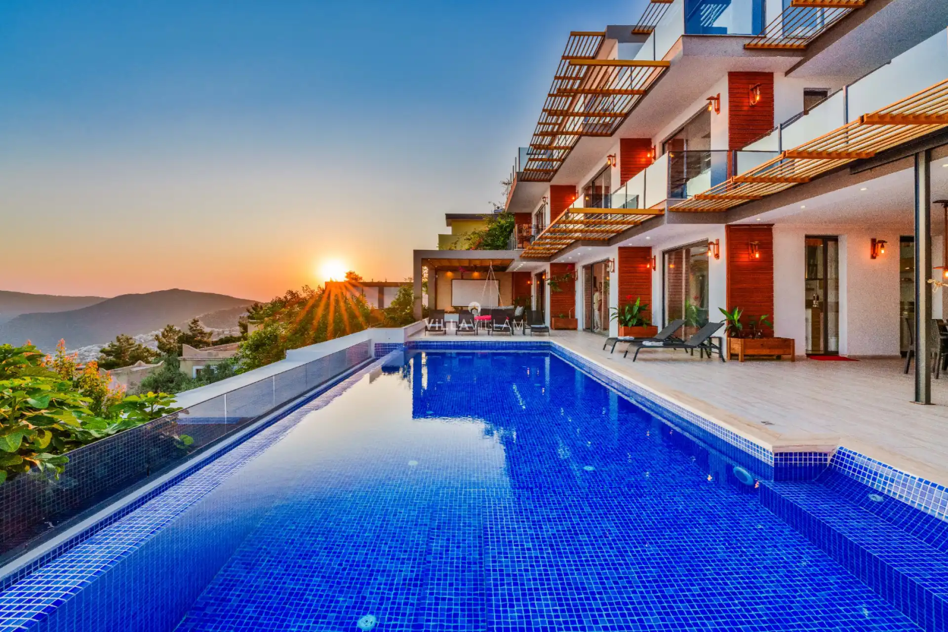 Eşsiz deniz manzarasının ve doğanın içinde modern tasarımı ile dikkatleri üzerine çeken, sevdiklerinizle birlikte güvenli ve huzurlu bir tatilin keyfini sürebileceğiniz, özenle tasarlanmış, yeşilin ve mavinin her tonu ile karşı karşıya kalacağınız villanın havuz terasında şezlong takımı, oturma grubu ve barbekü alanı bulunmaktadır. Sahip olduğu manzara ile sevdikleriniz ve ailenizle muhteşem günbatımları keyifli tatil anıları biriktirmenize olanak sunmaktadır. Havuz terasında masa tenisi, barbekü alanı, salıncak, oturma grubu ve şezlong bulunmakta ve havuz terasına açılan konforlu oturma odası ve donanımlı açık mutfağı; birinci yatak odasında çift kişilik yatak, ebeveyn banyosu ve fransız küvet; ikinci yatak odasında iki tek kişilik yatak ve banyo; üçüncü ve dördüncü yatak odalarında bir çift kişilik yatak ve banyo bulunmaktadır.