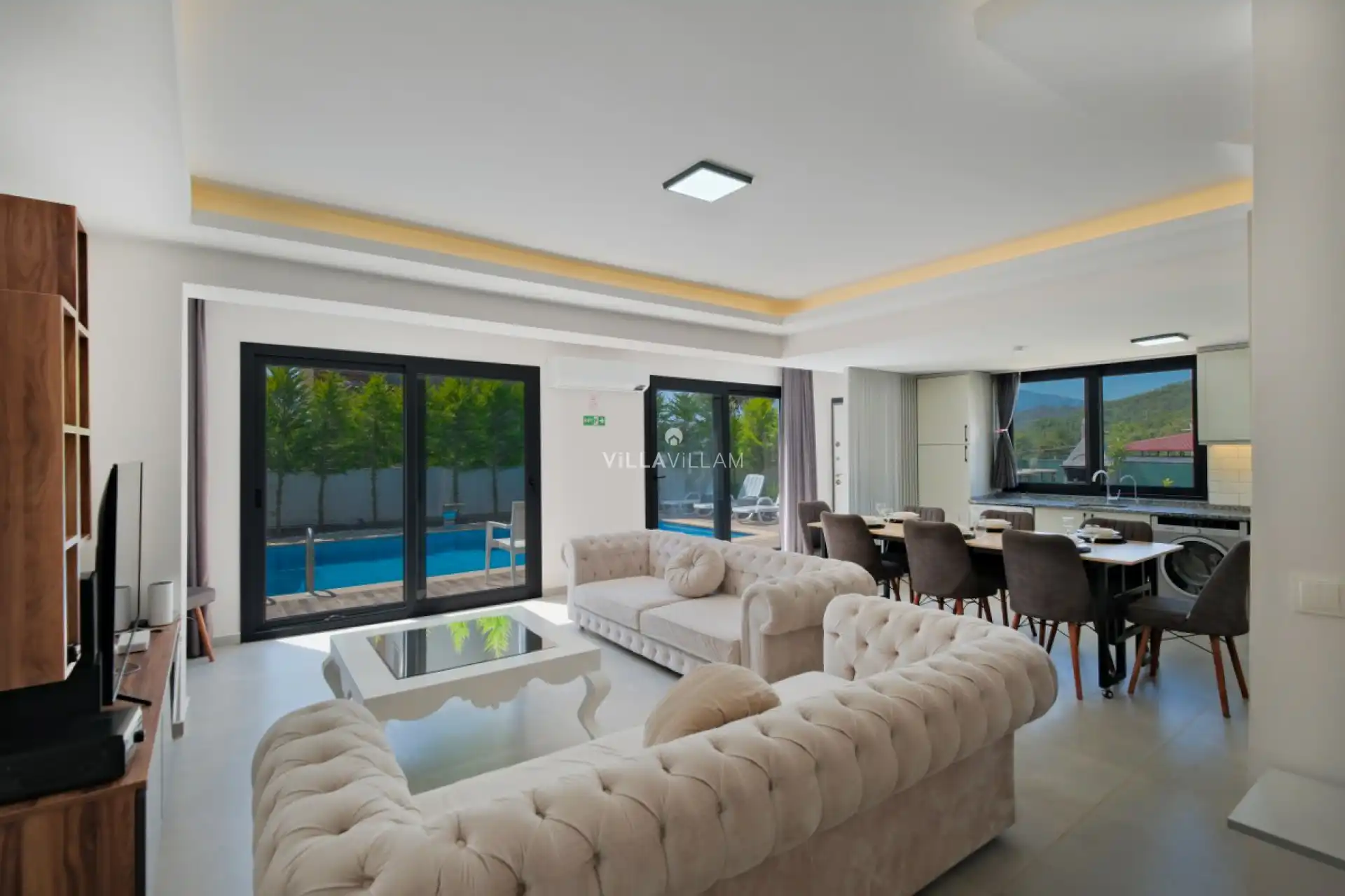 Havuz terasında ki jakuzide keyifli vakit geçirebilir, iç mekan alanları da ferah bir atmosfer sunan villamız temel donanımları ile beklentilerinize net cevap verebilecek nitelikte olup tüm mobilyaları konforunuz gözetilerek hizmetinize sunulmuştur. Aileniz ve sevdiklerinizle birlikte en özel tatil anılarınıza ev sahipliği yapacak olan villa siz değerli misafirlerimizi beklemektedir.