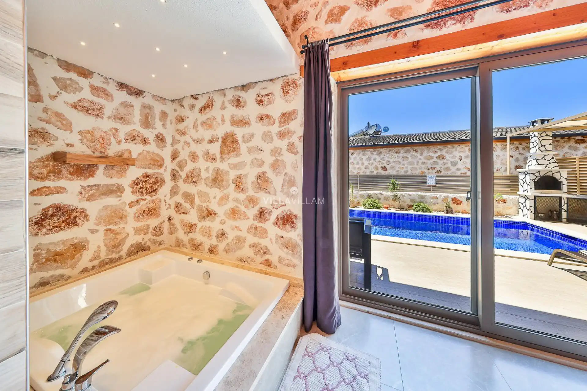 Taş ve ahşap ile tasarlanmış olan villada öncelik sizin konforunuzdu! Villada, keyifli detaylarla donatılmış iç mekân sizi bekliyor. Burada ayrıcalıklı bir tatil deneyimi yaşayabilirsiniz.
