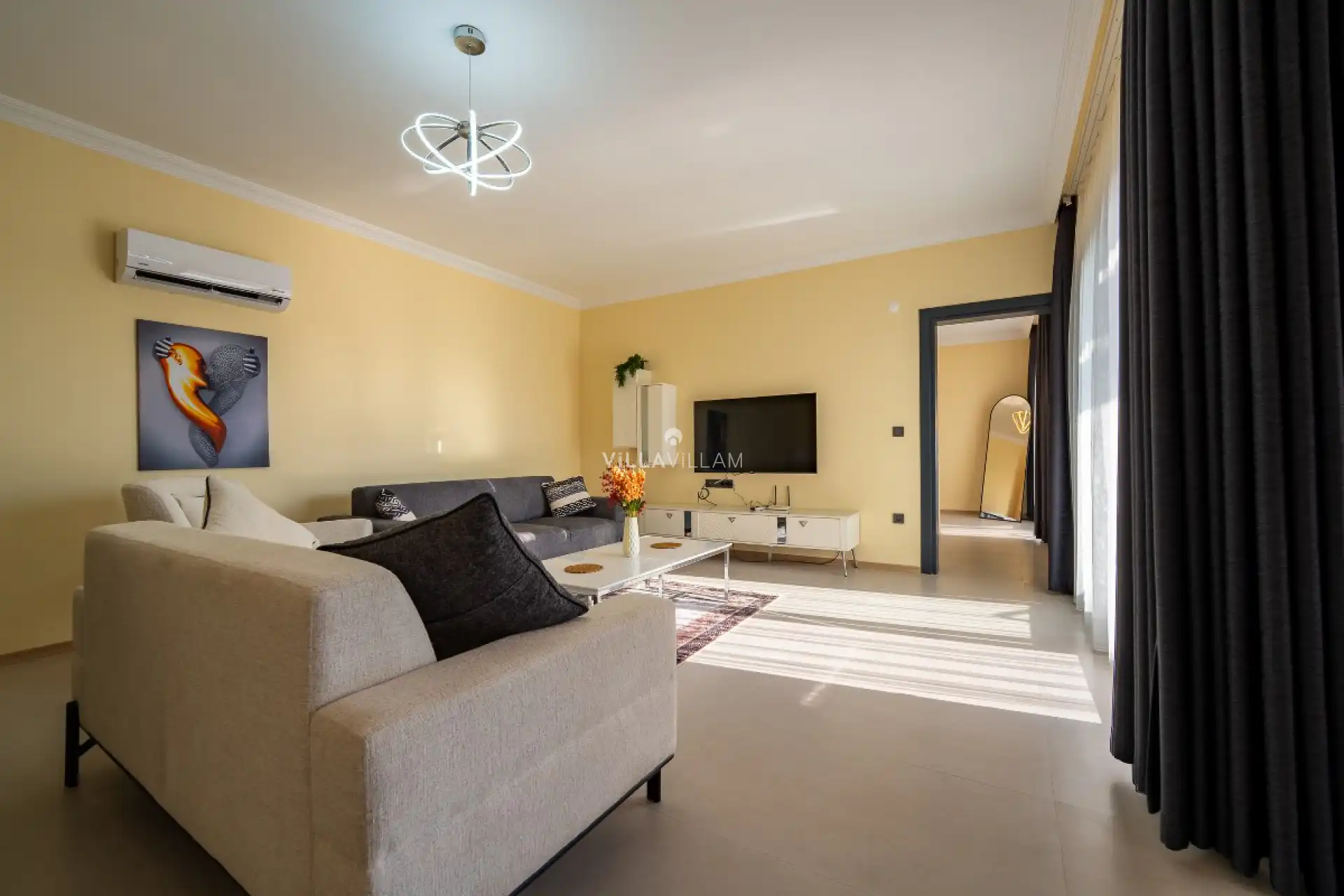 Korunaklı yapıya sahip dış mekanda, kapasiteye uygun şezlong takımı, oturma grubu, masa tenisi ve barbekü alanı yer alırken, İç mekanda konforlu oturma odası, ihtiyaçlarınızı karşılayacak donanıma sahip mutfağı bulunmaktadır. Birinci yatak odasında çift kişilik yatak, ebeveyn banyosu; ikinci yatak odasındaysa iki tek kişilik yatak, ebeveyn banyosu bulunmaktadır.
