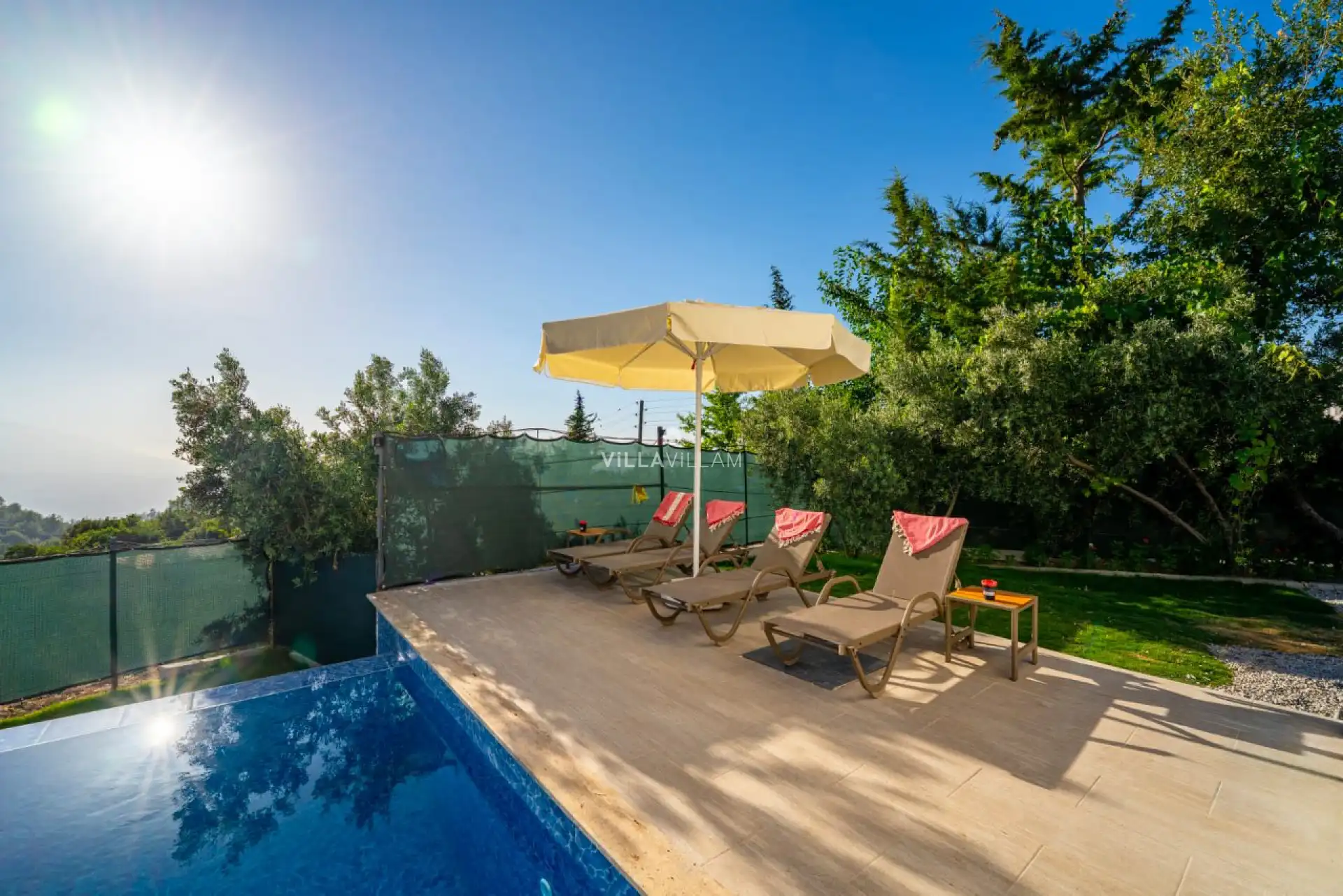 Eşsiz doğanın tadını çıkarabileceğiniz dış mekânda şezlong takımı, oturma grubu, salıncak ve barbekü alanı yer almaktadır. İç mekânda ise havuz terasına açılan ve zevkle döşenmiş konforlu oturma odası ve tam donanımlı mutfak; birinci yatak odasında çift kişilik yatak ve ebeveyn banyosu; ikinci yatak odasında iki tek kişilik yatak ve banyo bulunmaktadır.