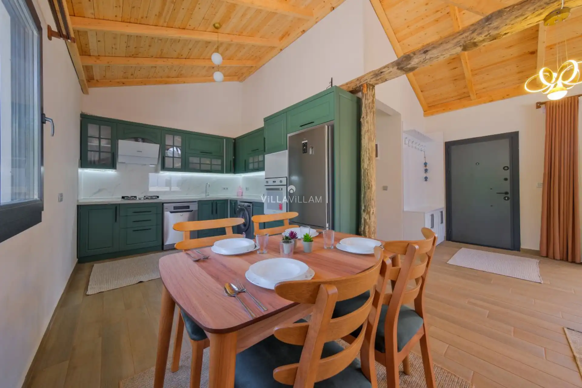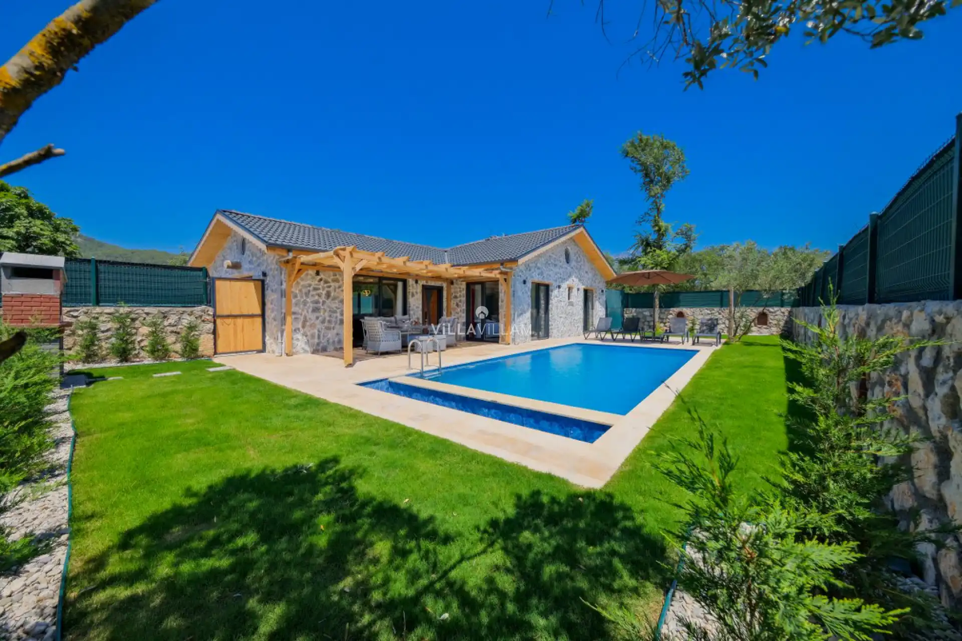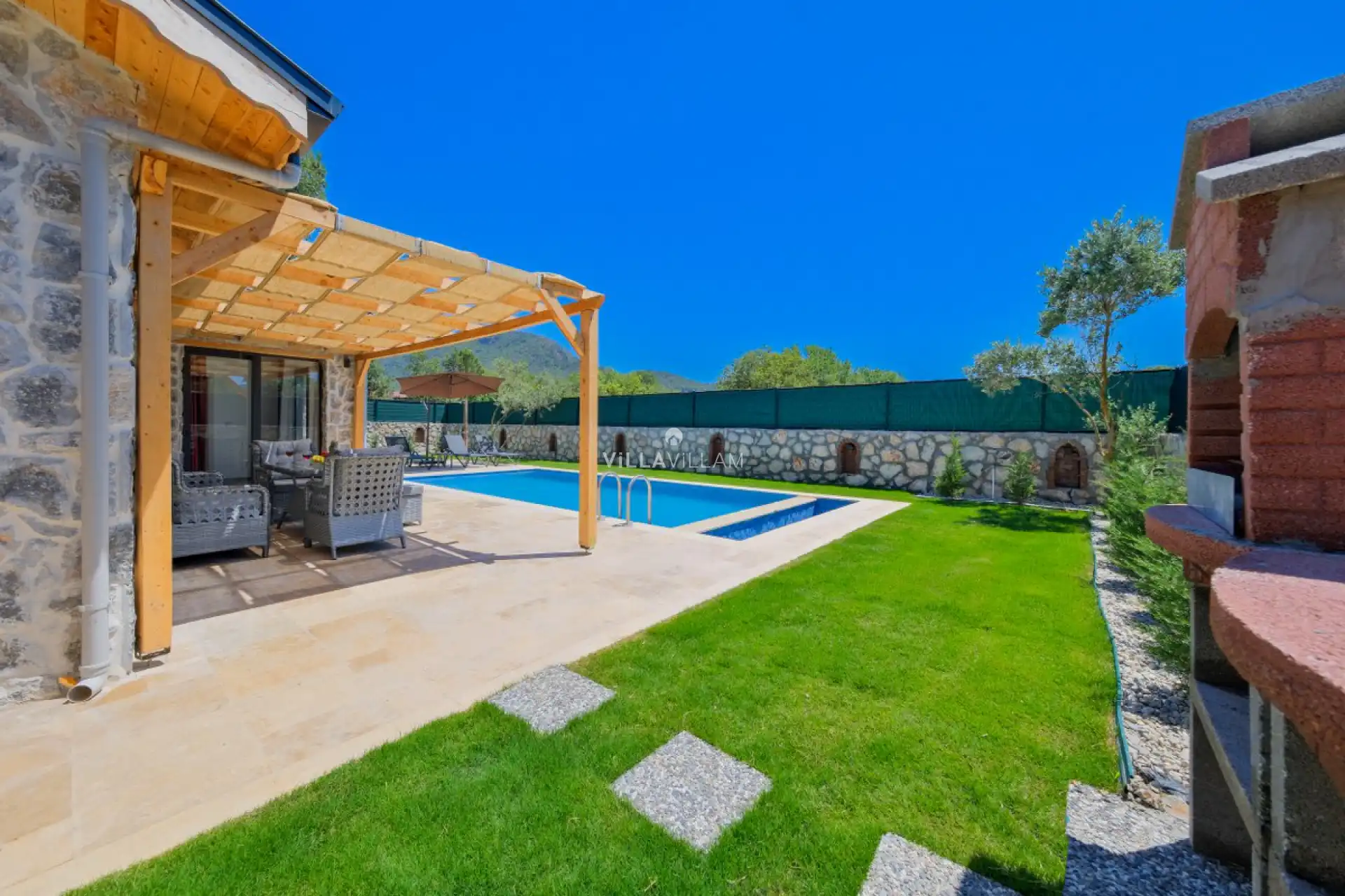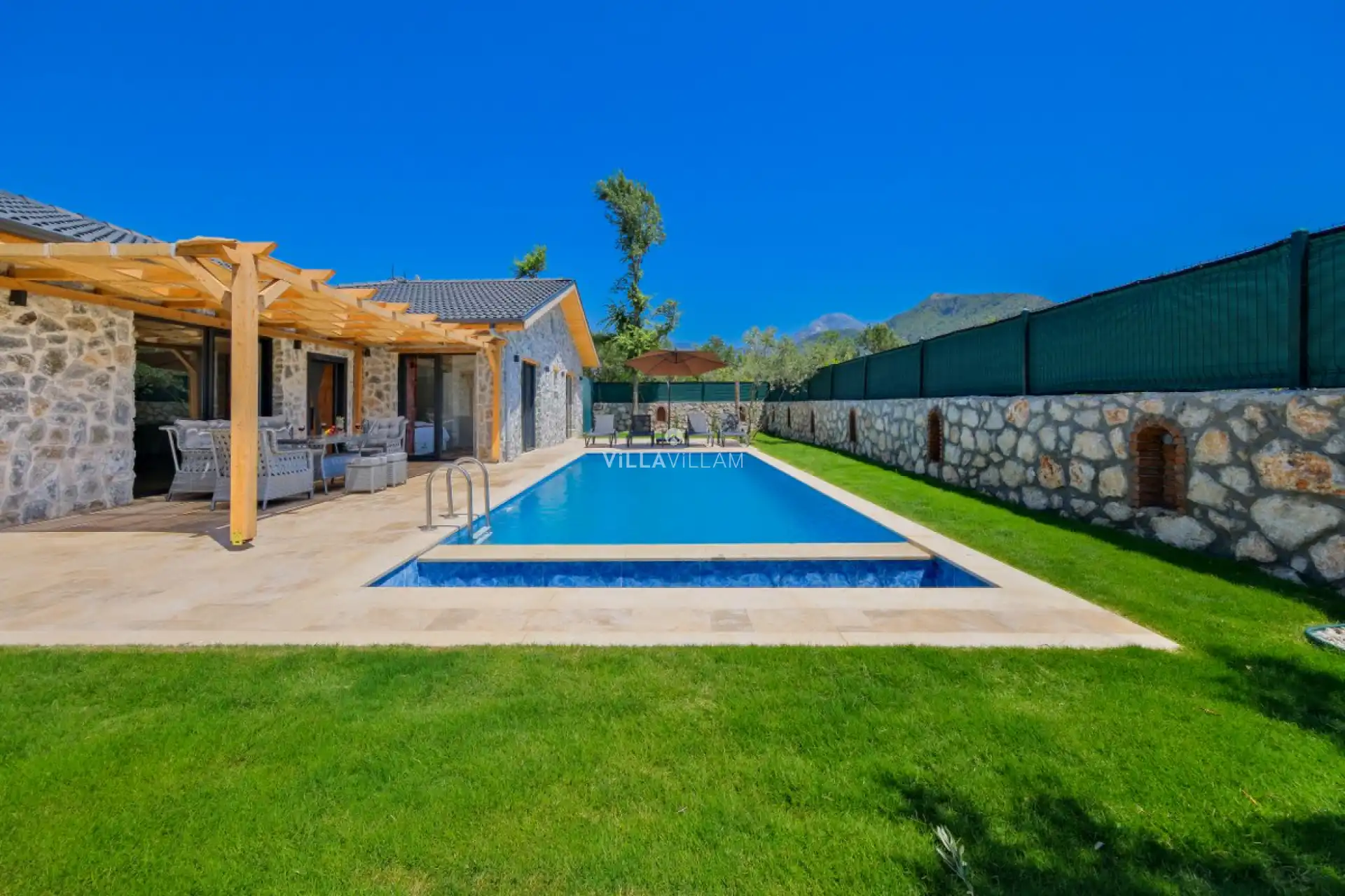 Muhafazakar olan villada doğa manzarasına karşı, güneşlenip yüzebileceğiniz havuz terasında şezlong takımı, oturma grubu ve barbekü alanı bulunan villanın, yine havuz terasına açılan konforlu oturma odası ve tam donanımlı açık mutfağı,birinci yatak odasında çift kişilik yatak ve ebeveyn banyosu  ikinci ve üçüncü yatak odasında iki tek kişilik yatak, ebeveyn banyosu bulunmaktadır. Kayaköy'ün büyülü tarihinde, huzurlu bir tatil sunan villada doğanın ve sakinliğin keyfini sürebileceksiniz.