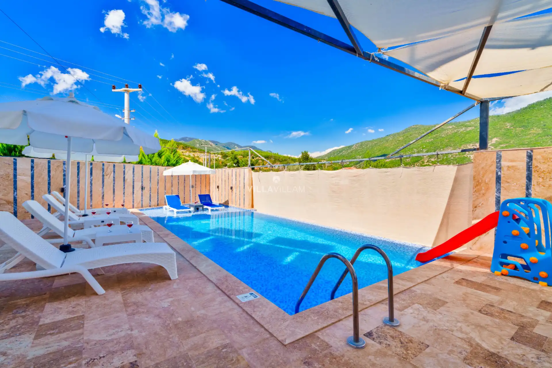 Kalkan İkizce bölgesinde bulunan villa 5 yatak odası ile 10 kişilik konaklama kapasitesi sunmaktadır. Korunaklı havuz alanına sahip villa kalabalık aileler ve arkadaş gruplarının popüler seçenekleri arasında üst sıralarda yer almaktadır.