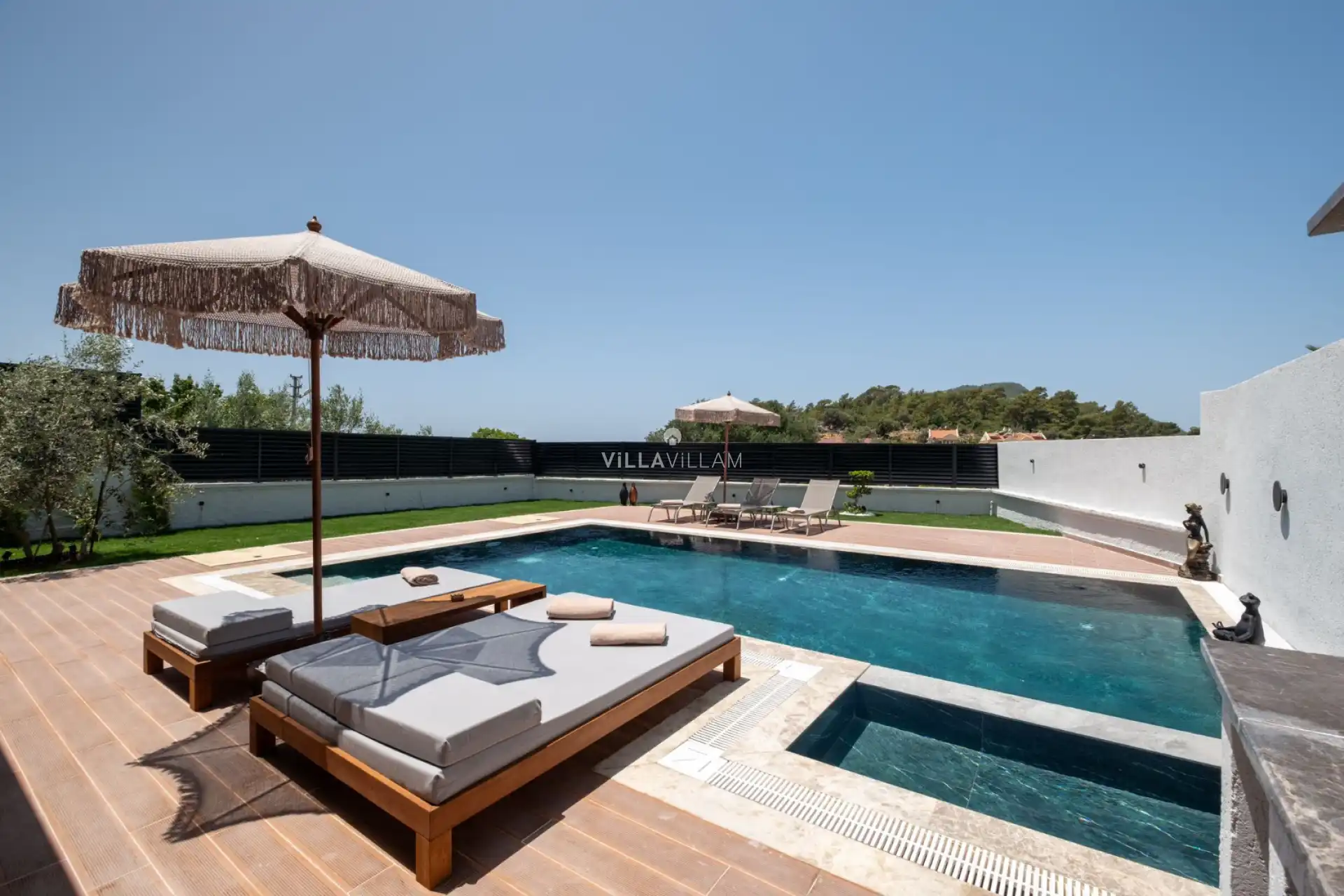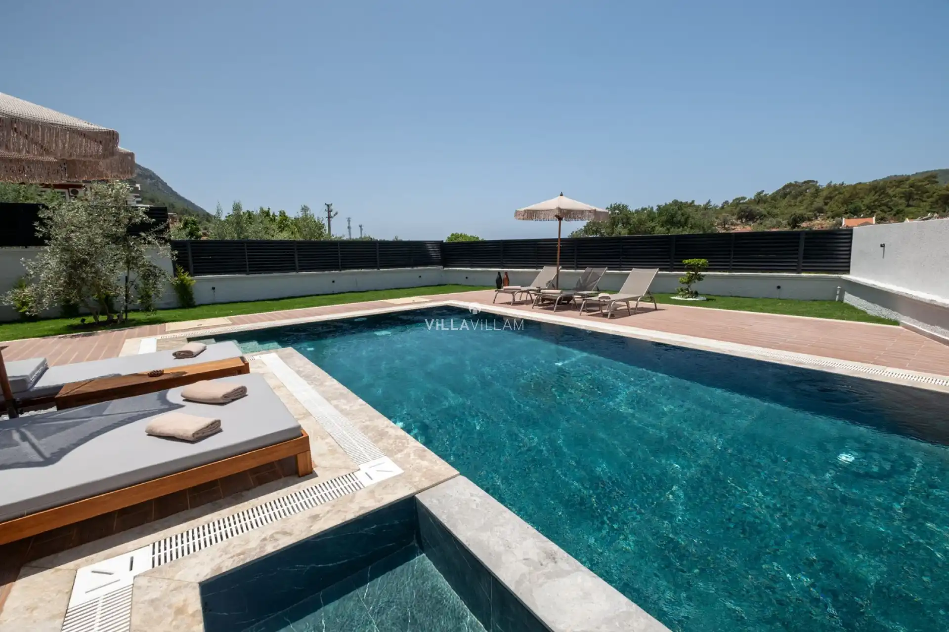 Merkezi konumu sebebiyle popüler seçenekler arasında yer alan villamızın çocuk havuzu da bulunmaktadır. Gün içinde dilerseniz güneşin tadını çıkarıp havuz keyfi yapabilir, dilerseniz de rahatlıkla eşsiz plaj ve koyları ziyaret edebilirsiniz. Havuz ve bahçe alanına açılan salonu ile tam donanımlı açık mutfağı bulunmaktadır. Birinci yatak odasında çift kişilik yatak, Fransız küvet ve banyo; ikinci yatak odasında çift kişilik yatak ve banyo; üçüncü yatak odasında ise iki tek kişilik yatak ve banyo bulunmaktadır. Ayrıca eğlence merkezleri ve restoranlara da yakın olan villamız, tatil beklentilerinize cevap verebilecek seçeneklerimizdendir.