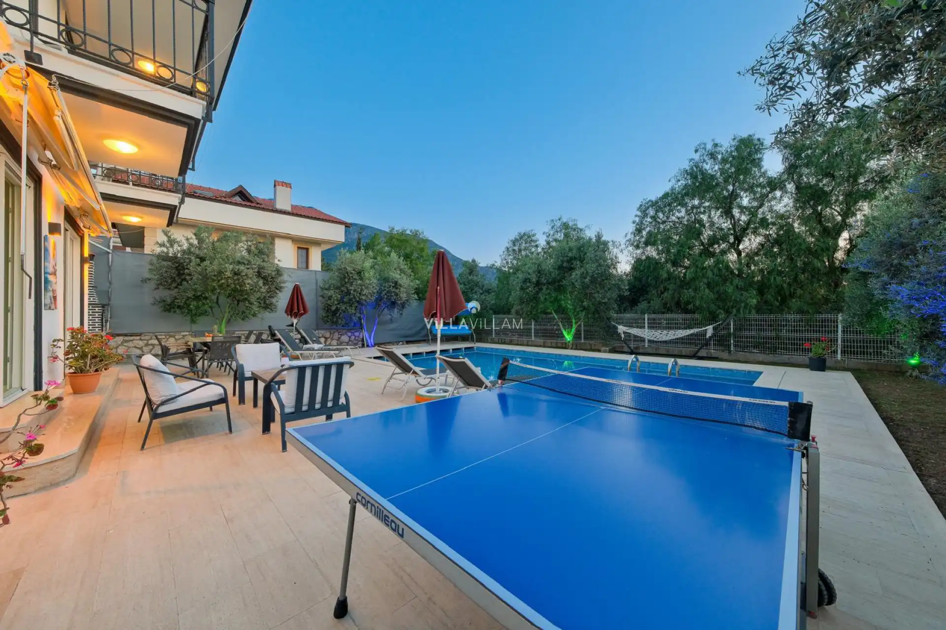 Geniş yapıya sahip havuz terasında şezlong takımı, oturma grubu, salıncak, masa tenisi ve barbekü alanı bulunan villada tatiliniz için her detay düşünülmüştür. İç mekanda konforlu oturma odası ve ihtiyaçlarınızı karşılayacak mutfağı; birinci yatak odasında çift kişilik yatak, kondisyon bisiklet ve ebeveyn banyosu; ikinci yatak odasında çift kişilik yatak ve banyo; üçüncü yatak odasında da iki tek kişilik yatak ve banyo bulunmaktadır.