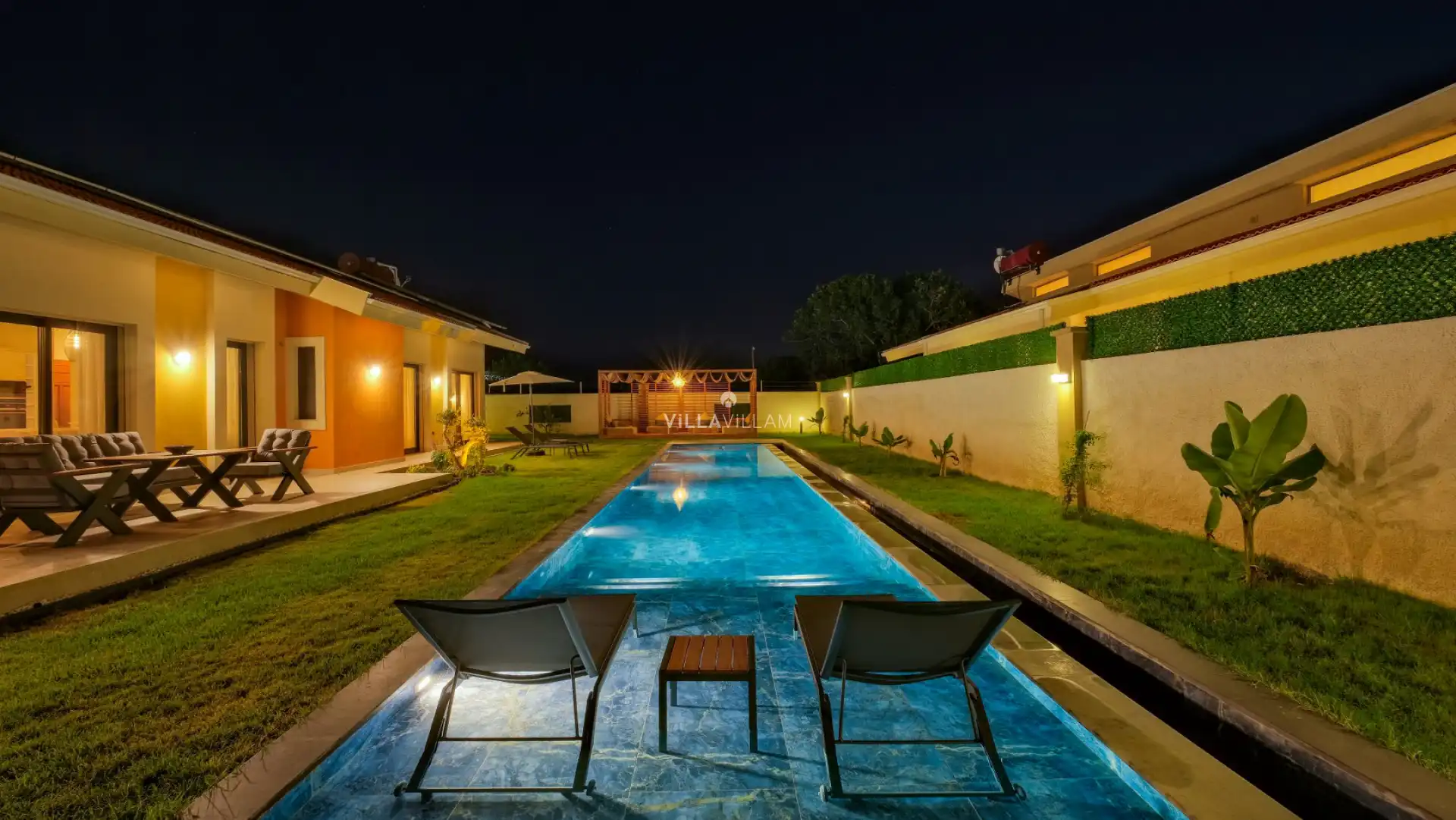 Doğa içinde bulunan villada kapasiteye uygun oturma alanı, şezlong takımı, barbekü alanı ve salıncak; havuz terasına açılan konforlu oturma odası, ihtiyaçlarınızı karşılayacak donanımlı mutfağı bulunmaktadır. Bir yatak odasında çift kişilik yatak, ebeveyn banyosu, jakuzi; diğer yatak odasında iki tek kişilik yatak ve ebeveyn banyosu bulunmaktadır. Şık ve konforu bir arada sunan villa ayrıca 20 Metre uzunluğunda olan bir havuza sahip olup çamaşır kurutma makinesi gibi donanım avantajlarıyla da ön plana çıkmaktadır.