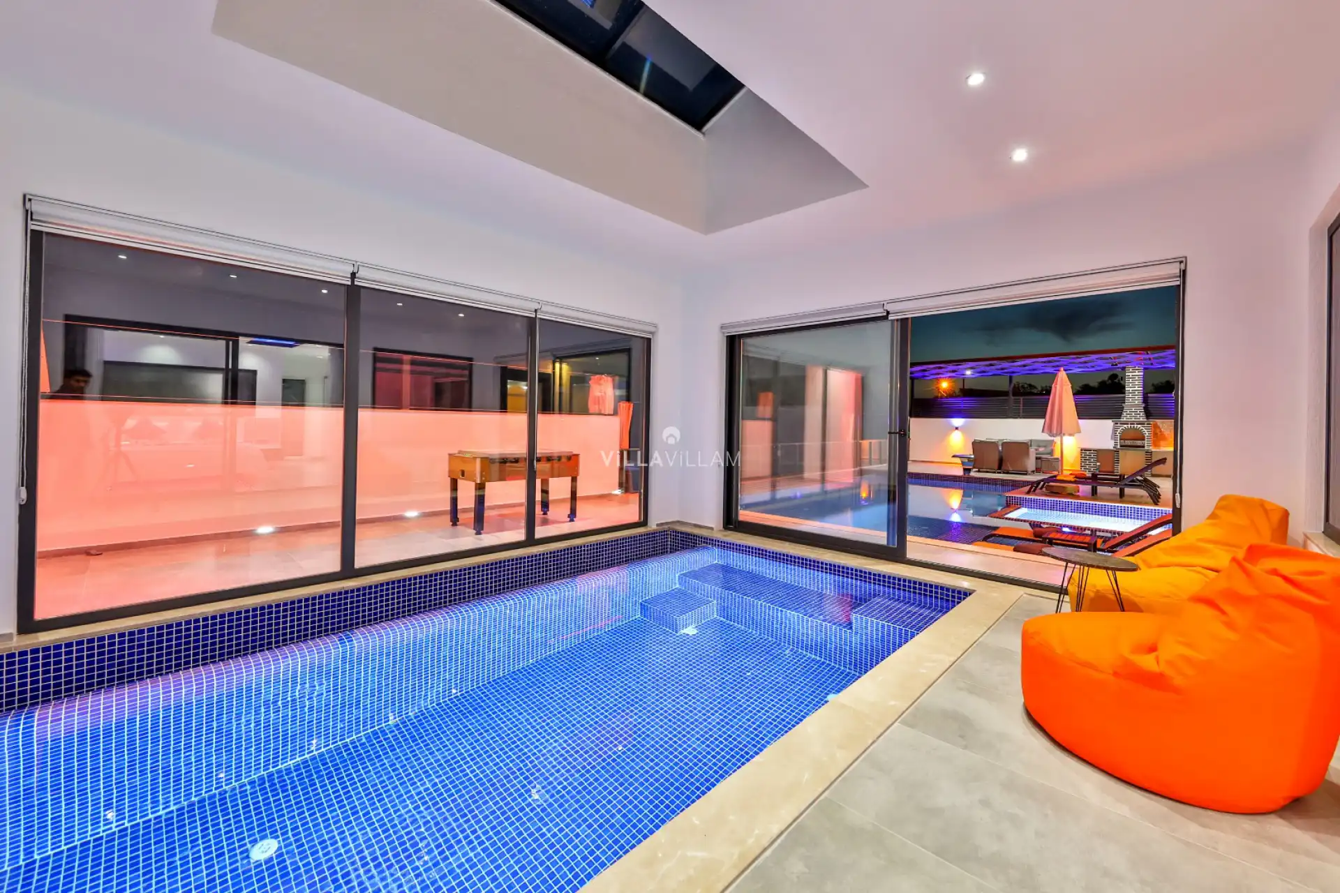Doğa manzaralı, sakin ve huzurlu bir konumu olan villanın havuz bahçe alanında kişi sayısına uygun şezlong takımı, oturma grubu, barbekü ve langırt bulunmaktadır. Havuz alanında yer alan dış mekan jakuzisi, çocuk havuzu olarak da hizmet vermektedir. Yaz kış tatil planlarınıza ev sahipliği yapabilecek özelliklere sahip olan villada kapalı ısıtmalı havuz, sauna, Türk hamamı ve jakuzi bulunmaktadır; böylece yılın her mevsimi tercih edilebilirdir.
