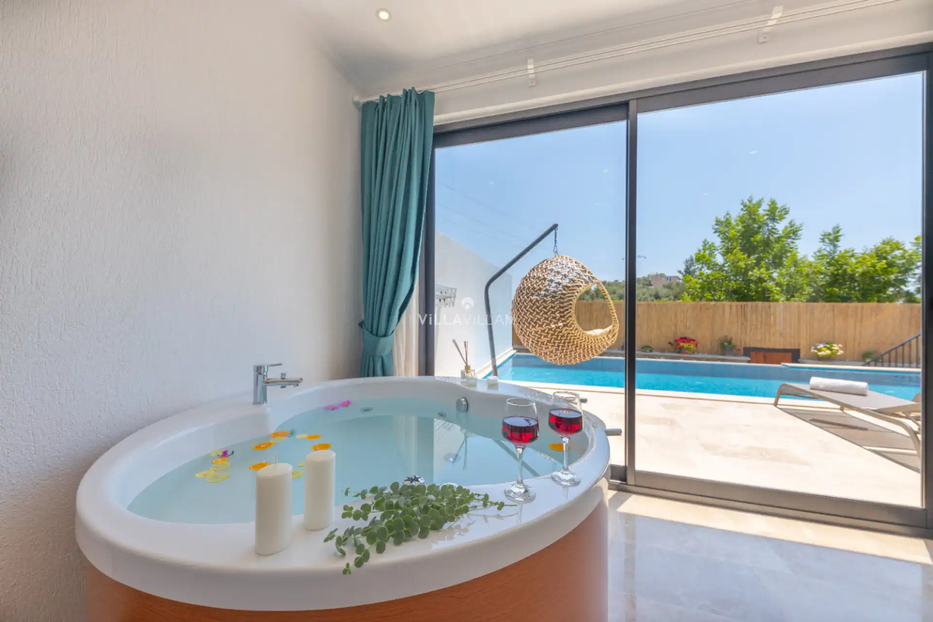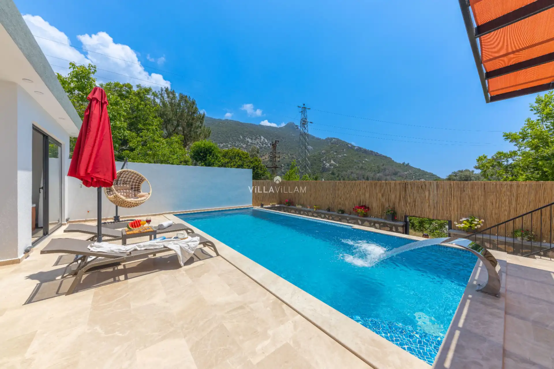 Doğa ile iç içe sevdiklerinizle birlikte güvenli ve huzurlu bir tatilin keyfini sürebileceğiniz, özenle tasarlanmış, yeşilin her tonu ile karşı karşıya kalacağınız villanın havuz terasında şezlong takımı, oturma grubu, salıncak ve barbekü alanı bulunmaktadır. Yine havuz terasına açılan konforlu oturma odası ve donanımlı açık mutfağı; birinci yatak odasında çift kişilik yatak, jakuzi ve banyo bulunmaktadır.