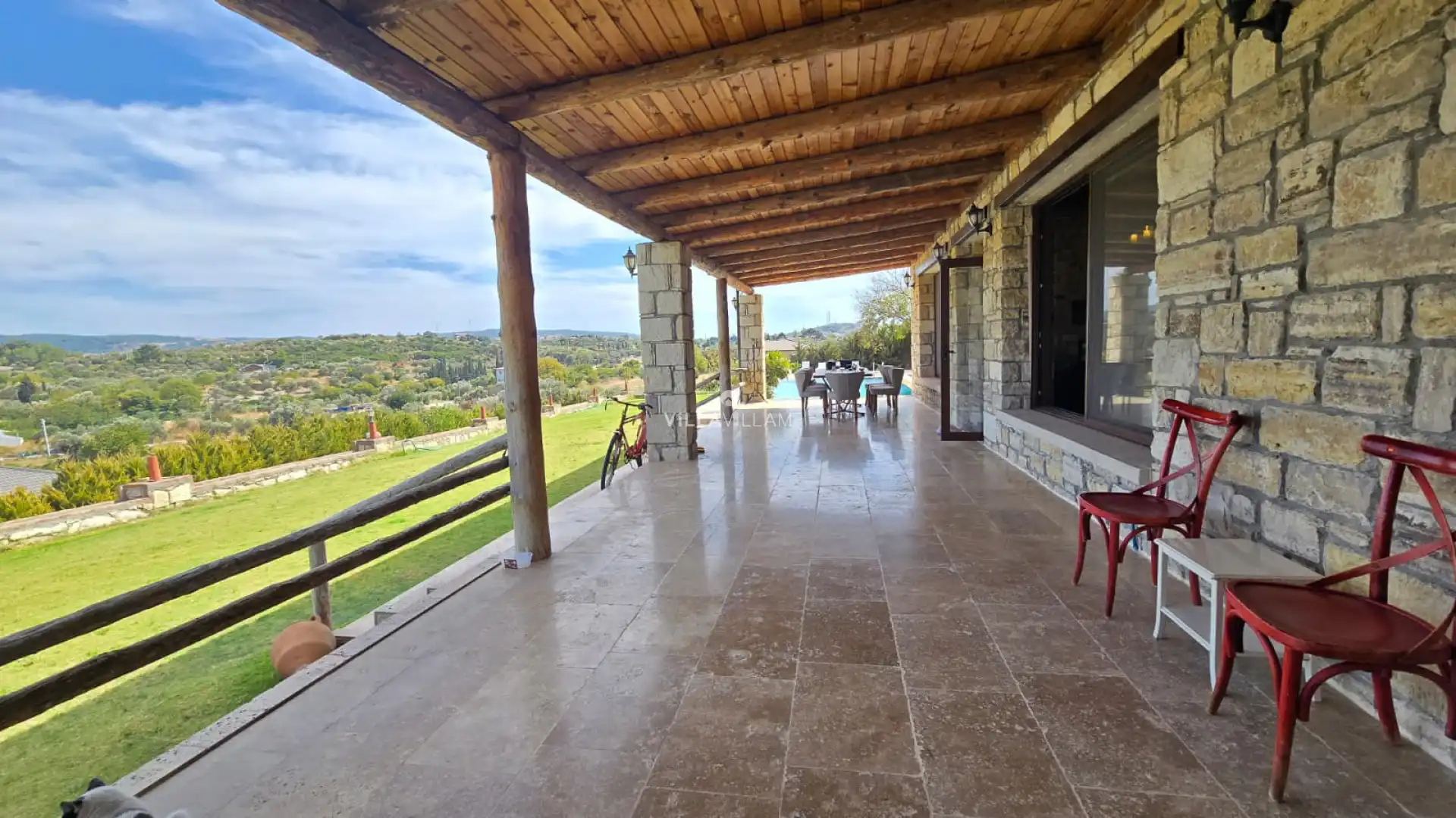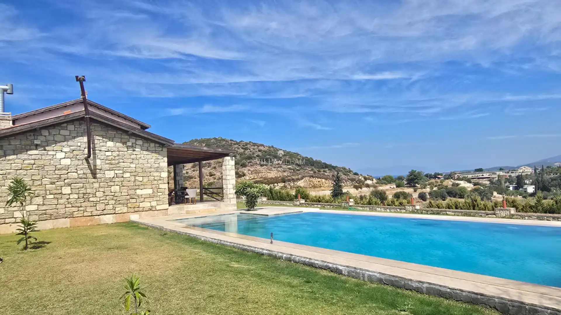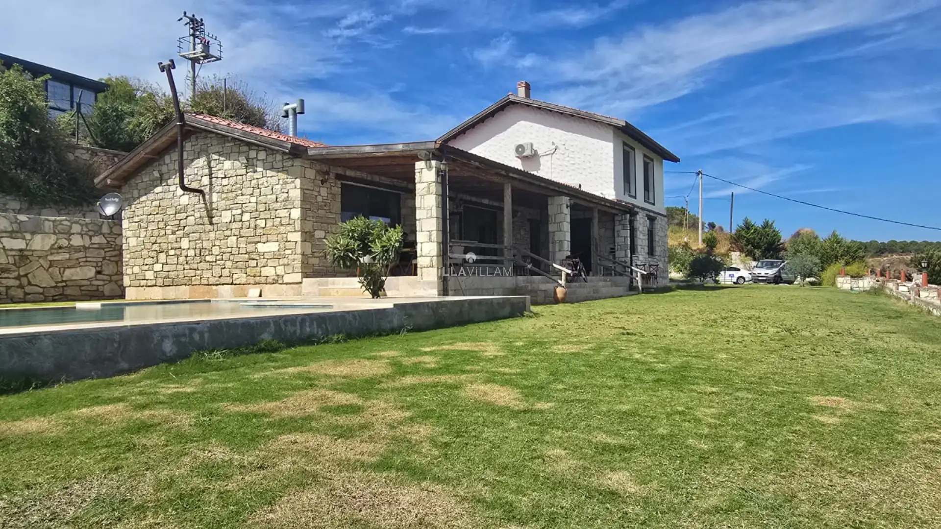 Geniş havuz ve bahçe alanına sahip villada, kapasiteye uygun oturma alanı, şezlong takımı; havuz terasına açılan konforlu oturma odası, ihtiyaçlarınızı karşılayacak donanıma sahip mutfağı bulunmaktadır. Villamızı salonda bulunan şömine ve soba sayesinde kış aylarında da tercih edebilirsiniz. Birinci yatak odasında çift kişilik yatak ve ebeveyn banyosu; ikinci yatak odasında çift kişilik yatak ve ebeveyn banyosu, üçüncü yatak odasında; bir çift kişilik yatak, bir tek kişilik yatak ve ebeveyn banyosu, bulunmaktadır.