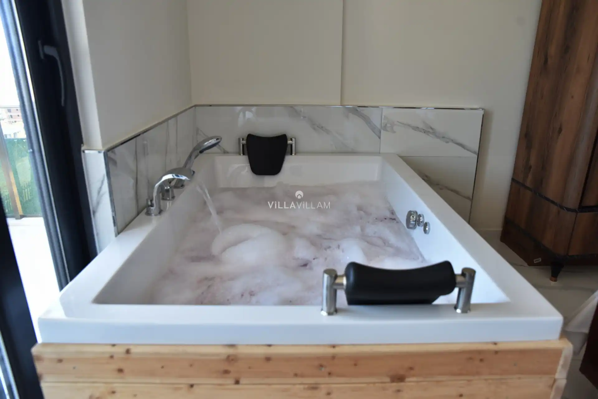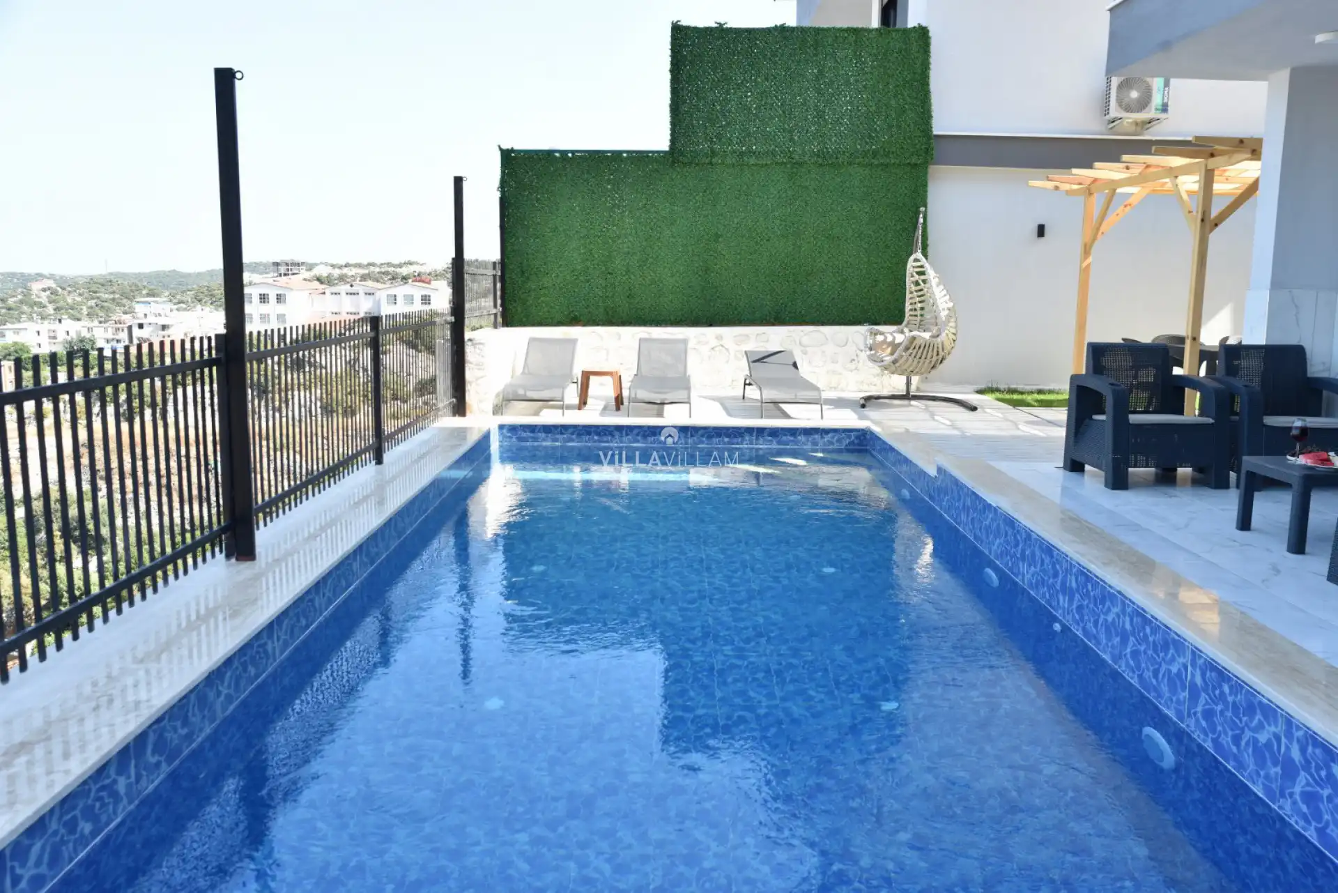 Manzaraya karşı güneşlenip yüzebileceğiniz havuz terasında kapasiteye uygun şezlong takımı ve oturma grubu bulunan villa, konforlu bir tatil imkanı sunmaktadır. Yine havuz terasına açılan oturma odası ve donanımlı açık mutfağı; bir yatak odasında çift kişilik yatak, ebeveyn banyosu ve jakuzi; ikinci yatak odasında çift kişilik yatak ve ebeveyn banyosu; üçüncü yatak odasında ise iki tek kişilik yatak ve ebeveyn banyosu bulunmaktadır.