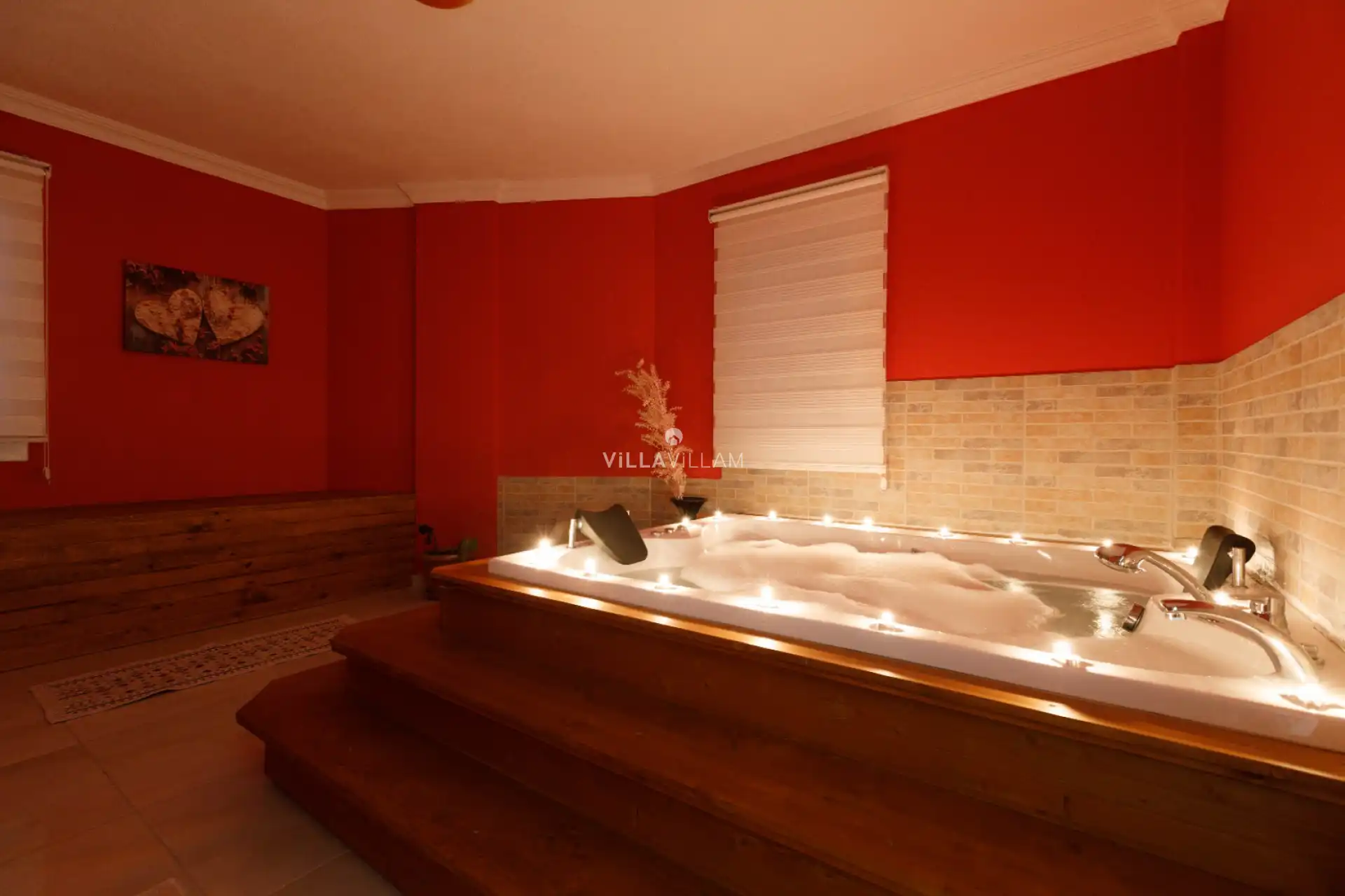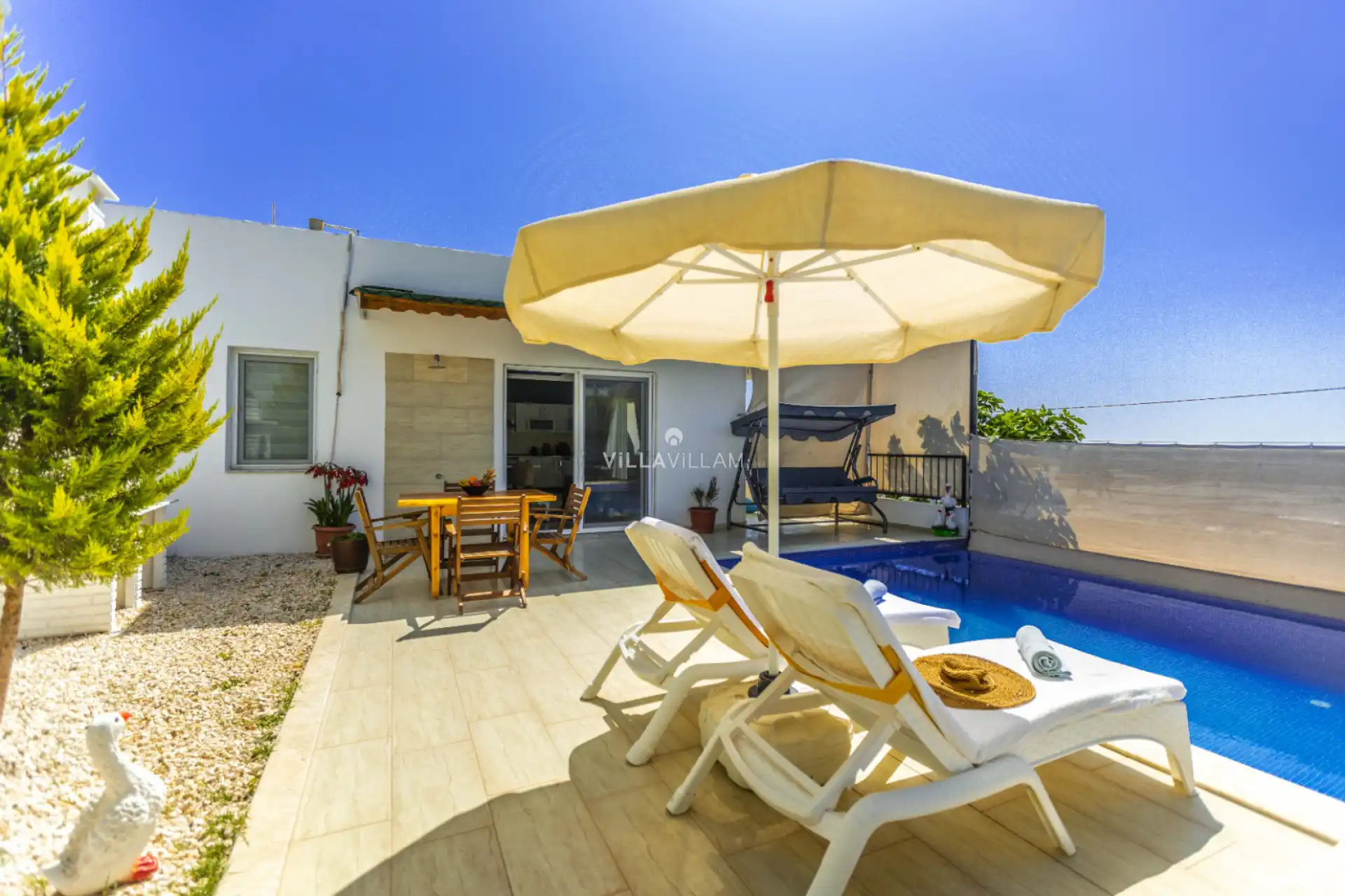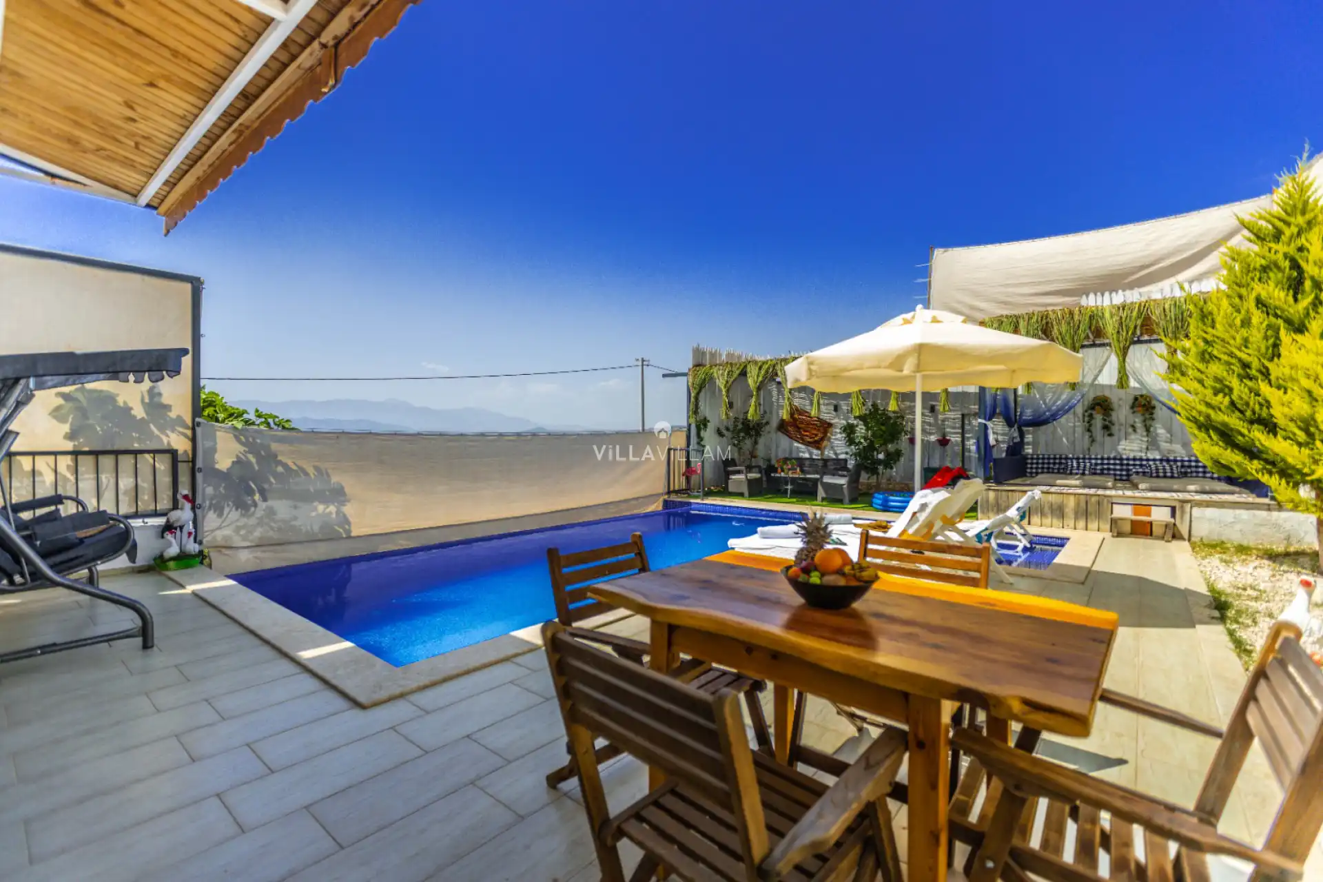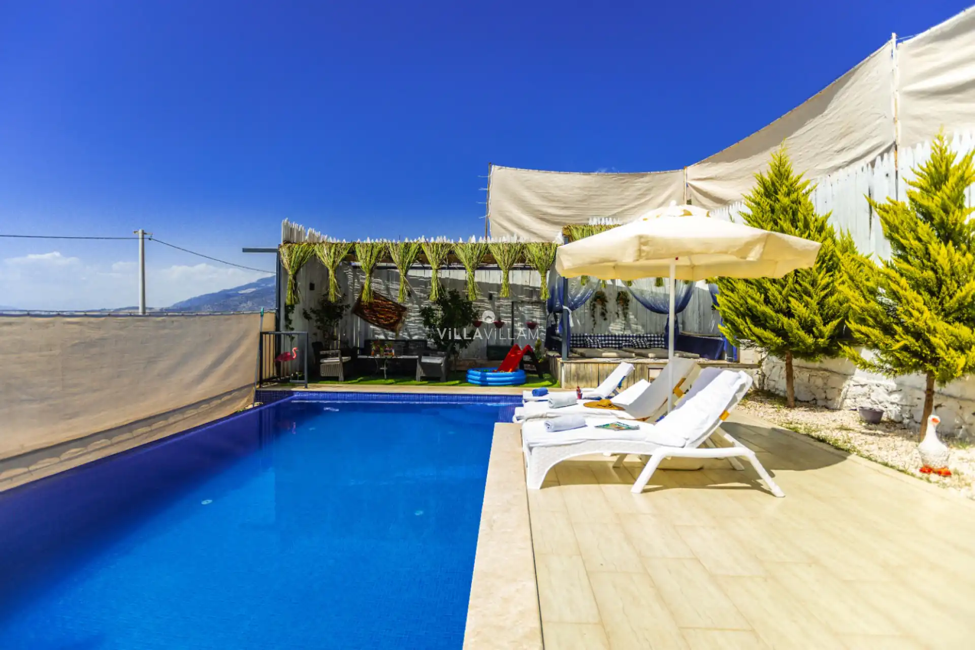 Korunaklı havuz alanına sahip olan villanın doğa içinde konumu sayesinde oksijene doyabileceğiniz, sakin bir tatil sizleri beklemektedir. Havuz terasında kapasiteye uygun şezlong takımı, oturma grubu, barbekü alanı ve çocuk oyun alanı bulunmaktadır. Doğa içinde huzurlu konumunuyla, sizlere keyifli bir tatil için kapı aralamaktadır. Havuz terasına açılan oturma odası donanımlı açık mutfağı bulunan villanın bir yatak odasında çift kişilik yatak,jakuzi ve ebeveyn banyosu; diğer yatak odasında iki tek kişilik yatak bulunmaktadır.
