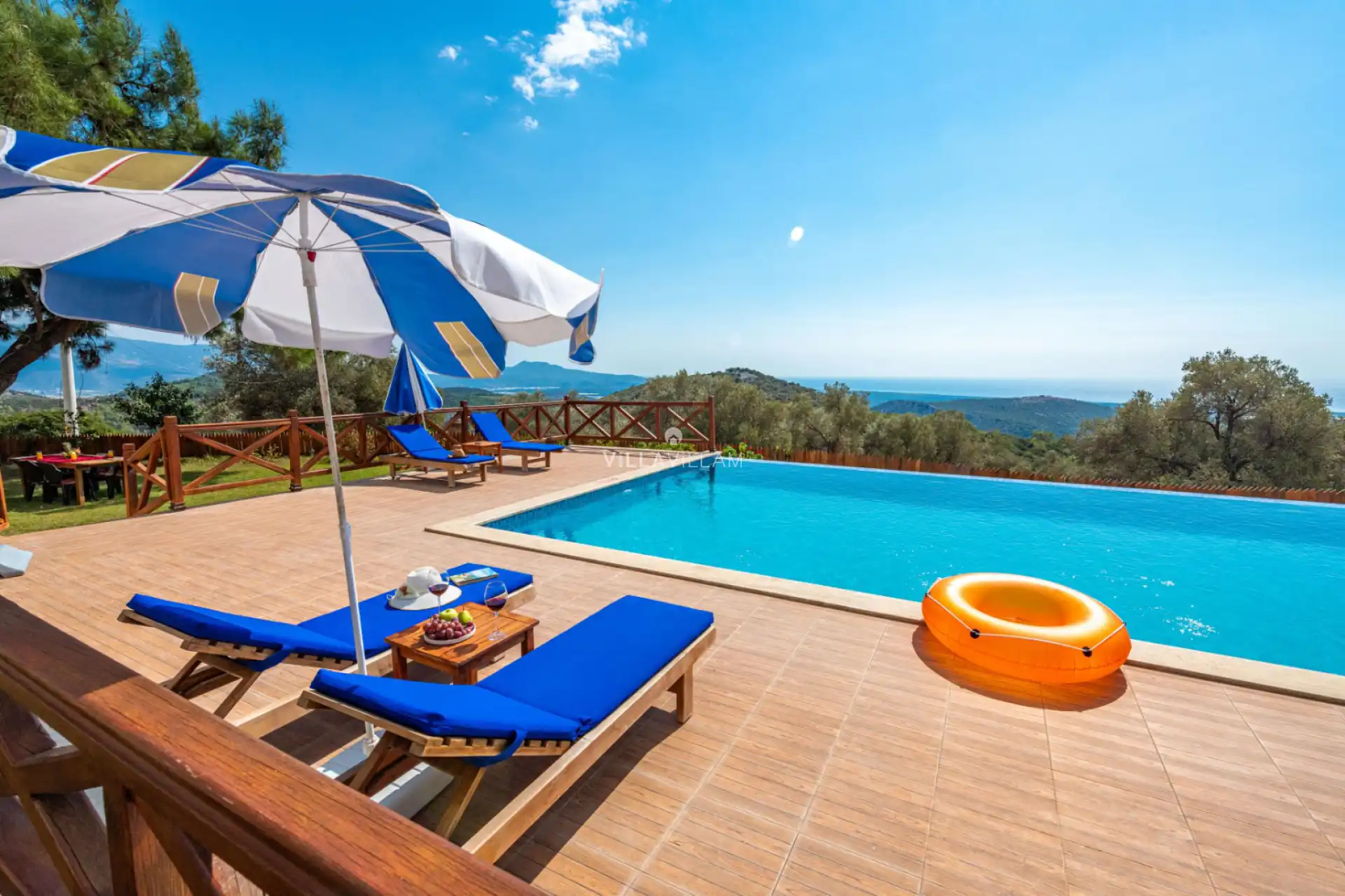 Doğa içinde, huzurlu bir konumu olan villanın havuz bahçe kısmında kapasiteye uygun şezlong takımı, oturma grubu, barbekü alanı; havuz terasına açılan oturma odası, tam donanımlı açık mutfağı bulunmaktadır. Yatak odalarından birinde çift kişilik yatak, ikinci yatak odasında çift kişilik yatak; üçüncü yatak odasında da iki tek kişilik yatak bulunmaktadır.Villanın iki katında da banyo ve WC bulunmakta olup ortak kullanımdır.