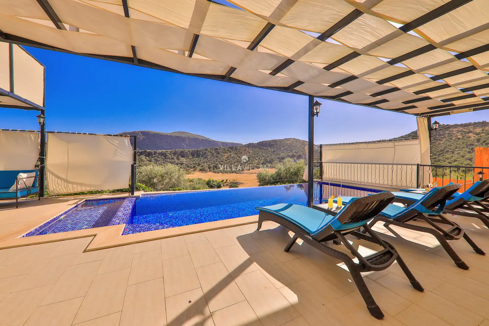 Kalkan'ın muhteşem doğasında içinizi rahatlatacak huzurlu atmosfere sahip geniş bahçe alanında kapasiteye uygun oturma alanı, şezlong takımı, barbekü, salıncak; havuz terasına açılan konforlu oturma odası ve ihtiyaçlarınızı karşılayacak donanıma sahip mutfağı bulunmaktadır. Birinci yatak odasında çift kişilik yatak, ebeveyn banyosu ve jakuzi; ikinci yatak odasında da iki tek kişilik yatak ve ebeveyn banyosu bulunmaktadır.