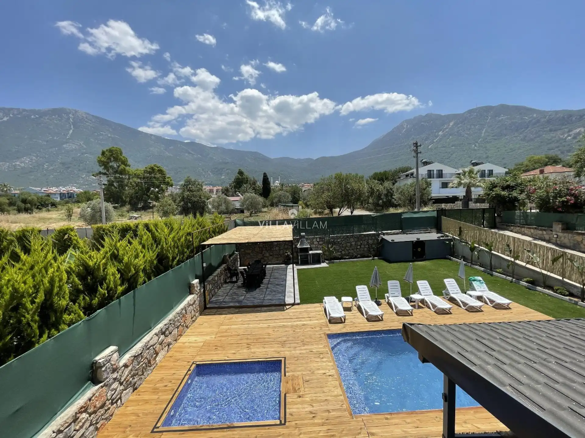 Sevdiklerinizle birlikte güvenli ve huzurlu bir tatilin keyfini sürebileceğiniz, özenle tasarlanmış, yeşilin her tonu ile karşı karşıya kalacağınız villanın havuz terasında şezlong takımı, oturma grubu, salıncak ve barbekü alanı bulunmaktadır. İç mekânda ise özenle dizayn edilmiş konforlu oturma odası ve donanımlı açık mutfak; dört yatak odasında çift kişilik yatak yer alırken, ayrıca iki adet ortak banyo/wc bulunmaktadır.