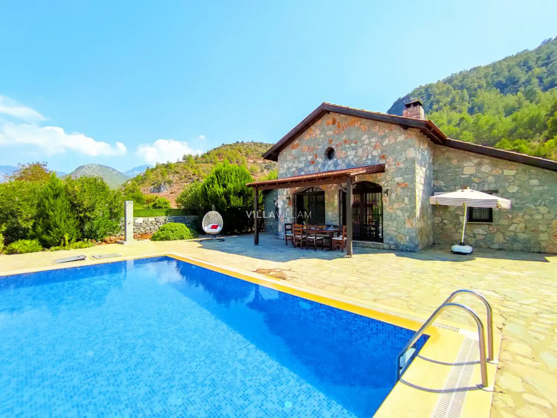 Fethiye Kayaköy'de bulunan villa, 3 yatak odasıyla 6 kişilik konaklama kapasitesi sunmaktadır. Doğa manzarasına hakim, korunaklı havuz alanı ve geniş yaşam alanlarıyla ile ön plana çıkan villa, kalabalık aile ve arkadaş grupları için uygundur.