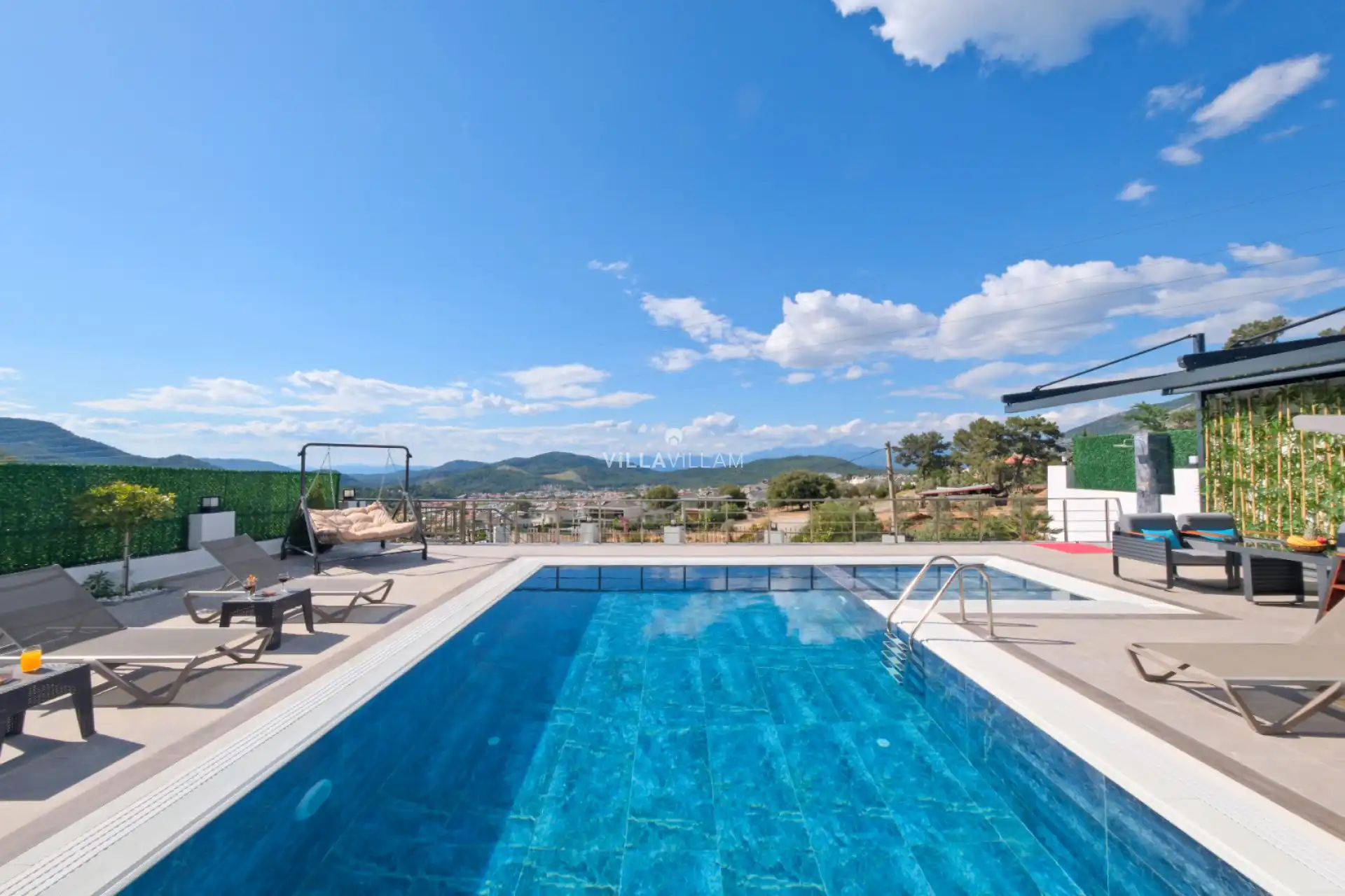 Havuz terasında kapasiteye uygun şezlong takımı, oturma grubu, salıncak ve barbekü alanı bulunan villada rahat bir tatil için her detay düşünülmüştür. Yine havuz terasına açılan konforlu oturma odası ve tam donanımlı açık mutfağı; bir yatak odasında çift kişilik yatak ve ebeveyn banyosu, ikinci yatak odasında çift kişilik yatak ve ebeveyn banyosu, diğer iki yatak odasında ise iki tek kişilik yatak ve banyolar bulunmaktadır. Villa, geniş iç mekânları ve özenle düşünülmüş detayları ile sevdikleriniz ve ailenizle birlikte manzaraya karşı sayısız gün batımı ve sınırsız eğlenceli anlar vadetmektedir.
