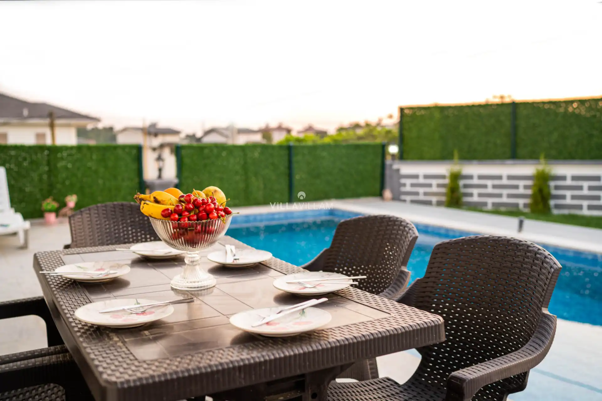 Havuz terasında kapasiteye uygun şezlong takımı, oturma grubu, mangal alanı bulunan villanın iç mekanında ihtiyaçlarınıza karşılık verecek konforlu bir oturma odası, tam donanımlı açık mutfağı; Birinci yatak odasında çift kişilik yatak ve ebeveyn banyosu; İkinci ve Üçüncü yatak odasında çift kişilik yatak; Dördüncü ve beşinci yatak odasında ise iki tek kişilik yatak ve üç adet ortak banyo/wc bulunmaktadır.