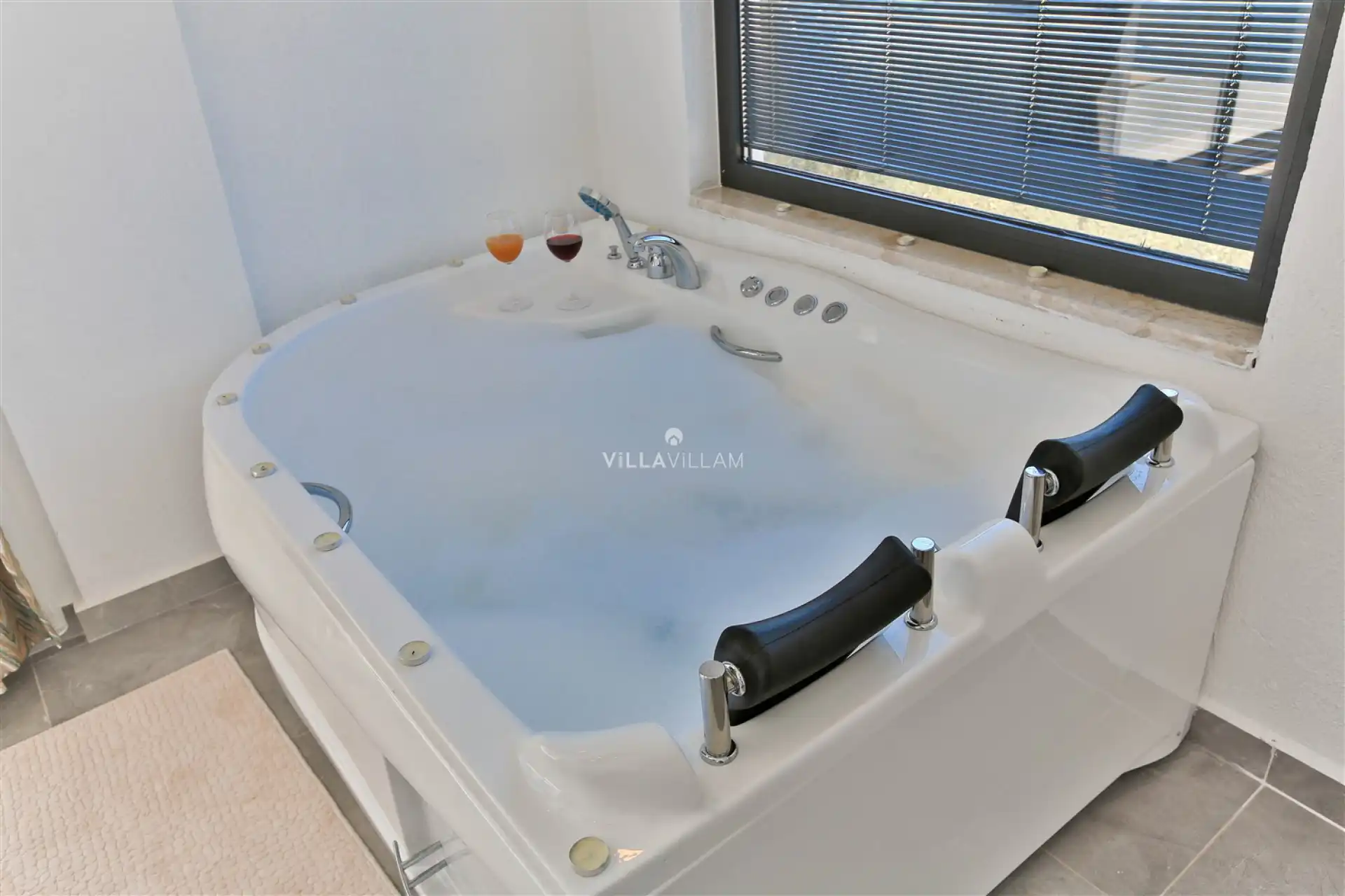 Korunaklı havuz ve bahçe alanına sahip villada kapasiteye uygun oturma alanı, şezlong takımı ve barbekü alanı; havuz terasına açılan konforlu oturma odası ve ihtiyaçlarınızı karşılayacak donanıma sahip mutfağı mevcuttur. Bir yatak odasında çift kişilik yatak, ebeveyn banyosu ve jakuzi; ikinci yatak odasında ise iki tek kişilik yatak, ebeveyn banyosu ve jakuzi yer almaktadır.