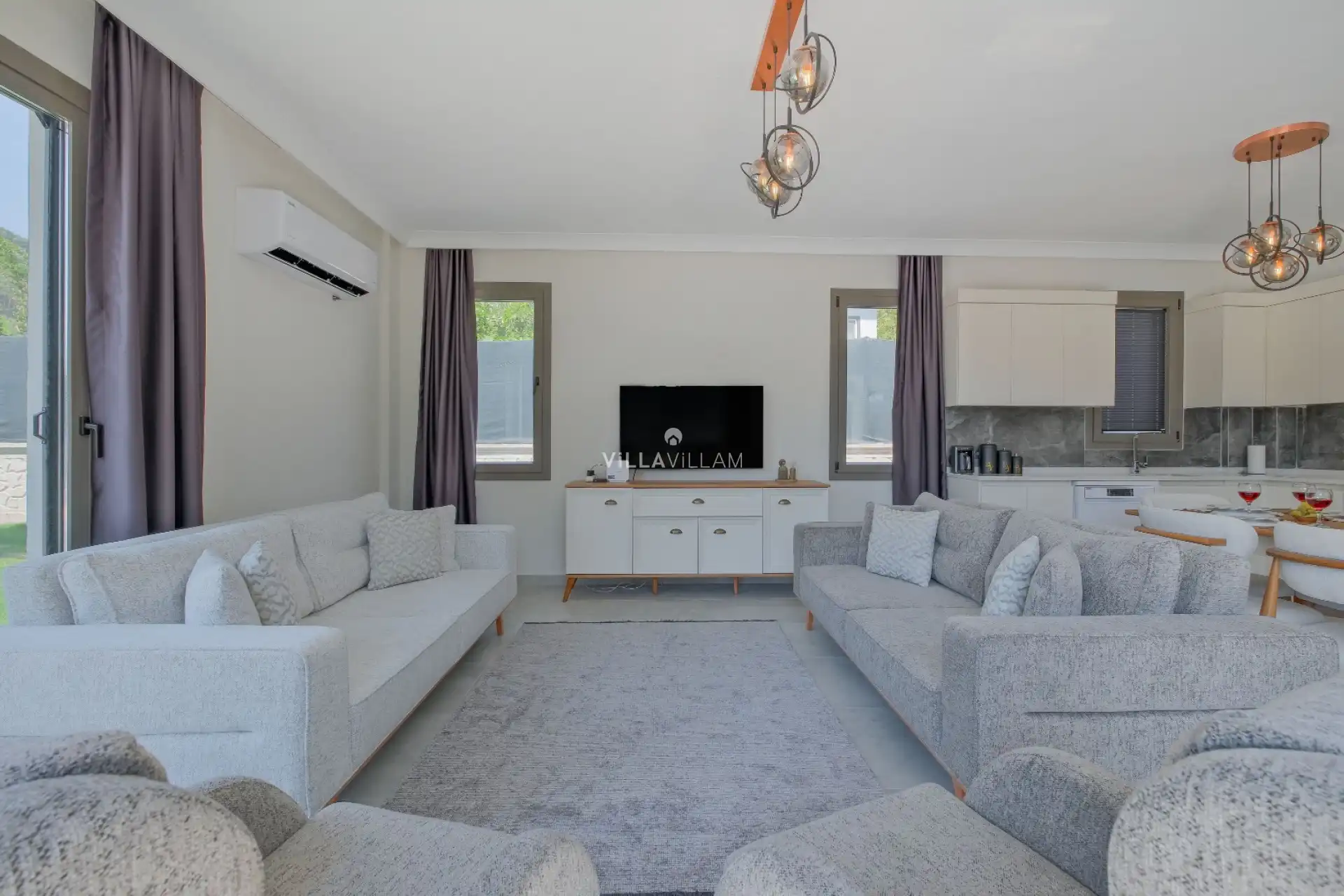Doğanın içinde modern tasarımı ile dikkatleri üzerine çeken, sevdiklerinizle birlikte güvenli ve huzurlu bir tatilin keyfini sürebileceğiniz, özenle tasarlanmış, yeşilin her tonu ile karşı karşıya kalacağınız villanın havuz terasında şezlong takımı, oturma grubu ve barbekü alanı bulunmaktadır. Havuz terasında, barbekü alanı, oturma grubu ve şezlong ve minik misafirleri için düşünülmüş çocuk havuzu bulunmaktadır. Havuz terasına açılan konforlu oturma odası ve donanımlı açık mutfağı; birinci yatak odasında çift kişilik yatak ve ebeveyn banyosu; ikinci yatak odasında, çift kişilik yatak ve ebeveyn banyosu; üçüncü yatak odasında iki tek kişilik yatak bulunmaktadır.