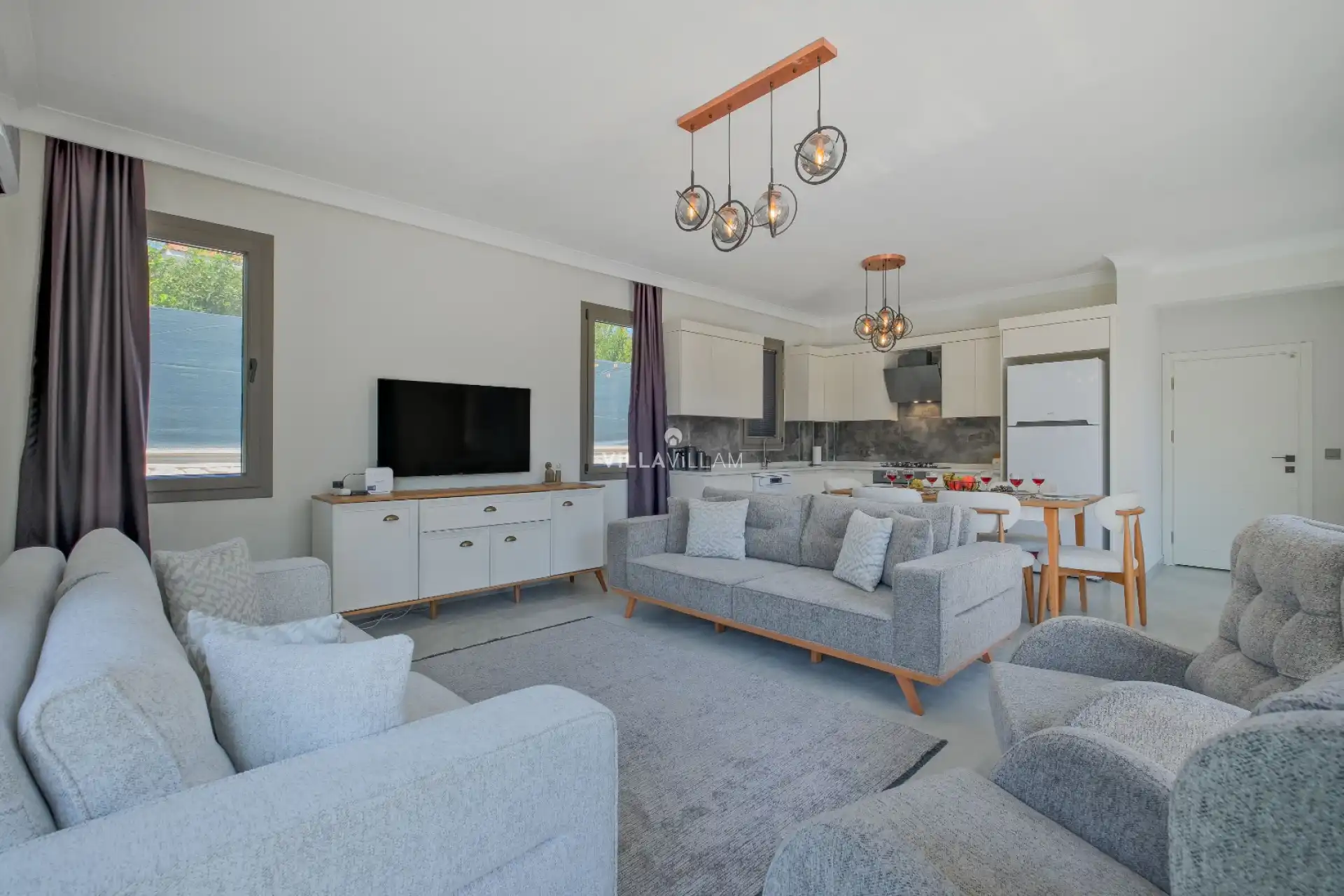Doğanın içinde modern tasarımı ile dikkatleri üzerine çeken, sevdiklerinizle birlikte güvenli ve huzurlu bir tatilin keyfini sürebileceğiniz, özenle tasarlanmış, yeşilin her tonu ile karşı karşıya kalacağınız villanın havuz terasında şezlong takımı, oturma grubu ve barbekü alanı bulunmaktadır. Havuz terasında, barbekü alanı, oturma grubu ve şezlong ve minik misafirleri için düşünülmüş çocuk havuzu bulunmaktadır. Havuz terasına açılan konforlu oturma odası ve donanımlı açık mutfağı; birinci yatak odasında çift kişilik yatak ve ebeveyn banyosu; ikinci yatak odasında, çift kişilik yatak ve ebeveyn banyosu; üçüncü yatak odasında iki tek kişilik yatak bulunmaktadır.