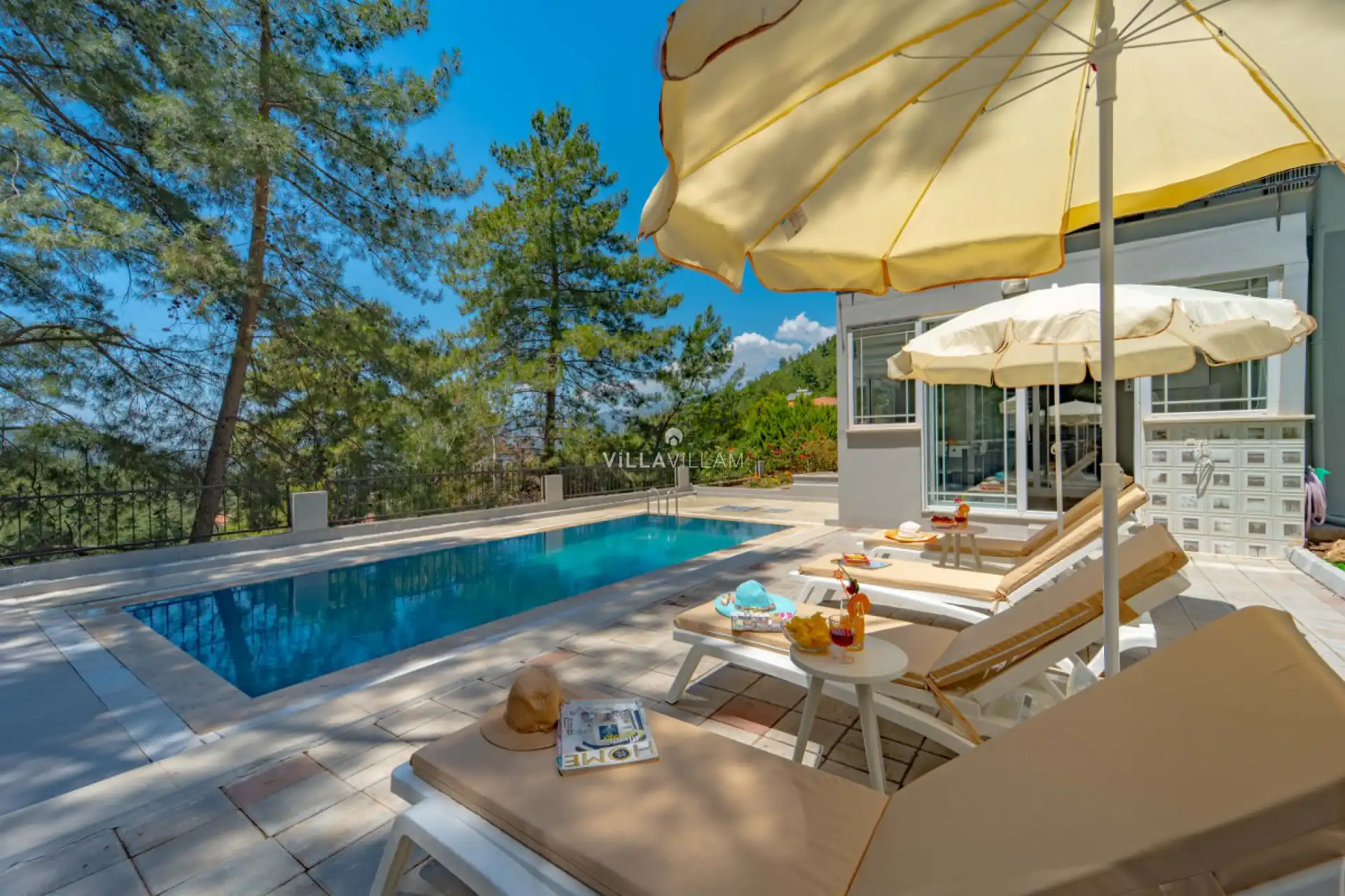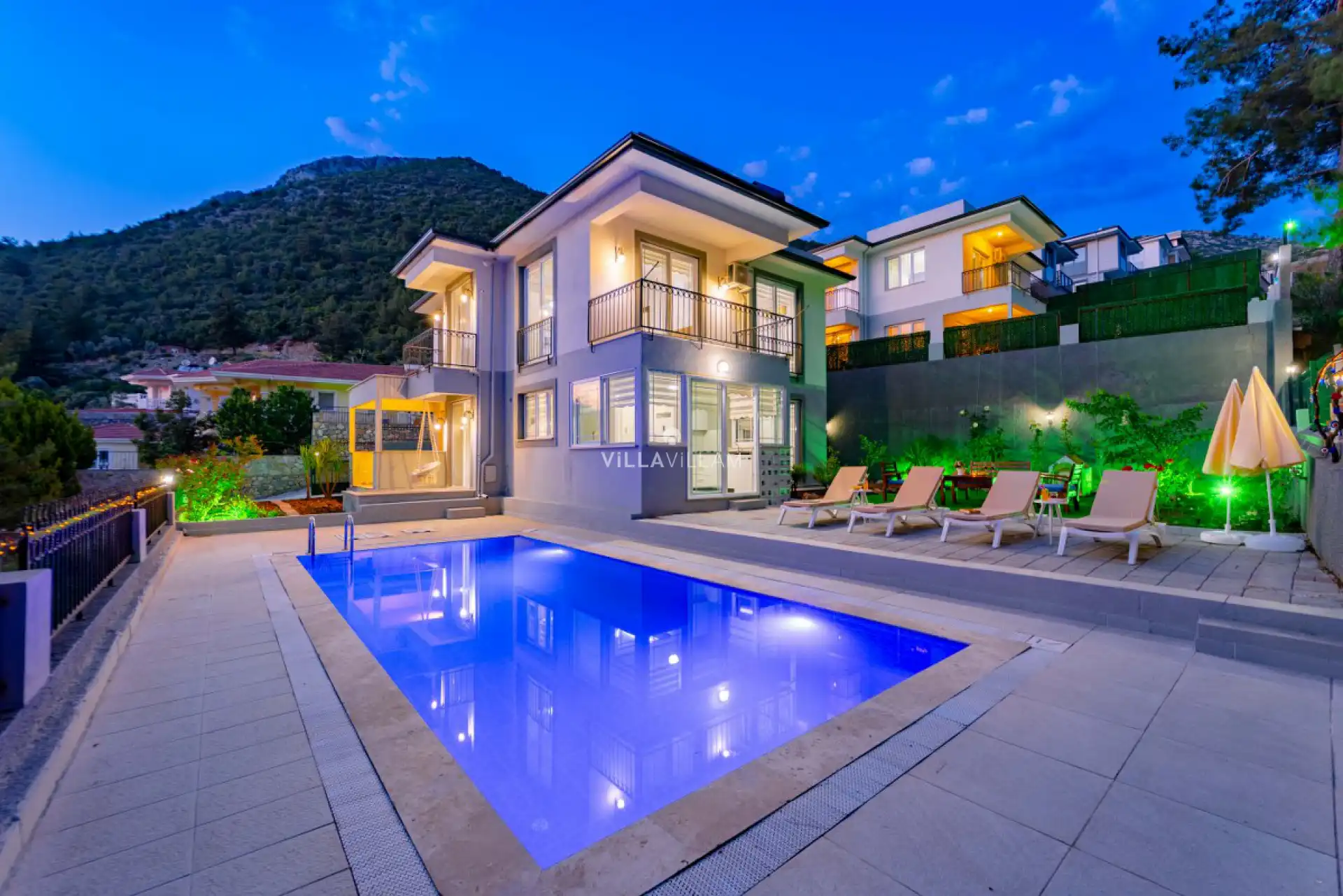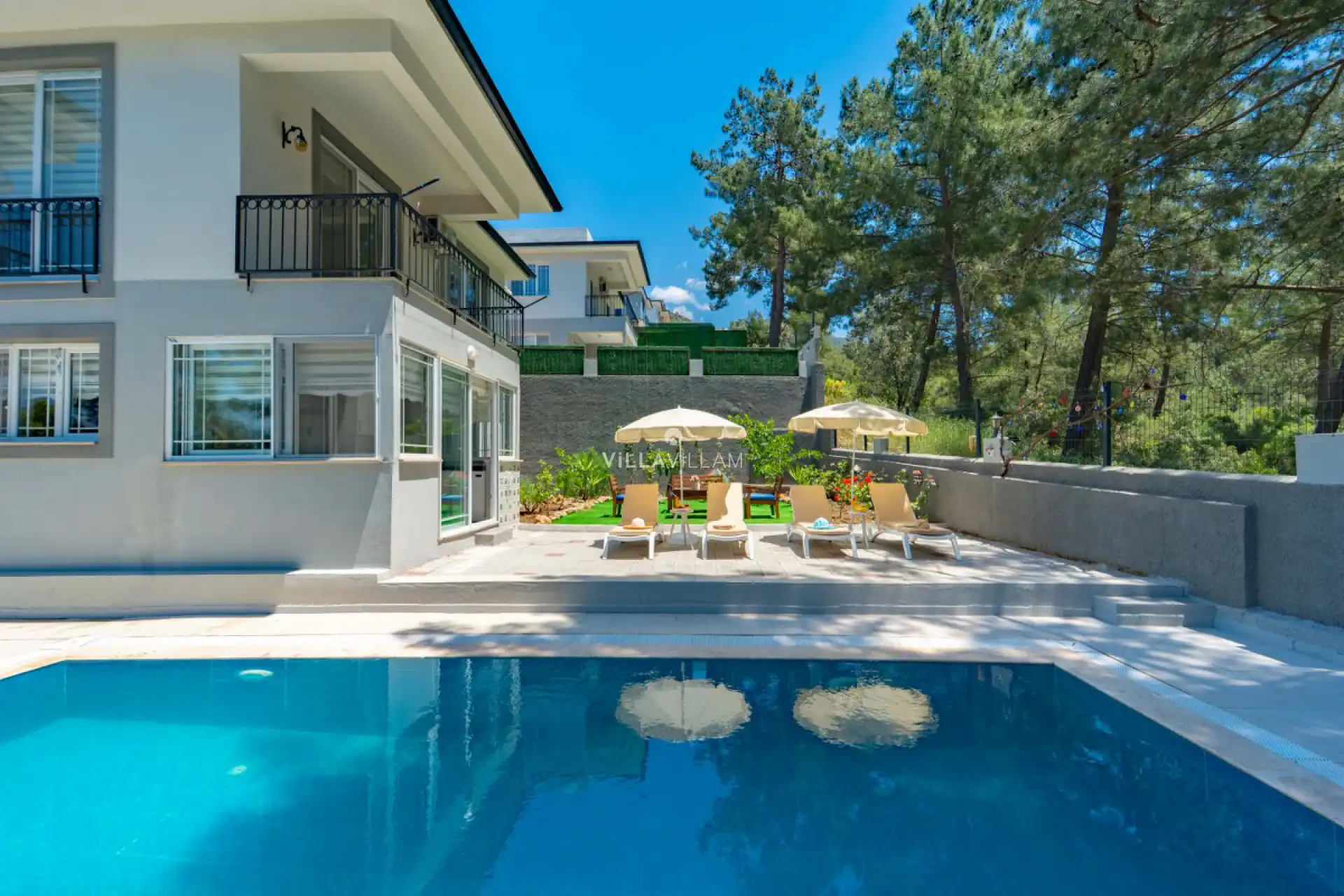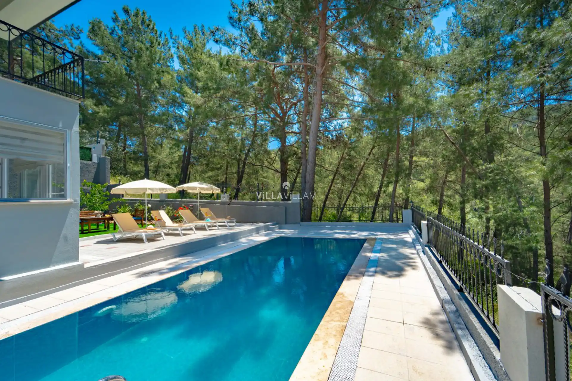 Modern ve bir o kadar da zarif iç ve dış dizayna sahip villamız oldukça geniş bir havuza sahiptir. Bahçe mobilyalarından iç mekana kadar konforun ön planda tutulduğu villamız unutamayacağınız tatil anılarınızın yeni adresi olmaya adaydır, birinci yatak odasında çift kişilik yatak ve banyo; ikinci yatak odasında iki adet tek kişilik yatak; üçüncü yatak odasında bir çift kişilik yatak; dördüncü yatak odasında bir çift kişilik yatak ayrıca 2 adet ortak banyo bulunmaktadır.