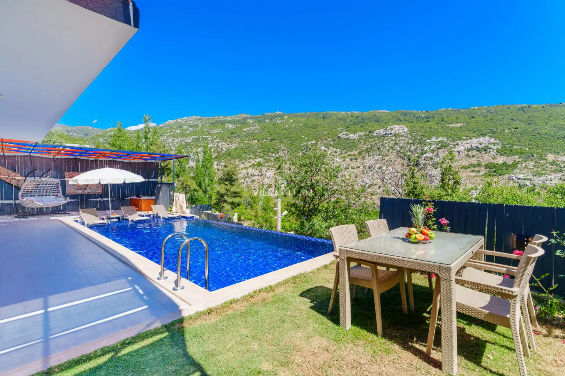Kalkan’ın muhteşem doğasında kendinizi doğanın iyileştirici gücüne bırakabilir ve tüm yılın yorgunluğundan arınabilirsiniz. Tertemiz gökyüzü ve yeşilin her tonuyla karşı karşıya kalacağınız terapi gibi bir tatil sizleri beklemektedir. Özenle döşenmiş bahçe ve havuz alanı ile en özel tatil anılarınıza ev sahipliği yapacak villamız, geniş havuz alanı sayesinde kendinizi özel hissedeceğiniz bir tatil imkânına sahiptir. Konforunuz göz önünde bulundurularak dizayn edilmiş, geniş ve modern tasarıma sahip villamızın birinci yatak odasında çift kişilik yatak ve banyo; ikinci yatak odasında ise iki tek kişilik yatak bulunmaktadır.