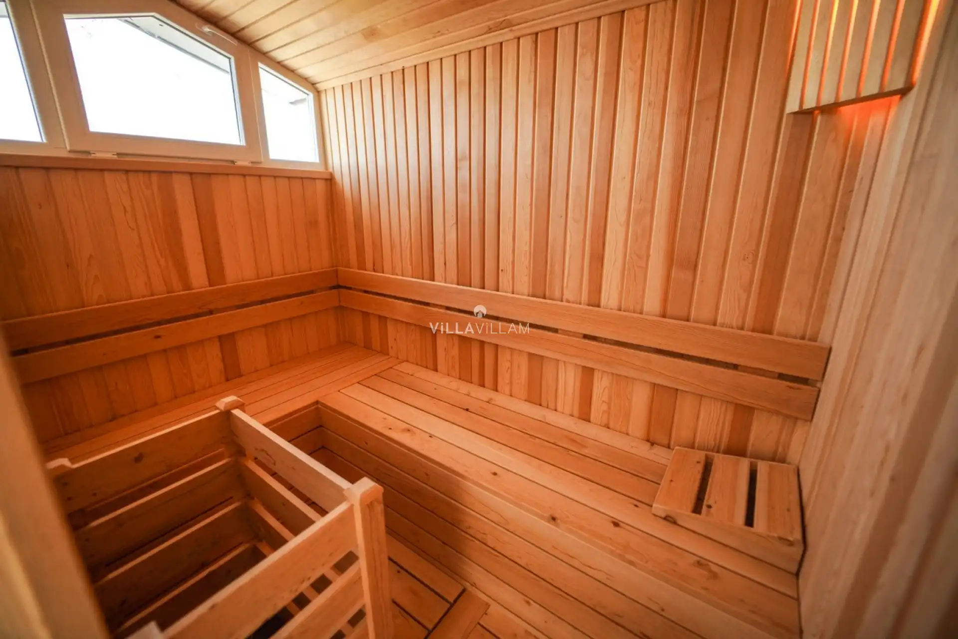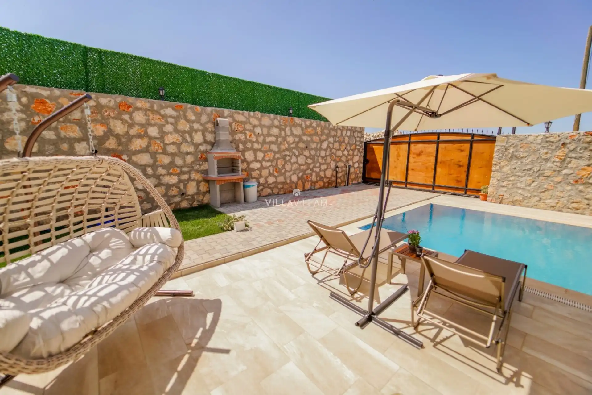 Geniş havuz terasında kapasiteye uygun şezlong takımı, oturma grubu, salıncak ve barbekü alanı bulunan villada, rahat bir tatil için her detay düşünülmüştür. Yine havuz terasına açılan konforlu oturma odası ve tam donanımlı açık mutfağı; üç yatak odasında çift kişilik yatak, ebeveyn banyosu; dördüncü yatak odasında çift kişilik yatak, ebeveyn banyosu ve jakuzi bulunmaktadır.