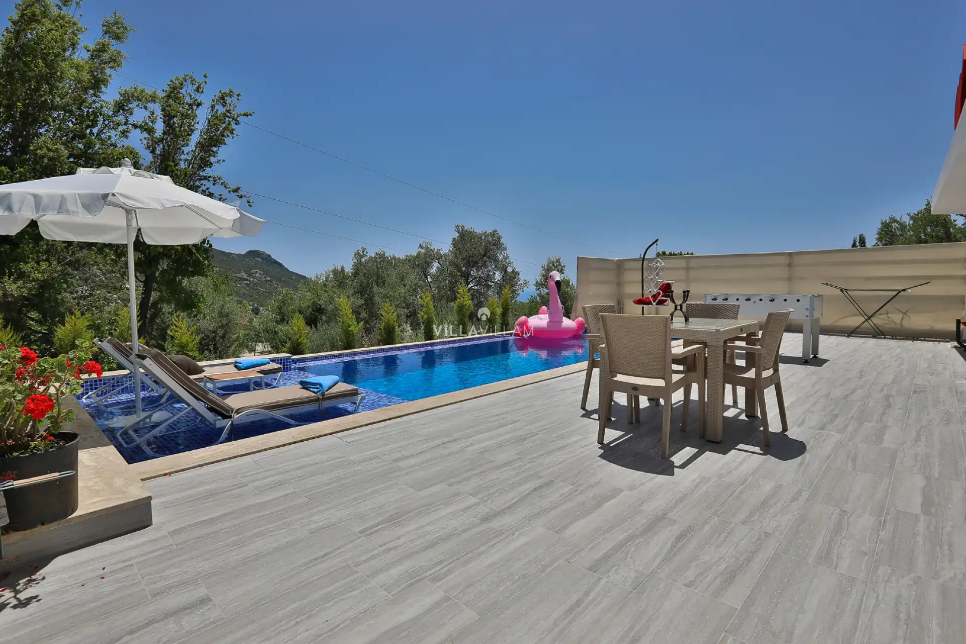 Korunaklı havuz alanına sahip olan villanın doğa içinde konumu sayesinde oksijene doyabileceğiniz, sakin bir tatil sizleri beklemektedir. Havuz terasında kapasiteye uygun şezlong takımı, oturma grubu, barbekü alanı bulunmaktadır. Doğa içinde huzurlu konumunuyla, sizlere keyifli bir tatil için kapı aralamaktadır. Geniş havuz terasına açılan konforlu oturma odası donanımlı açık mutfağı bulunan villanın bir yatak odasında çift kişilik yatak, ebeveyn banyosu ve jakuzi; diğer yatak odasında iki tek kişilik yatak ve ebeveyn banyosu bulunmaktadır. Ayrıca sinema odası da bulunan villada, konforlu bir tatil için her detay düşünülmüştür.