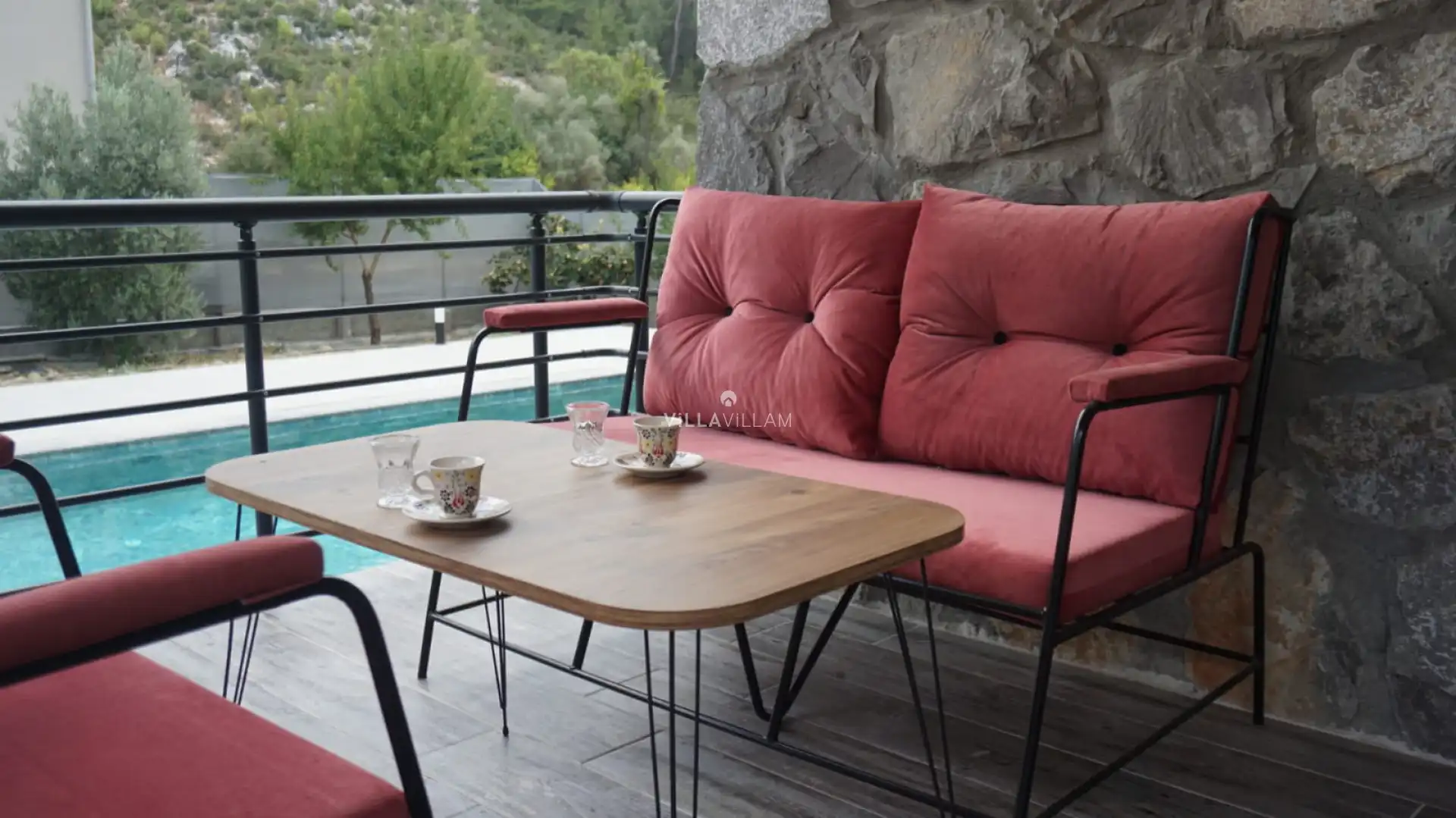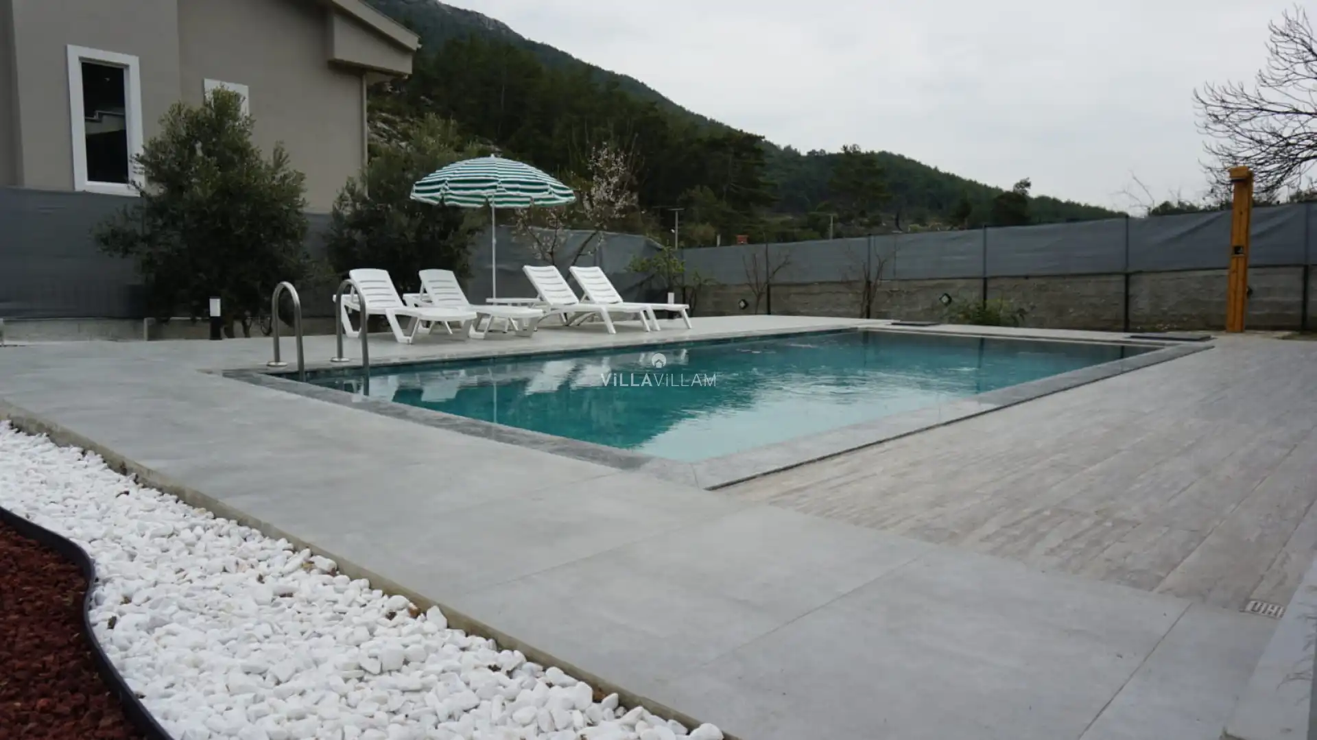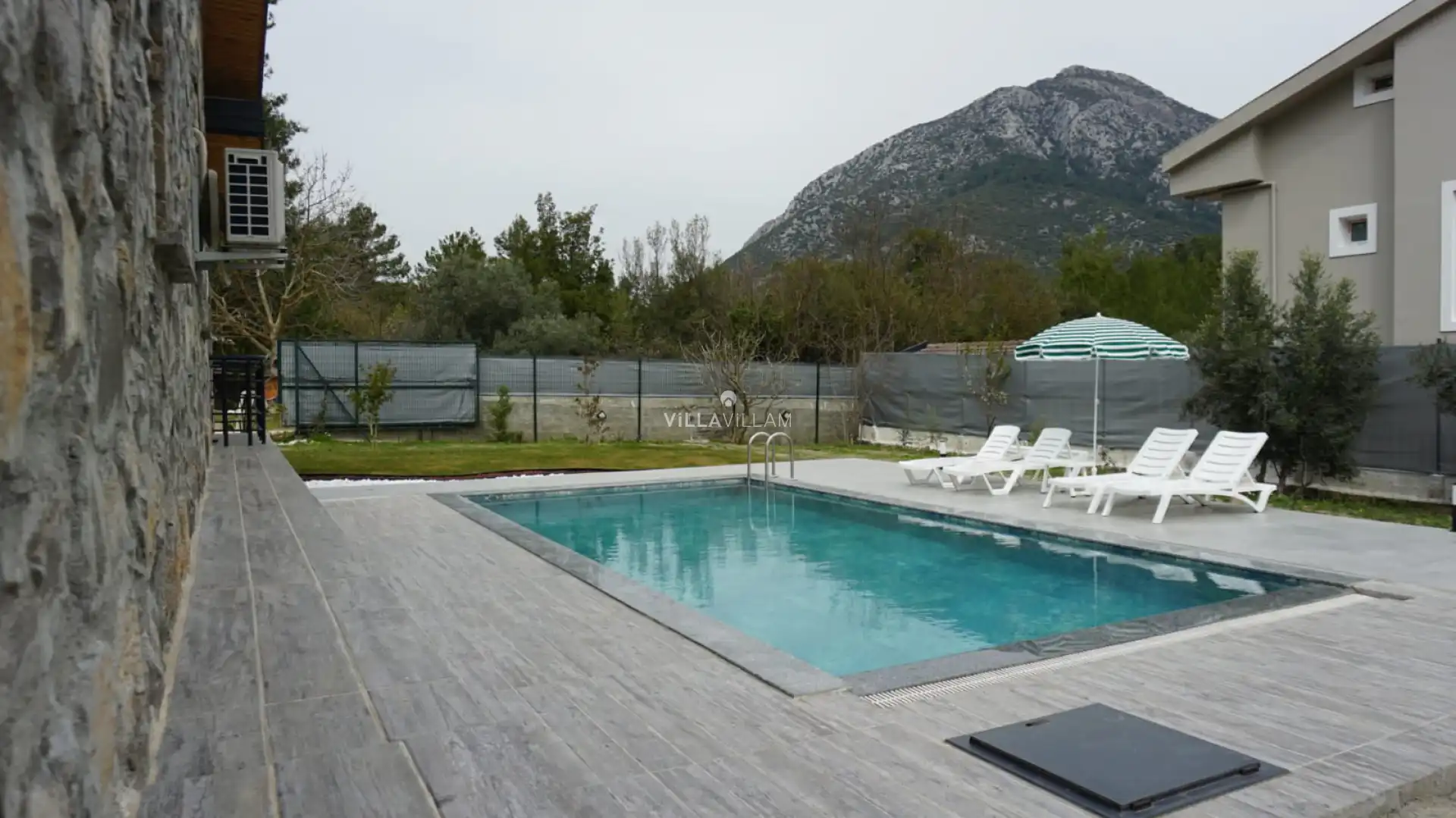 Temiz havanın, gökyüzünün ve güneşin hiç eksilmediği havuz ve bahçe alanında bitmesin isteyeceğiniz bir tatil sizleri bekliyor, Şehirden uzak sakin tatil arayan misafirerimizin tam olarak aradığı bulacağı kriterlere ve olanaklara sahip villa, doğayla iç içe konumu ve tatinize renk katacak havuz terasında şezlong takımı, salıncak, oturma grubu ve barbekü alanı ile keyifli bir alana sahiptir.Konforlu oturma odası ve donanımlı mutfağı;iki yatak odasında çift kişilik yatak, ve ebeveyn banyosu bulunmaktadır